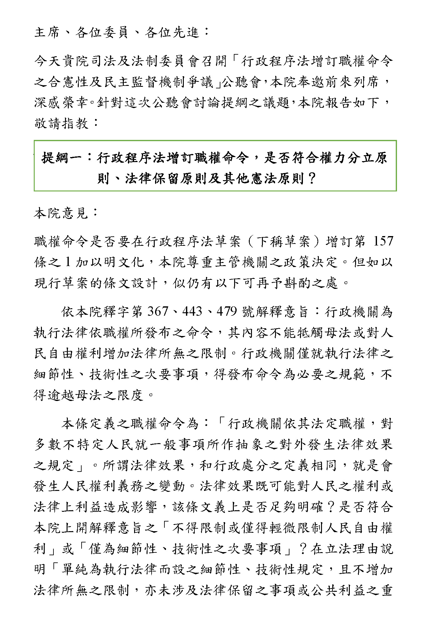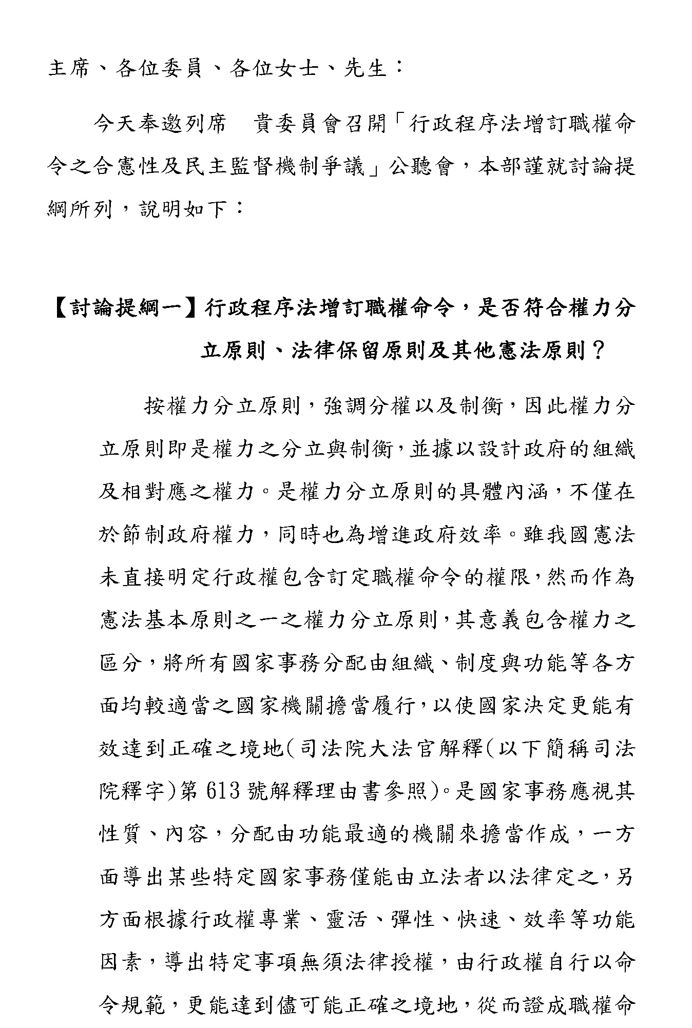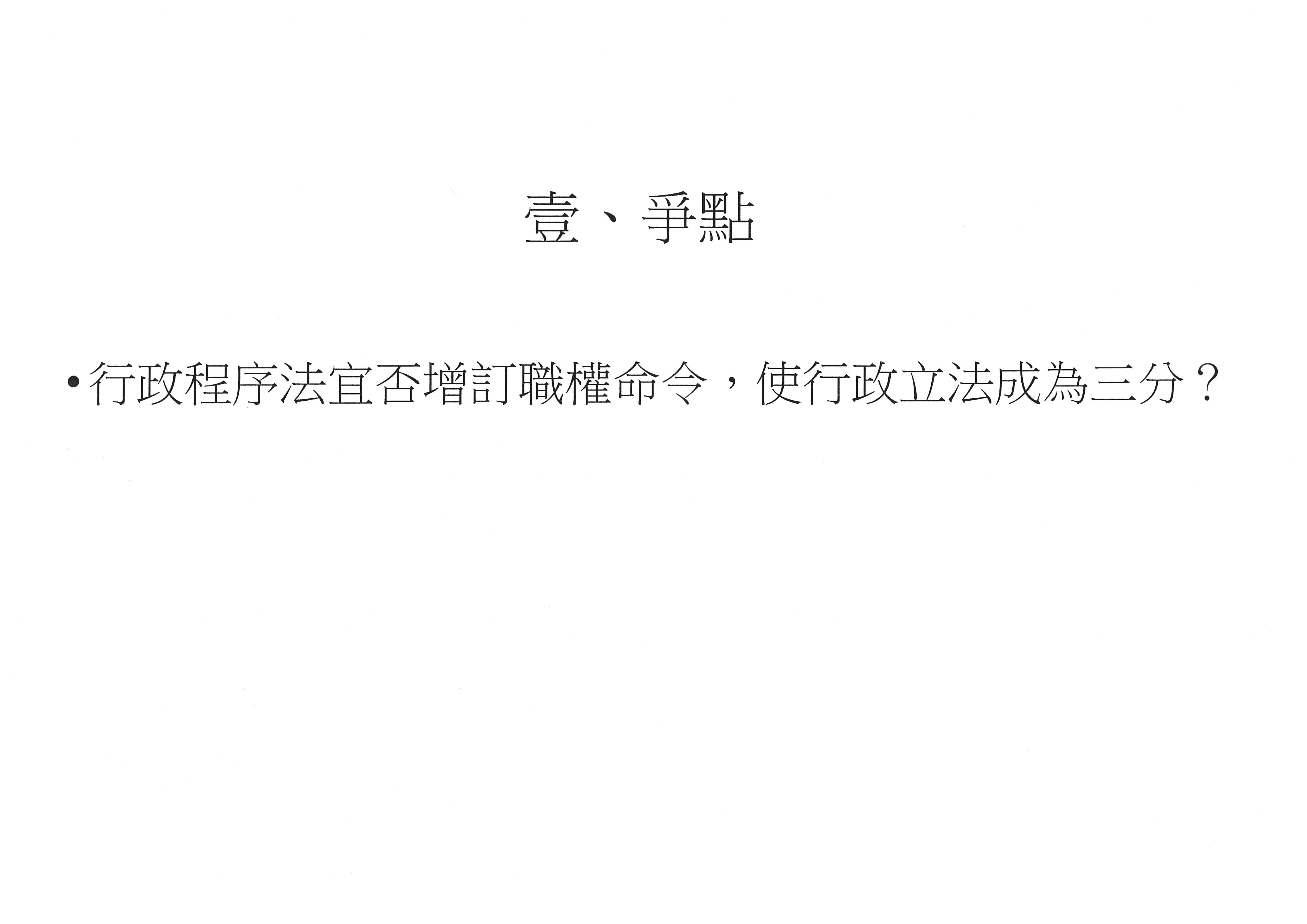 首先,針對提綱一,行政程序法增訂職權命令,有沒有符合權力分立原則、法律保留原則……