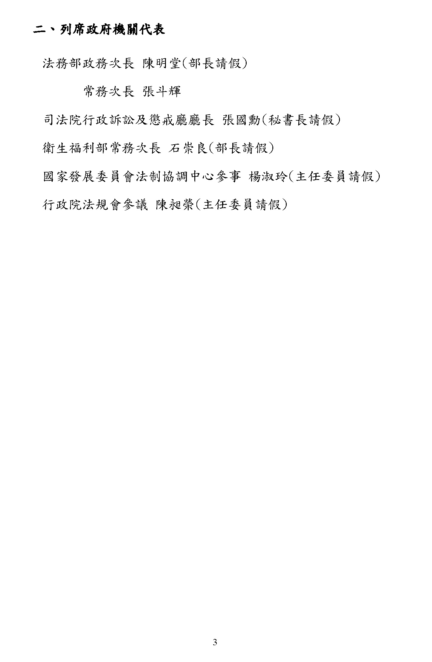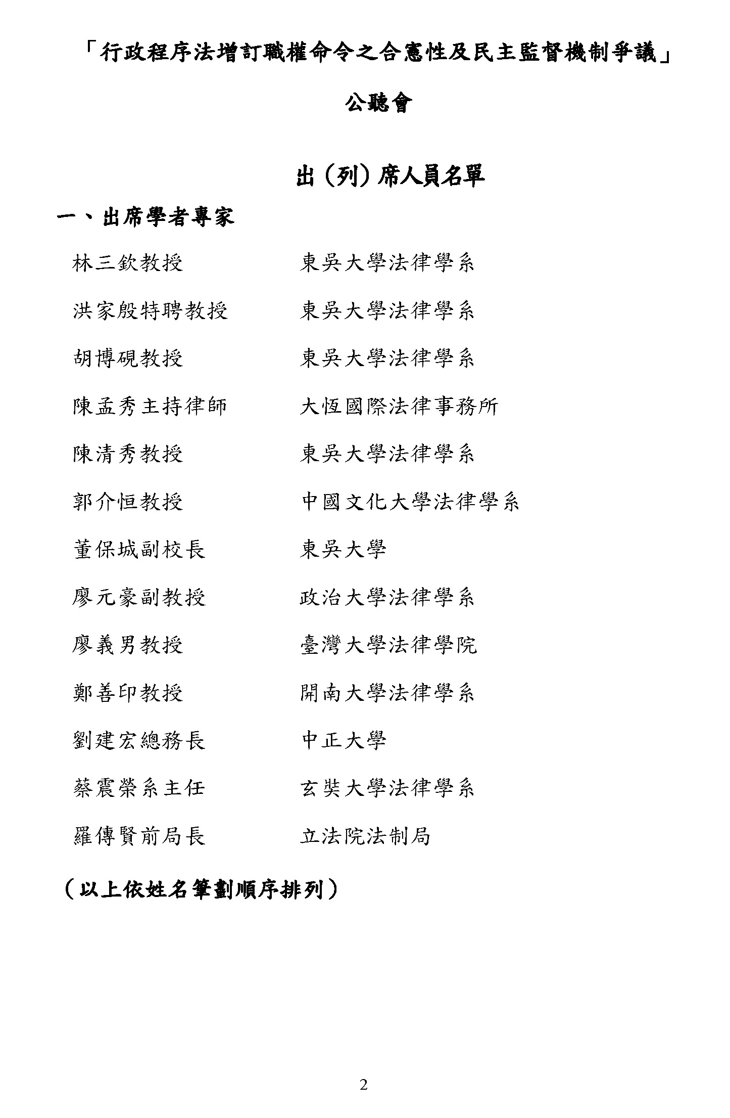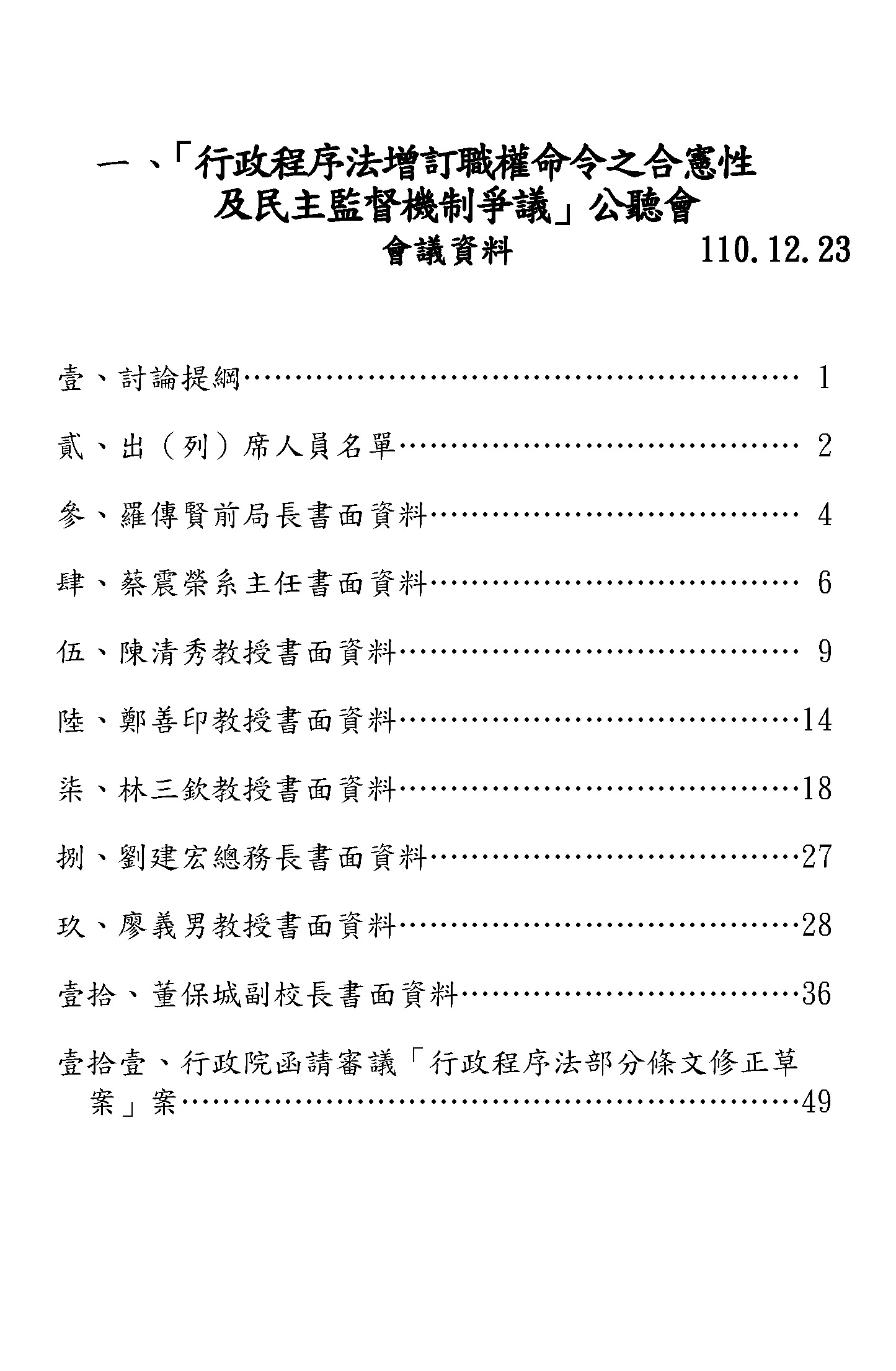 主席:現在開始開會。今天舉行「行政程序法增訂職權命令之合憲性及民主監督機制爭議」公聽會,請議事人員宣讀討論提綱。