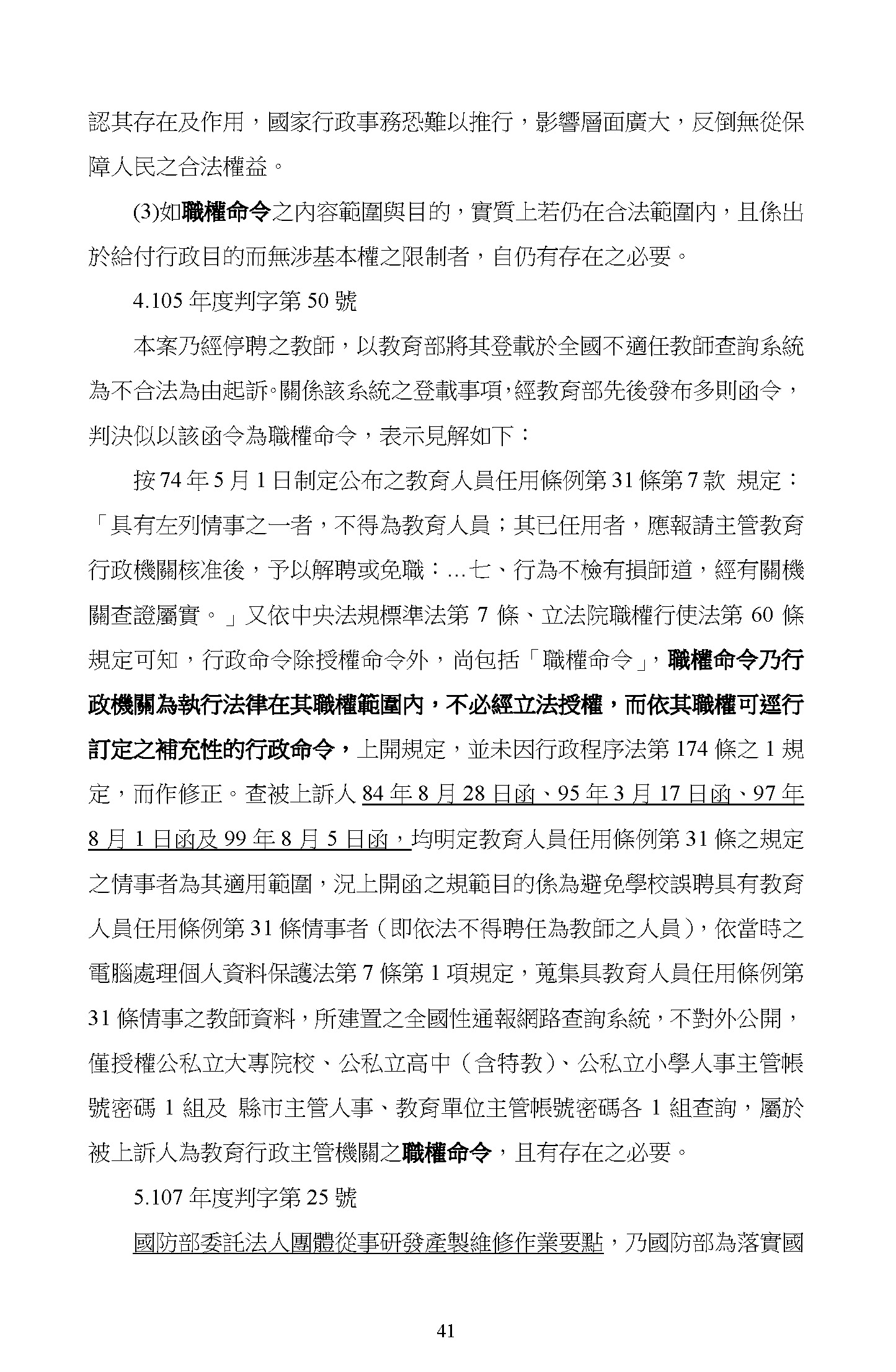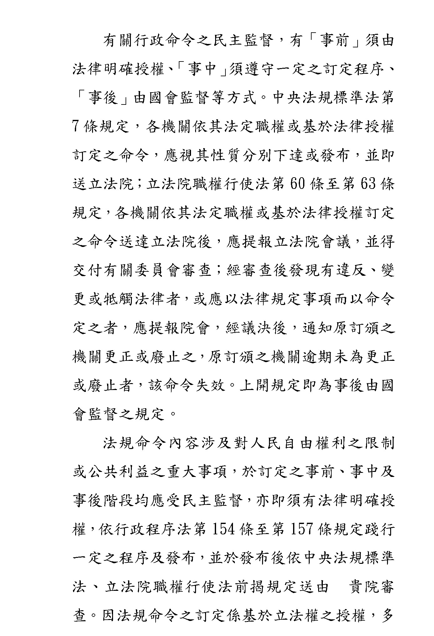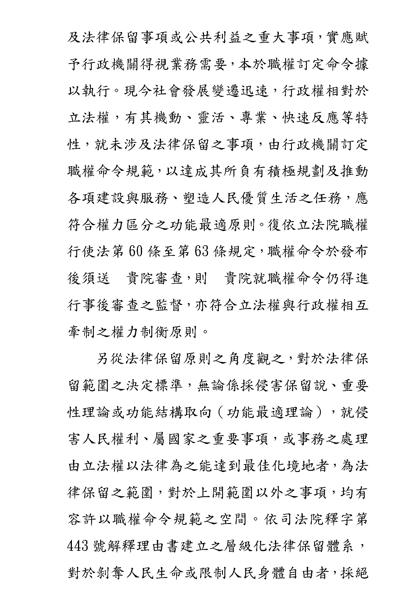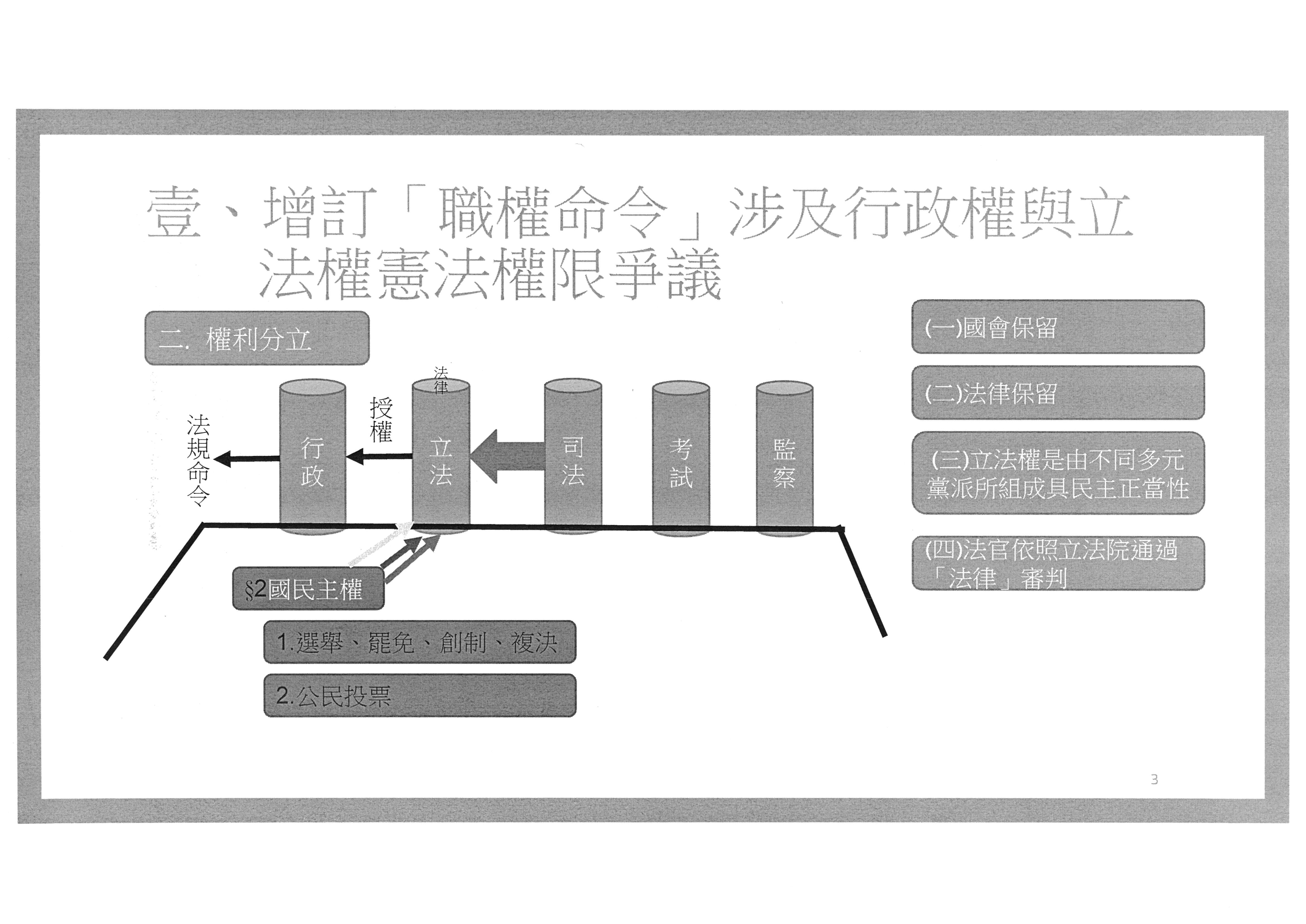 另外補充一點,權力分立裡面其實還有司法審查這一塊,職權命令既然不是法律也不是法律授權,法官也不受拘束,將來在司法審查的時候,原則上法官可以不採用,所以司法審查在事後也會發生一定的制衡效果。