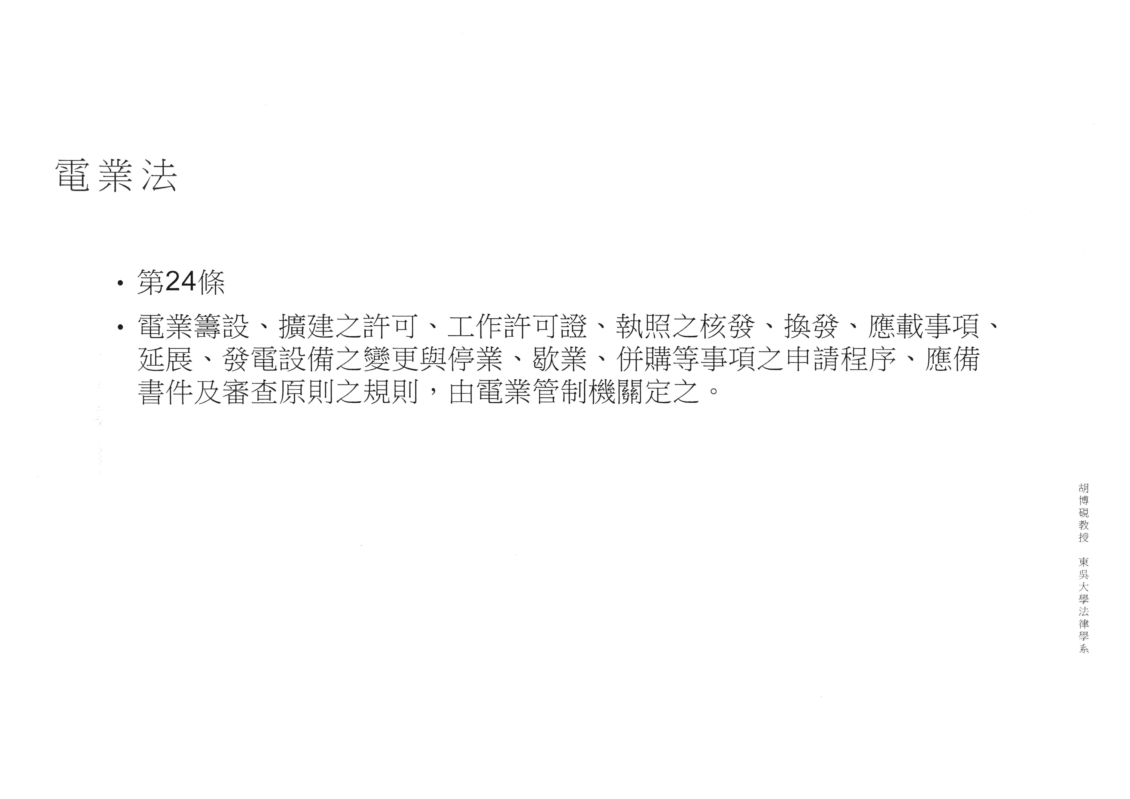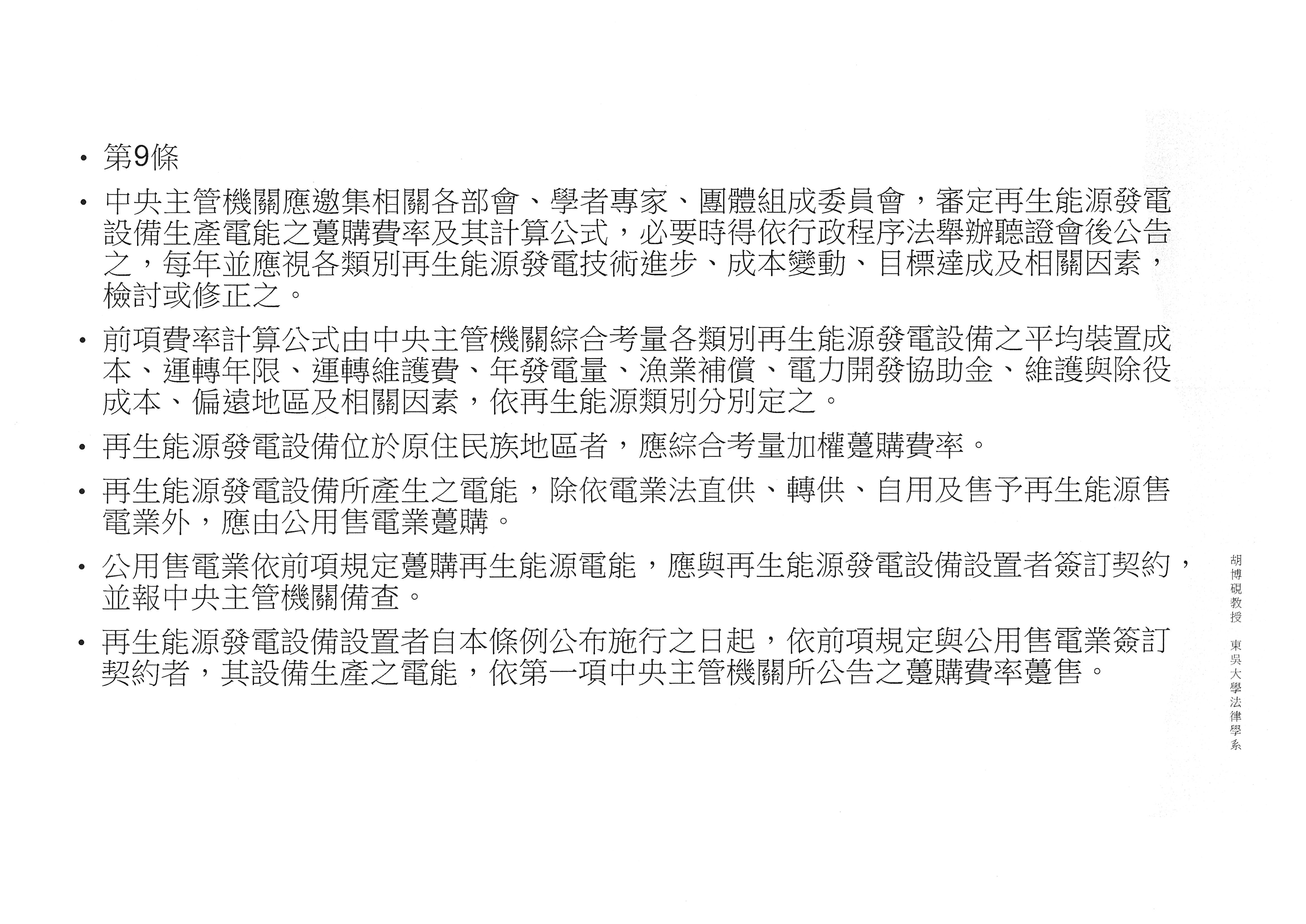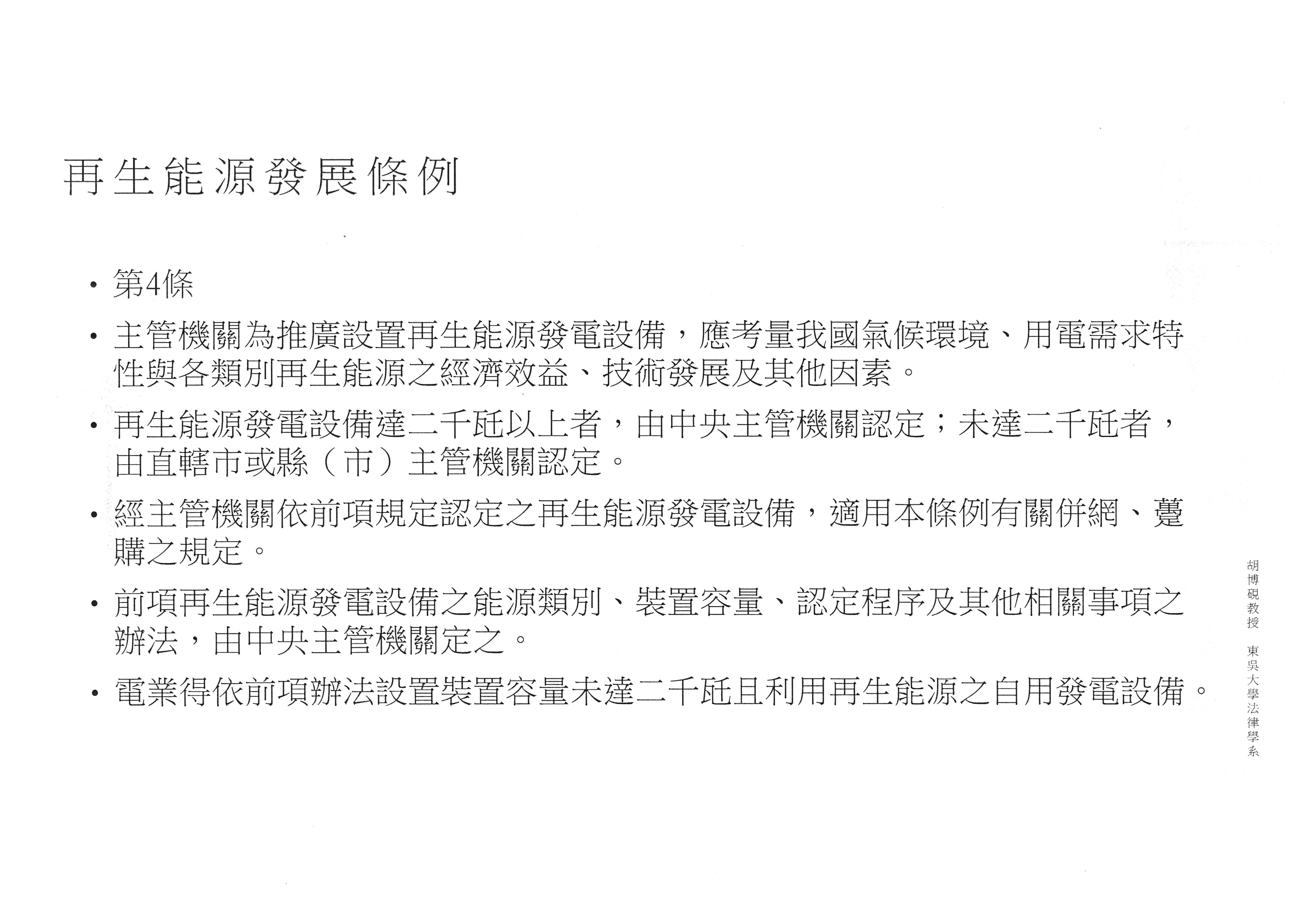 所以這就是一個尷尬的問題,這個問題其實有兩個要點,一個是離岸風力發電規劃場址申請作業要點,一個就是剛剛的分配要點,分配要點的第一點當中,其實經濟部後來也回說有授權。因為你看,第一條當中寫到是要執行再生能源發展條例第四條及第九條、再生能源發電設備設置管理辦法第五條及電業法第二十四條規定,特訂定本要點。如果我們來看的話,這兩條有沒有給它?有啊!再生能源發展條例當中真的是有,像第四條就寫再生能源類別、裝置容量部分由中央主管定之;第九條也一樣,第二項有關費率的問題由它來定之。電業法第二十四條寫到電業籌設、許可的部分,基本上是要由它來定之。所以這幾個條例當中,原則上都有授權。到底有沒有授權?看起來應該都是有授權啦!就是可以訂定有關電業許可相關的法規命令,但是有授權,為何要訂定成行政規則?就是有授權給你,你應該要訂定成法規命令,我覺得這個其實在立法院要注意,就是有授權給你,是要你去訂定,不是你想訂定就訂定、不想訂定就不要訂定,而是要你訂定;不然你不訂定,我就自己去訂定就好了,我覺得那個太細部讓你訂定嘛!