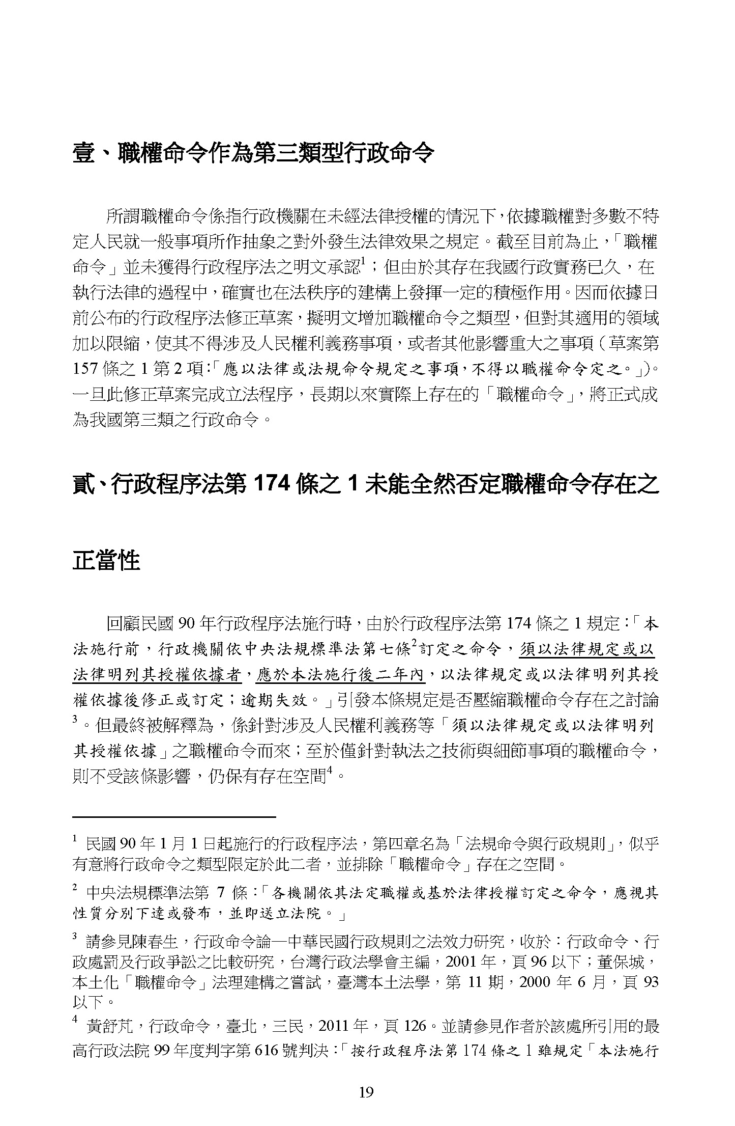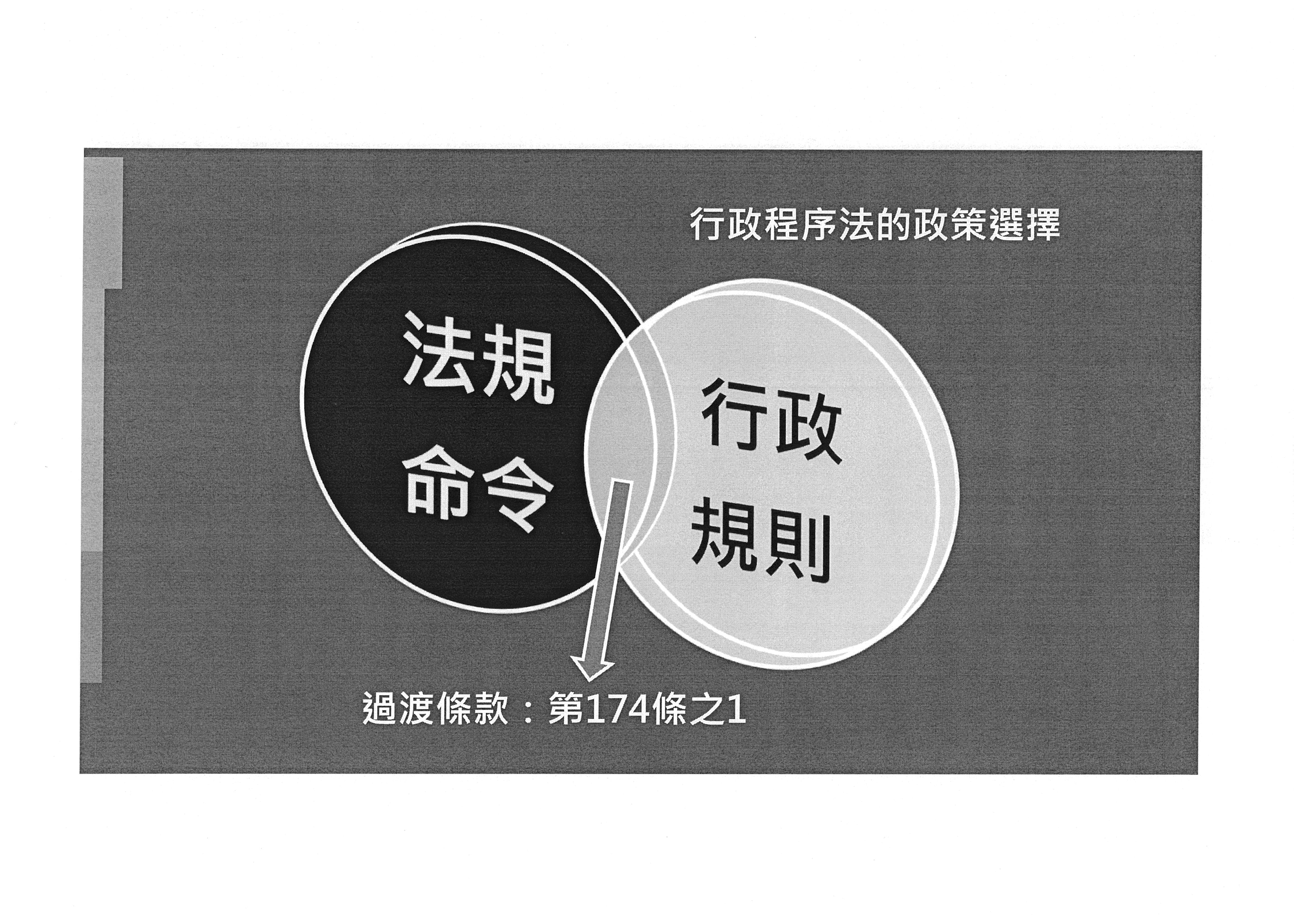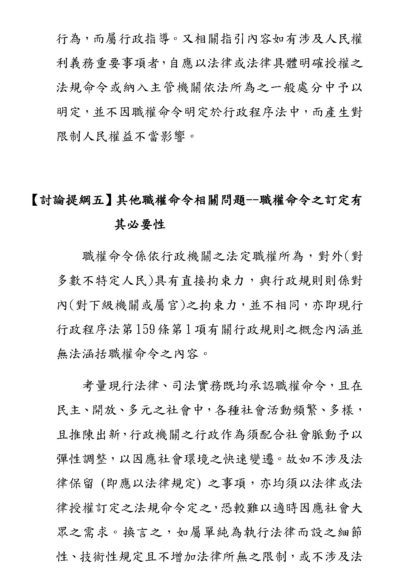 因此在不違反大法官法律保留的理念之下,我覺得將職權命令提出來剛好可以把這塊補上去,而且實際上有這個需求,但我們無視這個需求,而希望用原來的行政程序法第一百七十四條之一規定把它限制住、全部排除掉,事實上我們已經做了二十年但做不到,那麼對於做不到又需要存在的東西,我認為應該予以正視、把它納入規範,這可能是一個比較好的作法。