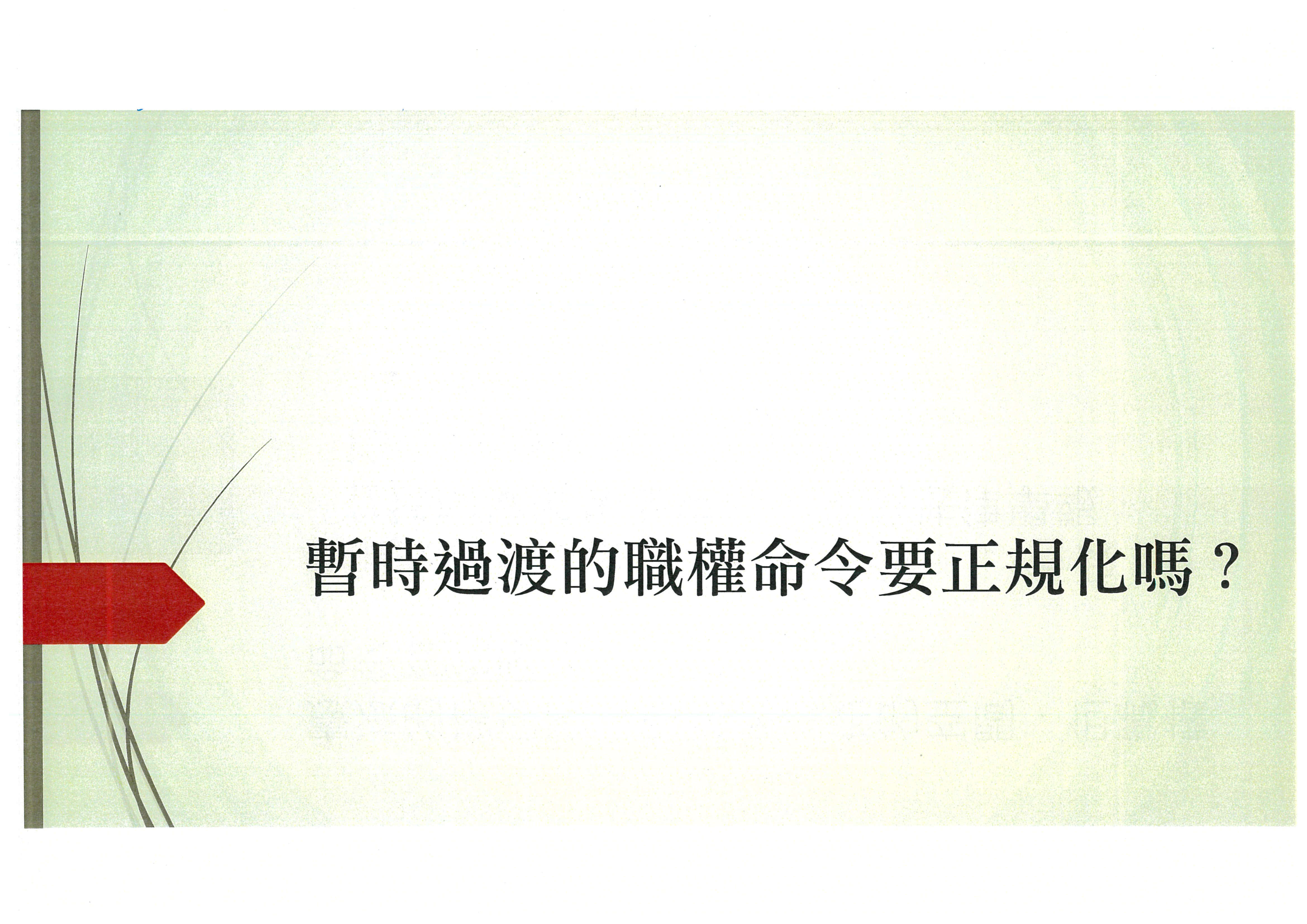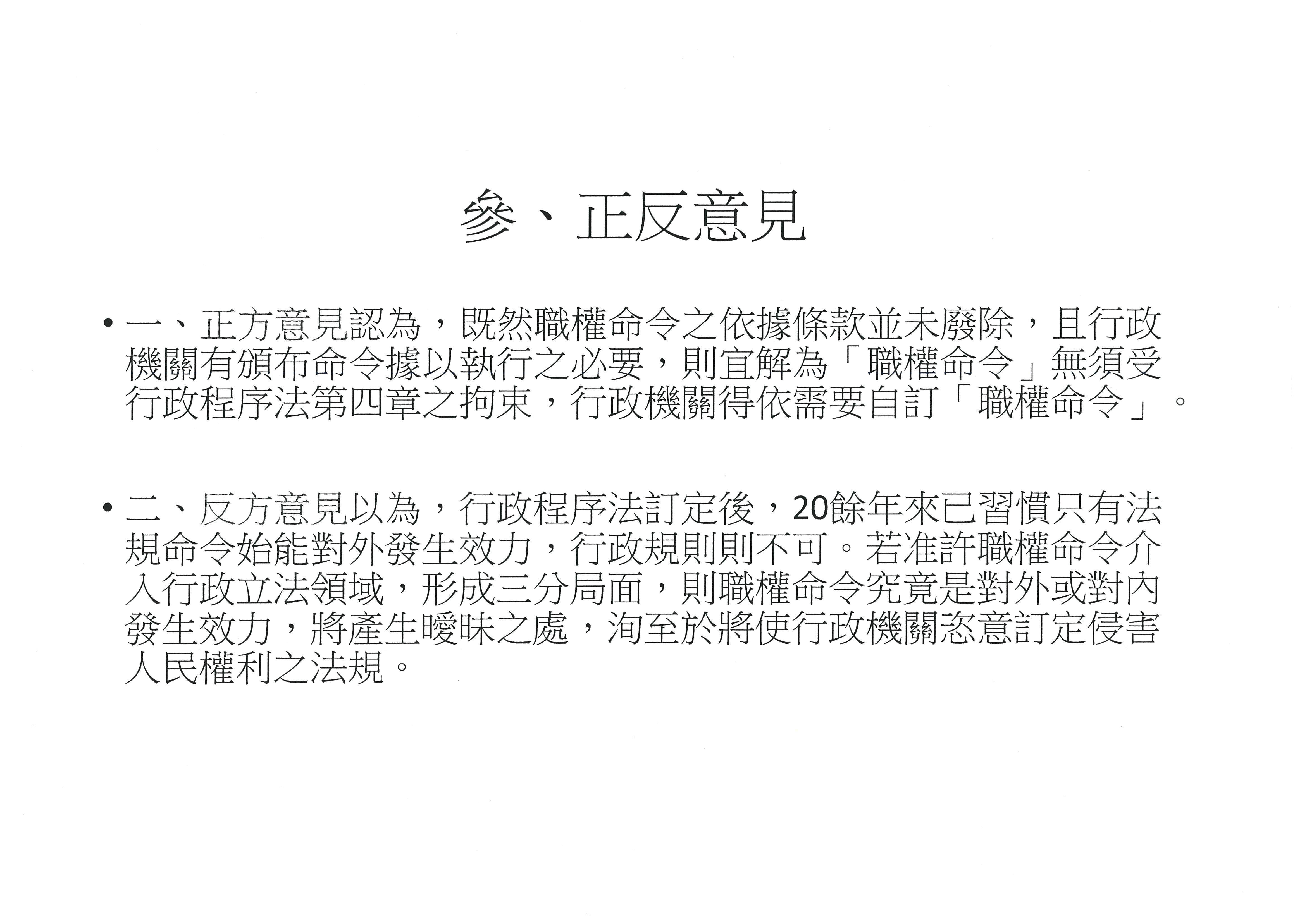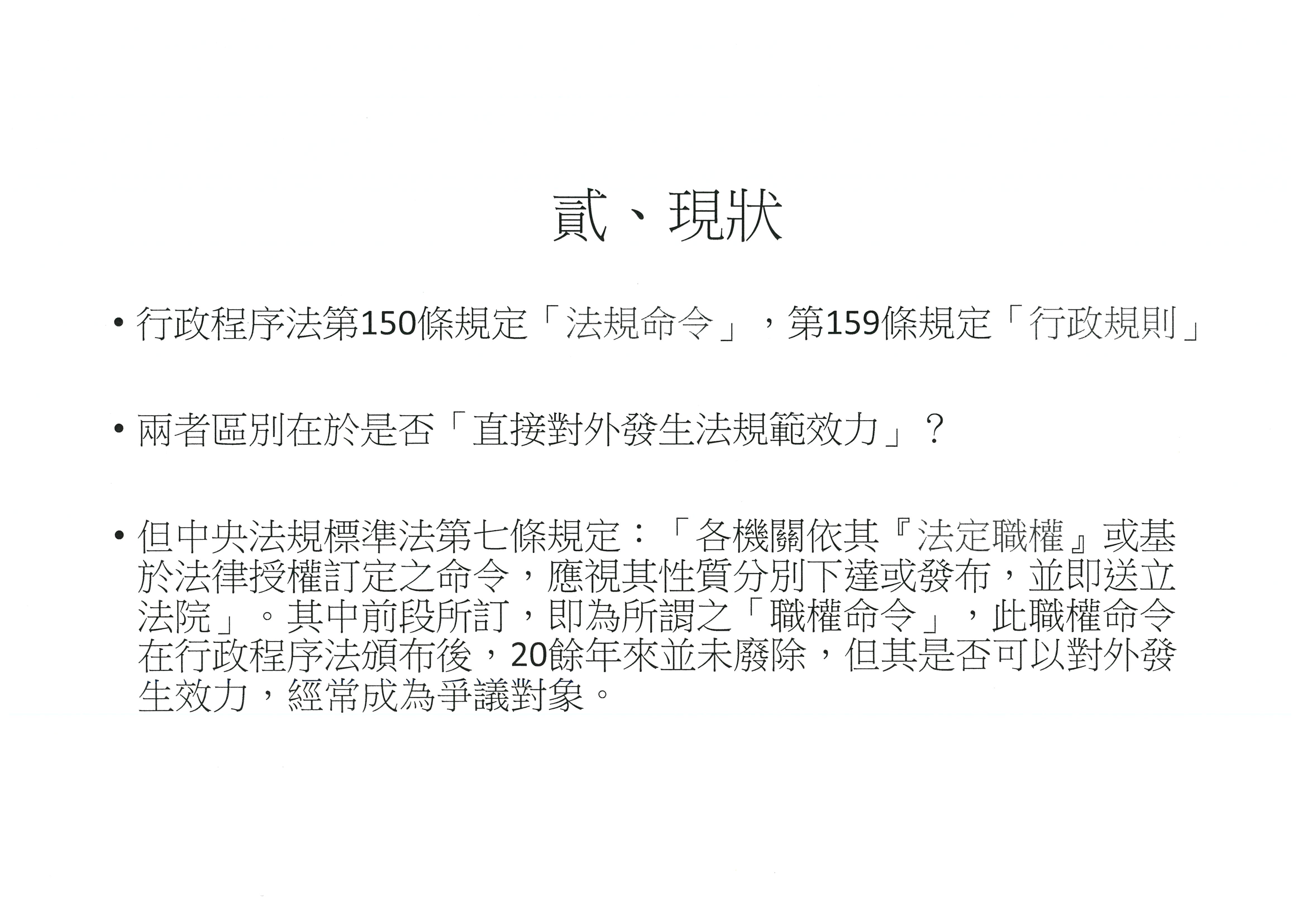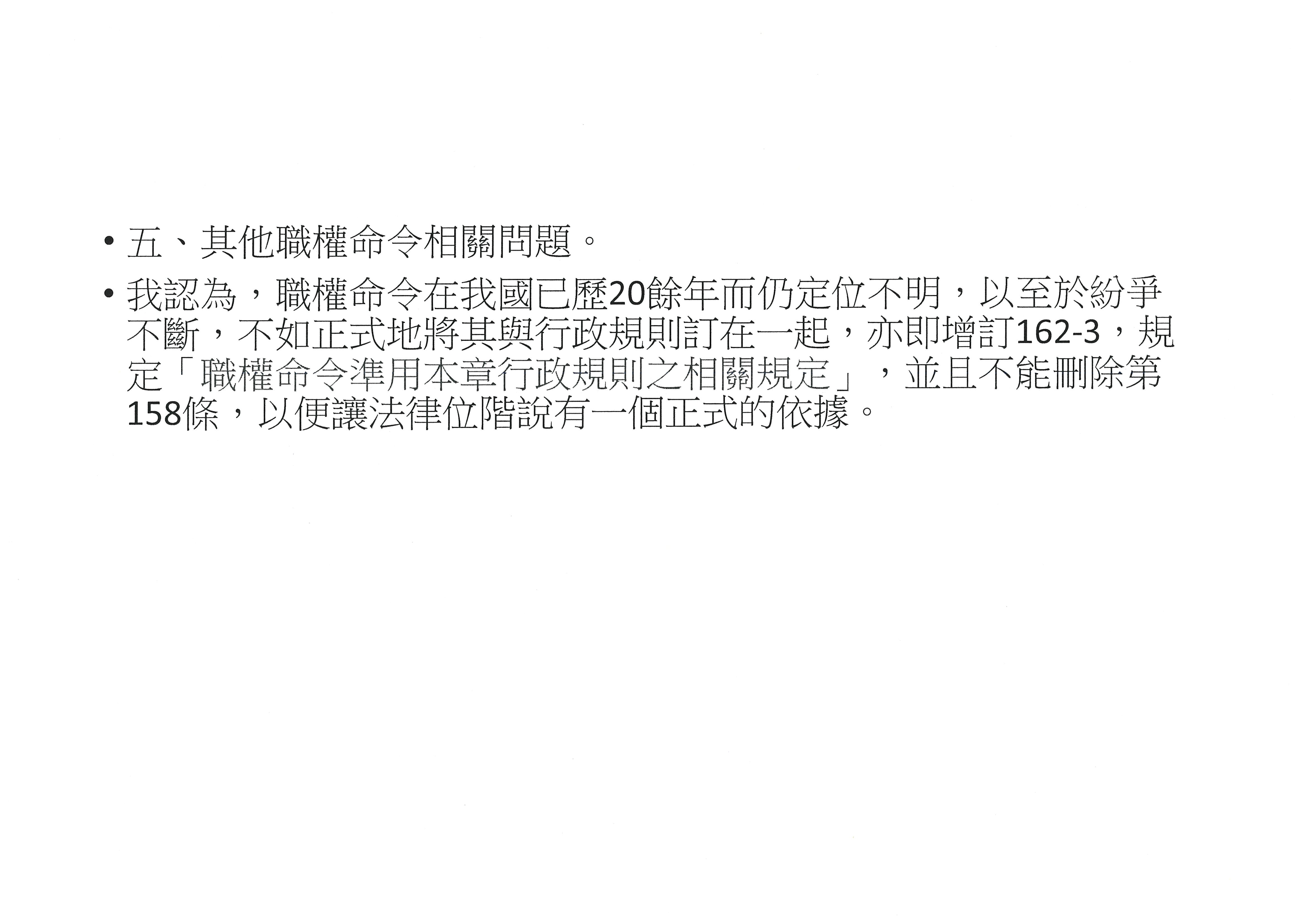 要解決職權命令的問題,我覺得最根本的作法是把這幾個相關的法令做整體性檢討,尤其中央法規標準法用這麼久了,現在還在用,聽說草案都有了,但就是沒辦法完成立法。因此我們今天處理這個問題,其實類似鋸箭法的方式,也就是好像有這個問題、有這些需要而將它提出來,但我相信這個問題也不會因為處理職權命令而得到完整的解決,可能最終還是需要一個比較大的法制化工程,在國內建立一個比較完整的行政命令體系。但在目前這種情況之下,既然沒有辦法做圓滿的解決,我們只能在既有框架下尋求解決之途。