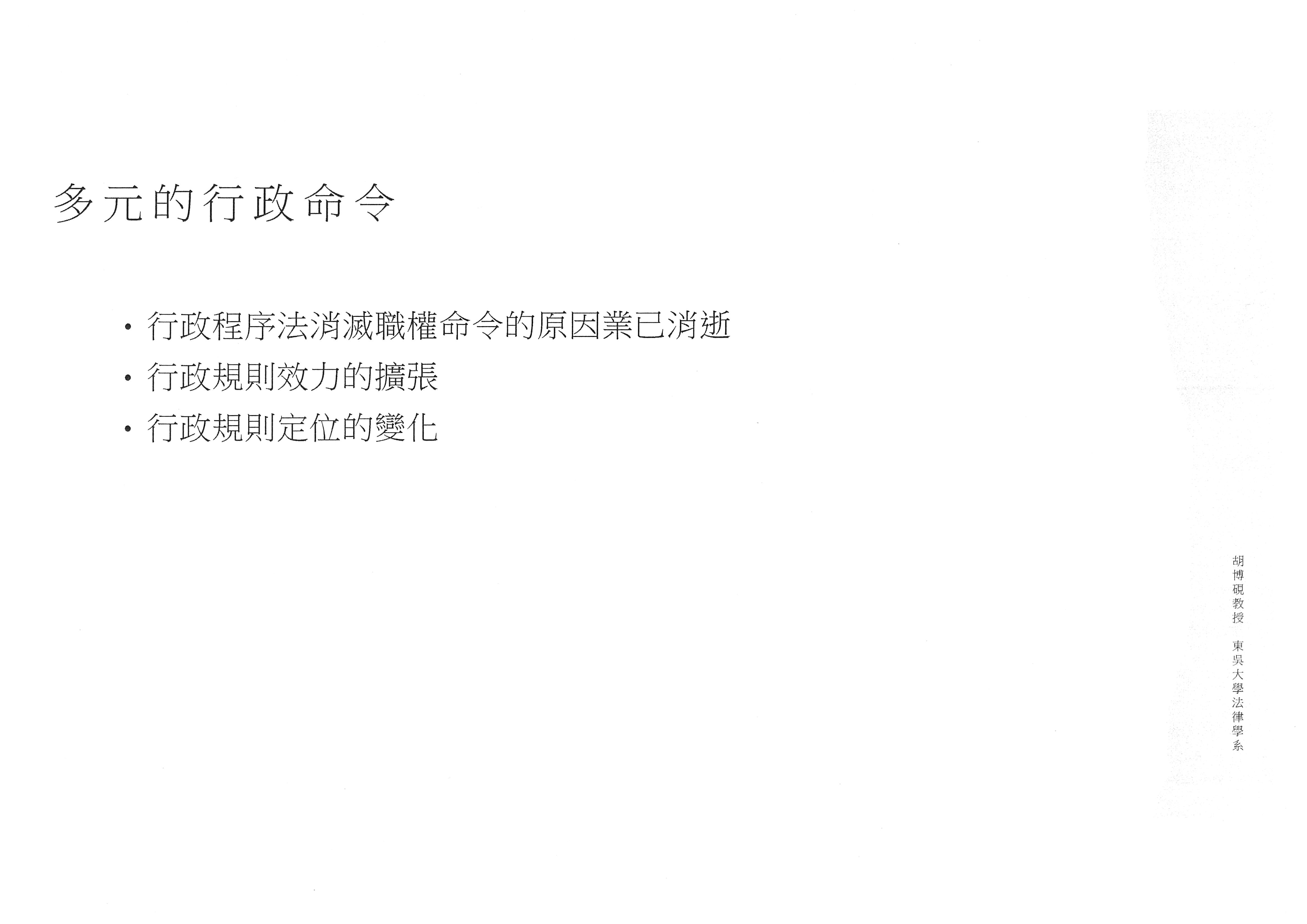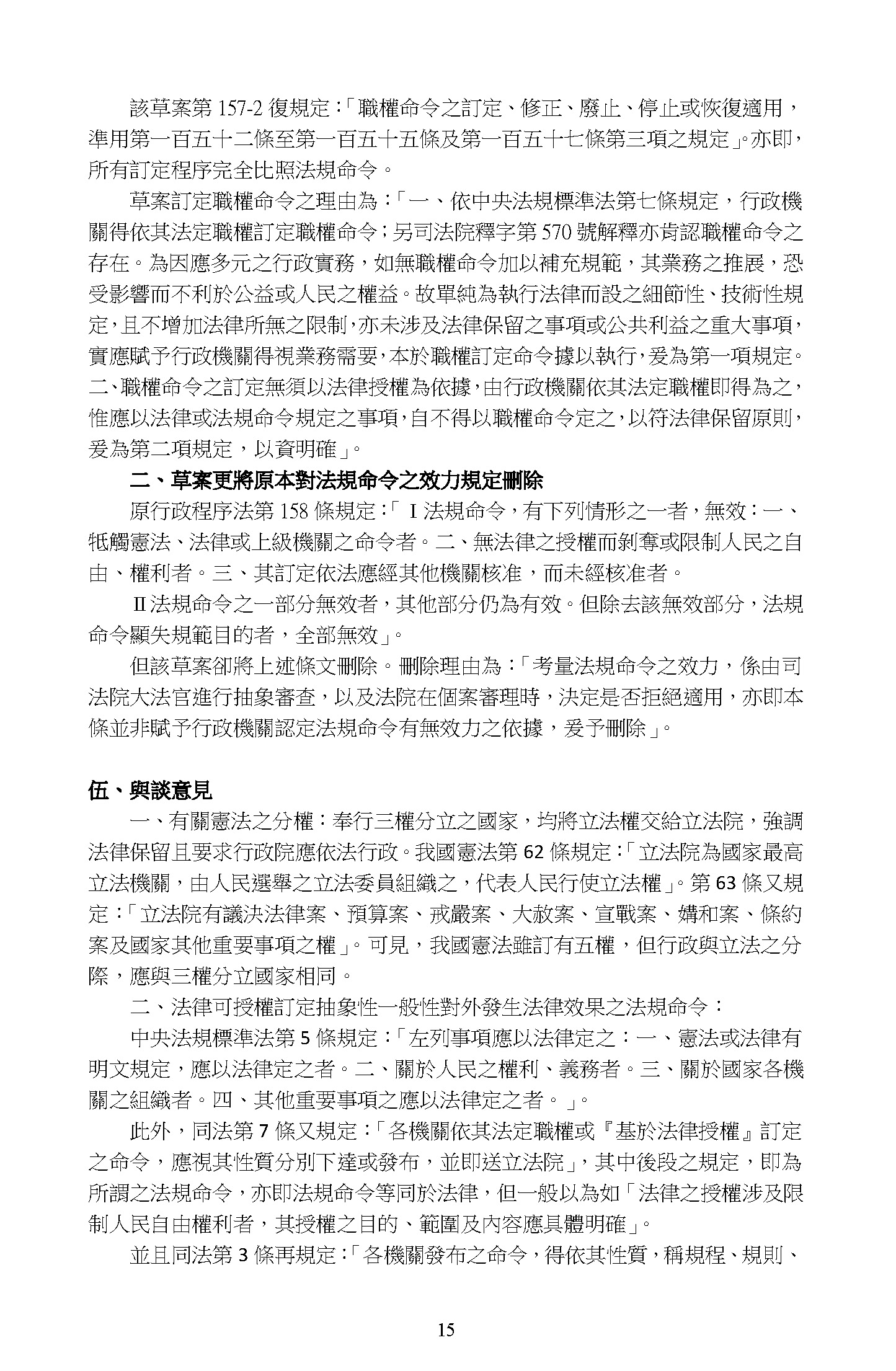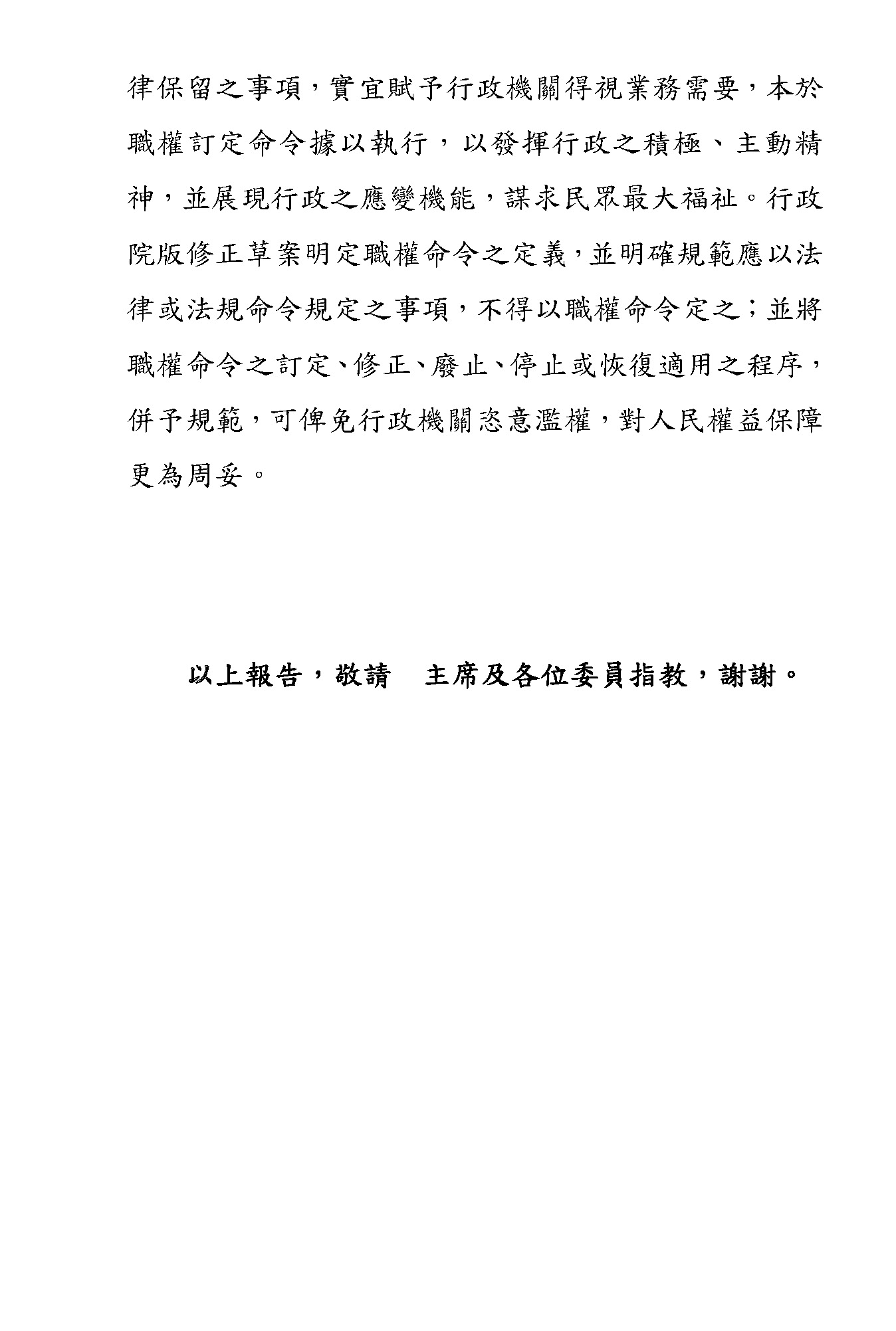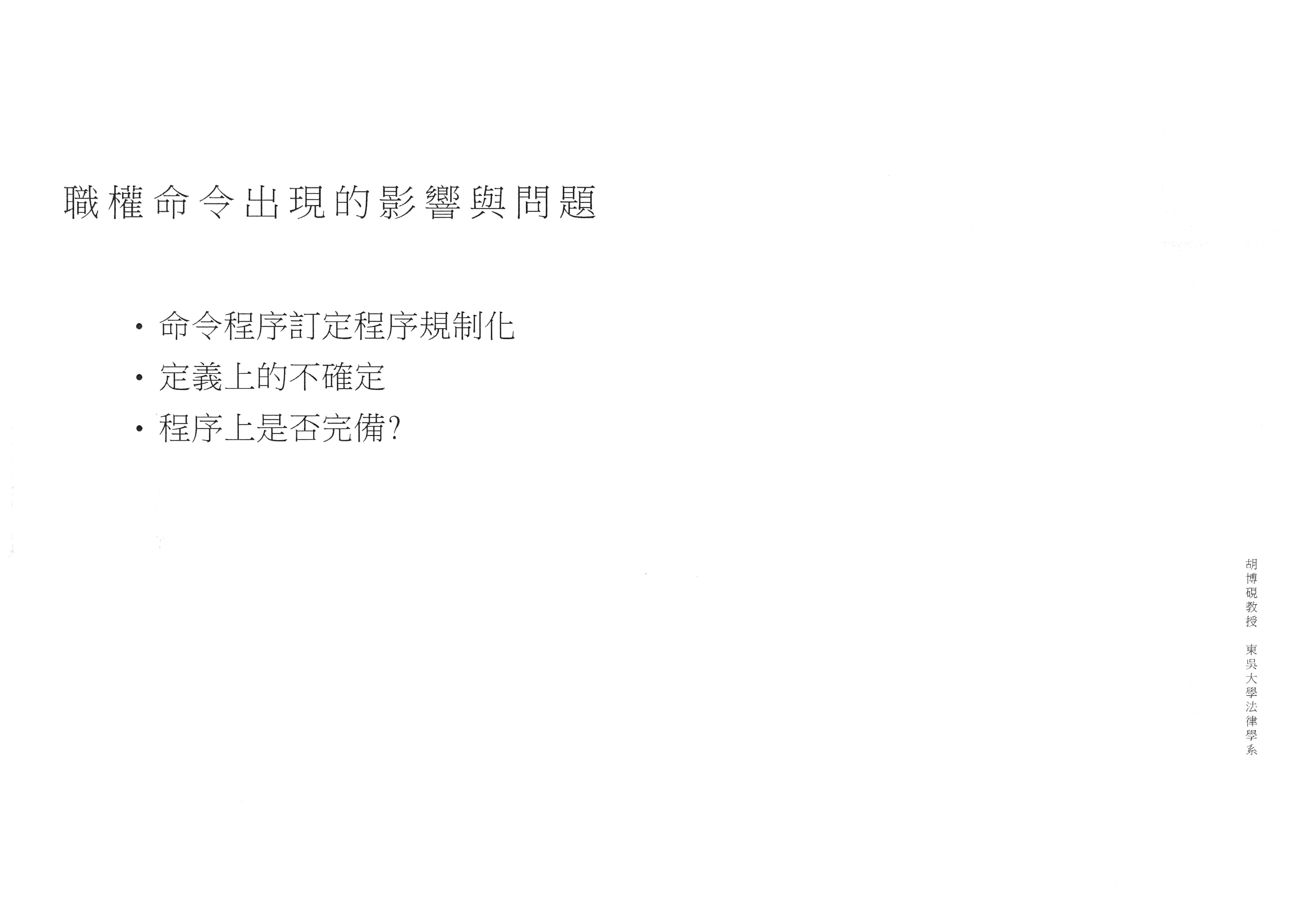要解決職權命令的問題,我覺得最根本的作法是把這幾個相關的法令做整體性檢討,尤其中央法規標準法用這麼久了,現在還在用,聽說草案都有了,但就是沒辦法完成立法。因此我們今天處理這個問題,其實類似鋸箭法的方式,也就是好像有這個問題、有這些需要而將它提出來,但我相信這個問題也不會因為處理職權命令而得到完整的解決,可能最終還是需要一個比較大的法制化工程,在國內建立一個比較完整的行政命令體系。但在目前這種情況之下,既然沒有辦法做圓滿的解決,我們只能在既有框架下尋求解決之途。