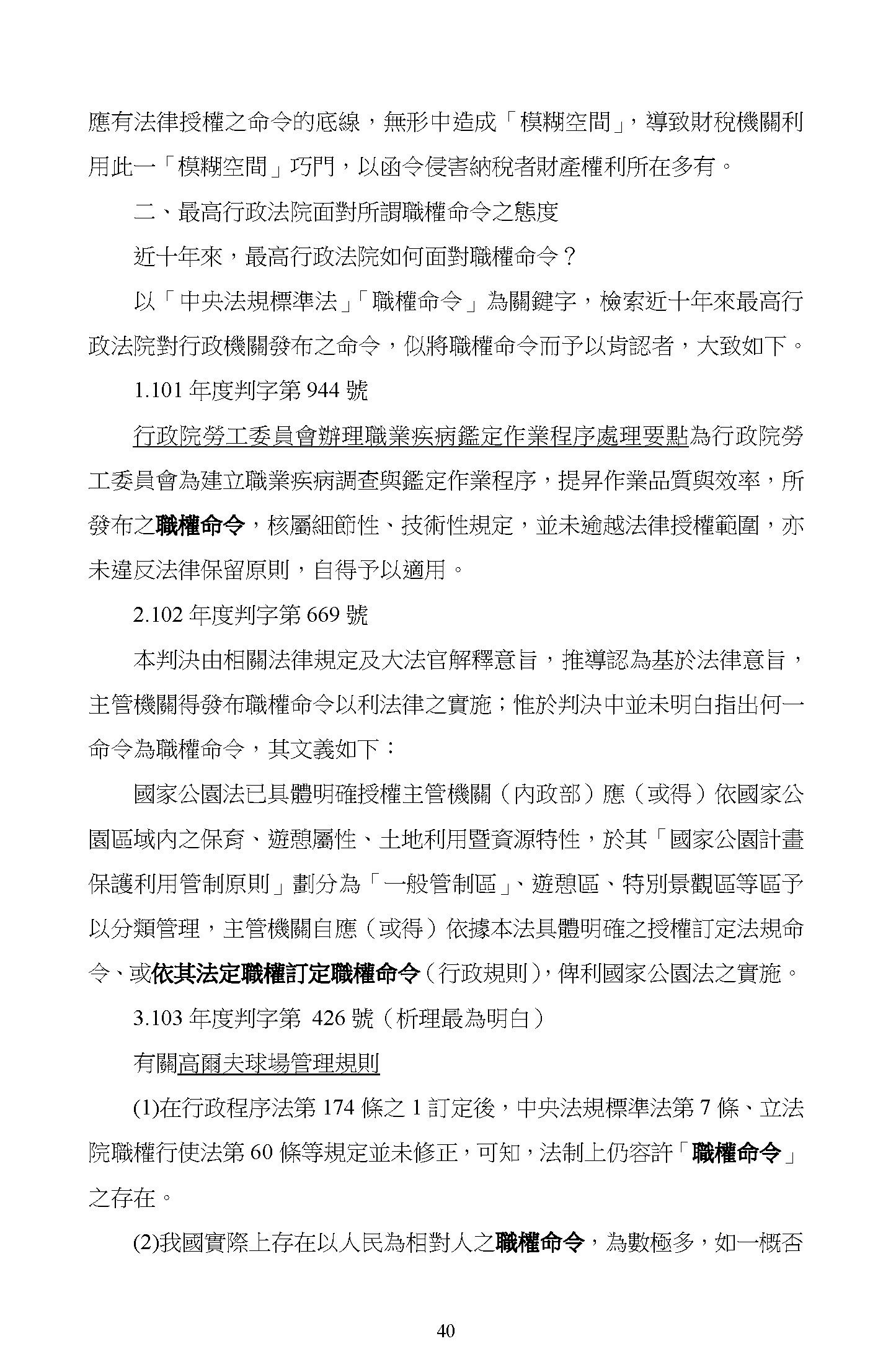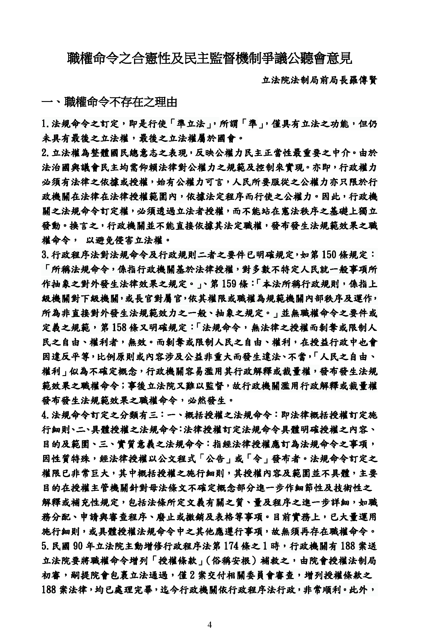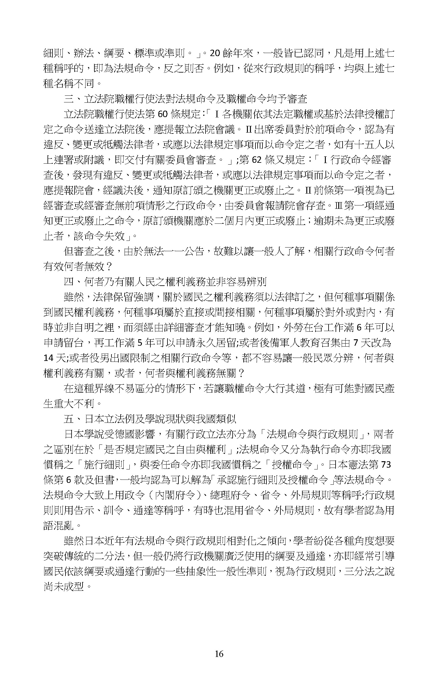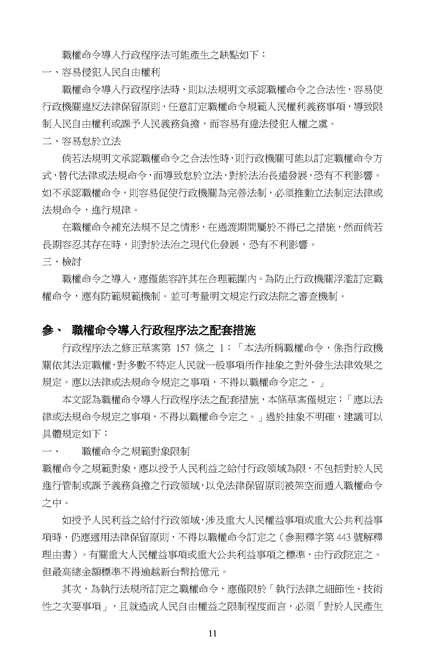 要解決職權命令的問題,我覺得最根本的作法是把這幾個相關的法令做整體性檢討,尤其中央法規標準法用這麼久了,現在還在用,聽說草案都有了,但就是沒辦法完成立法。因此我們今天處理這個問題,其實類似鋸箭法的方式,也就是好像有這個問題、有這些需要而將它提出來,但我相信這個問題也不會因為處理職權命令而得到完整的解決,可能最終還是需要一個比較大的法制化工程,在國內建立一個比較完整的行政命令體系。但在目前這種情況之下,既然沒有辦法做圓滿的解決,我們只能在既有框架下尋求解決之途。