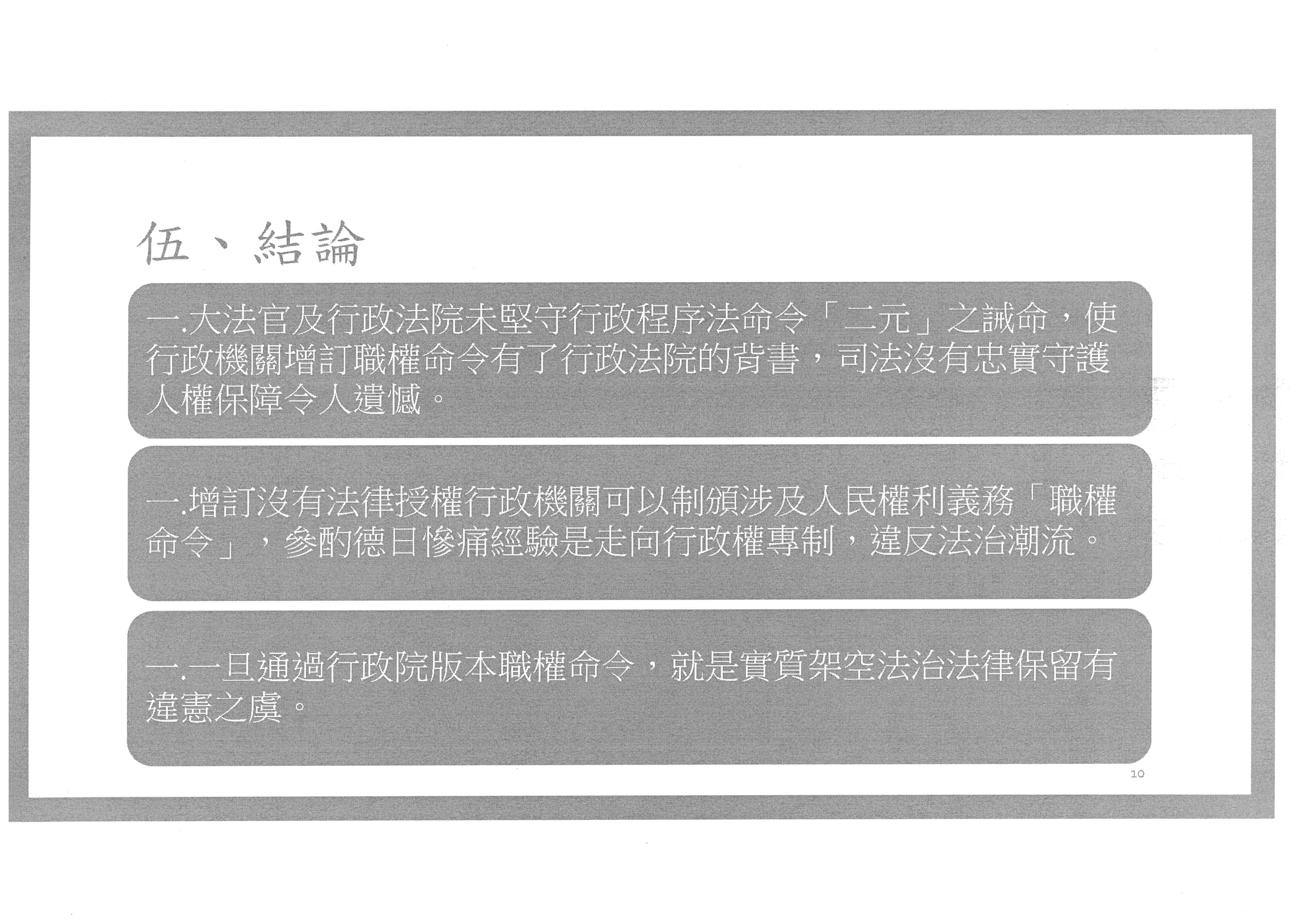 最後我的結論是,第一個,大法官及行政法院未堅守行政程序命令「二元」之誡命,使行政機關增訂職權命令有了行政法院的背書。最主要的是,大法官及最高行政法院本來就要堅守當初的立法意旨,卻一直沒有做到,結果行政權也就懶得去修法。司法沒有忠實守護人民的權利保障,令人遺憾,因此法律審查時認為沒有審查依據,可是法官可以從立法意旨找到審查依據。