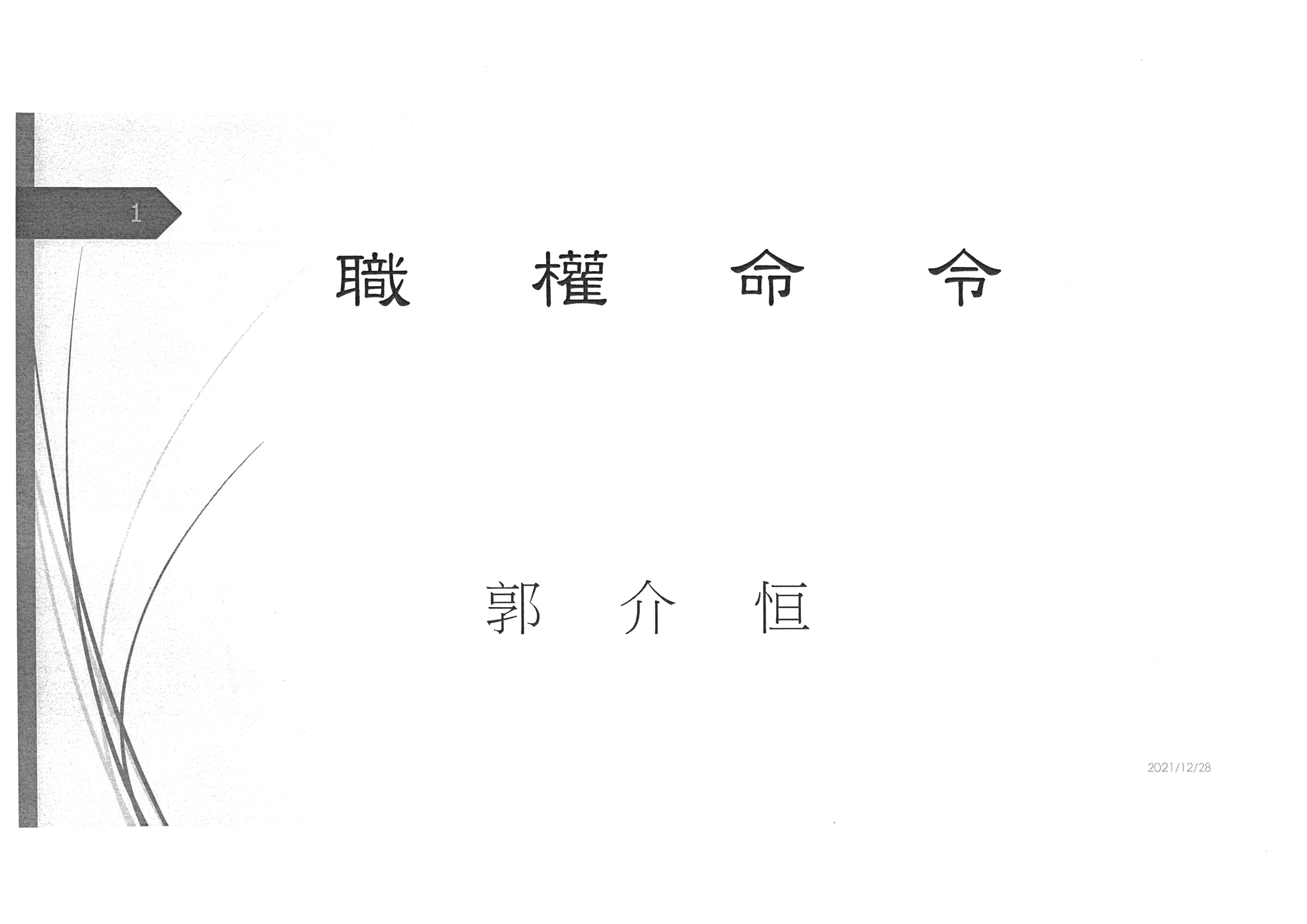 郭介恒教授:主席、各位先進,大家好!我想了半天,做了一份簡單的投影片向大家報告。關於職權命令,剛才許多先進都已談了很多。我在前面先簡單說明,大家其實也都提到,如果要透過立法理由規定,就如同投影片中文字黑體化這部分,必須確實是為了一些比較不涉及法律保留的事項或公益重大事項。當初在行政程序法制定之後,對於職權命令的存廢其實有行政程序法第一百七十四條之一作為落日條款,針對這些問題,後來也開會討論過,所以大家當初其實也一直在想職權命令到底要何去何從,只是中央法規標準法一直沒修,這大概是立法上的背景。