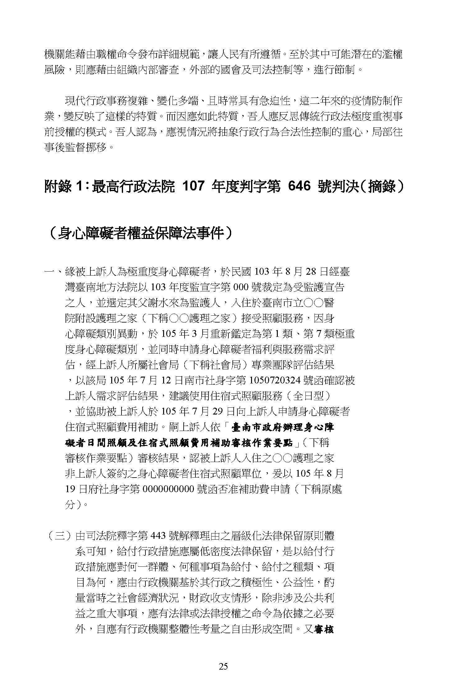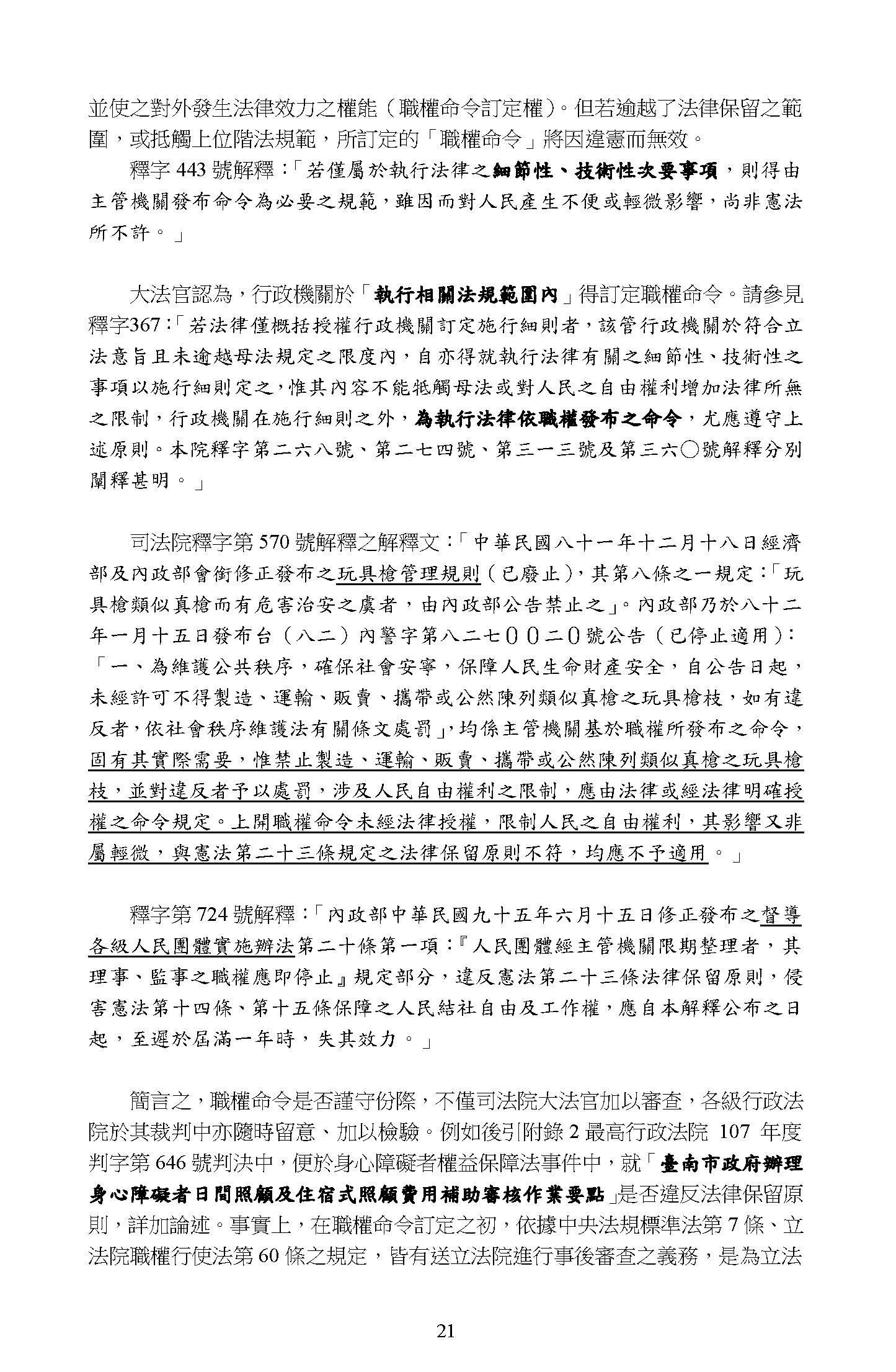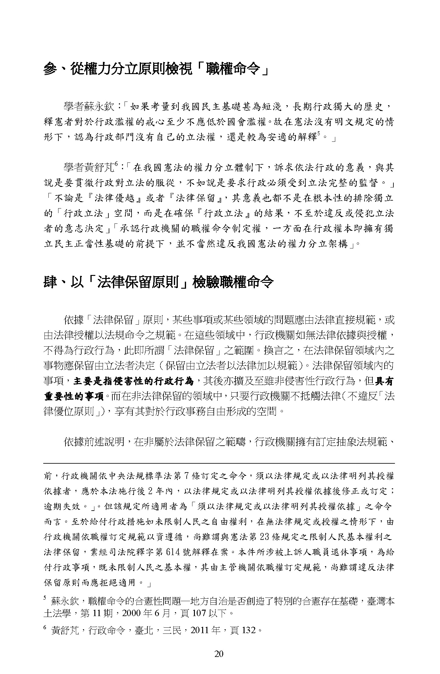再來要特別提到的是,剛剛有提到法律保留原則或者是法律優位原則,它是職權命令很重要的一個紅線跟底線,當然這個部分我們大法官已經做過很多號解釋,我就不再重複。我現在強調的是,我們的行政法院在這個部分的功能是存在的,事實上,我在我的附錄1裡面有放入一個行政法院的裁判,這只是一個代表而已,類似這樣由行政法院針對個案當中相關援引的職權命令到底有沒有踩過紅線,這是法官在個案審判當中必須要緊盯之處。在這個案子裡面,即便後來法官認為這是一個給付性的行政,向來法律保留的密度不是很高,所以它可以合法地存在,作為臺南市政府某種給付措施的一個標準,所以人民控訴說這個違反法律保留,法官是沒有採納。即便是這樣子,但是你看得出來,法官有在審查,當然另外有其他案子,法官是有把它宣告說這個相關的命令是已經逾越紅線、是違法。可見,我們如果讓它存在的話,其實也不用那麼惶恐,反而是建構、強化一種所謂的審查防禦機制。