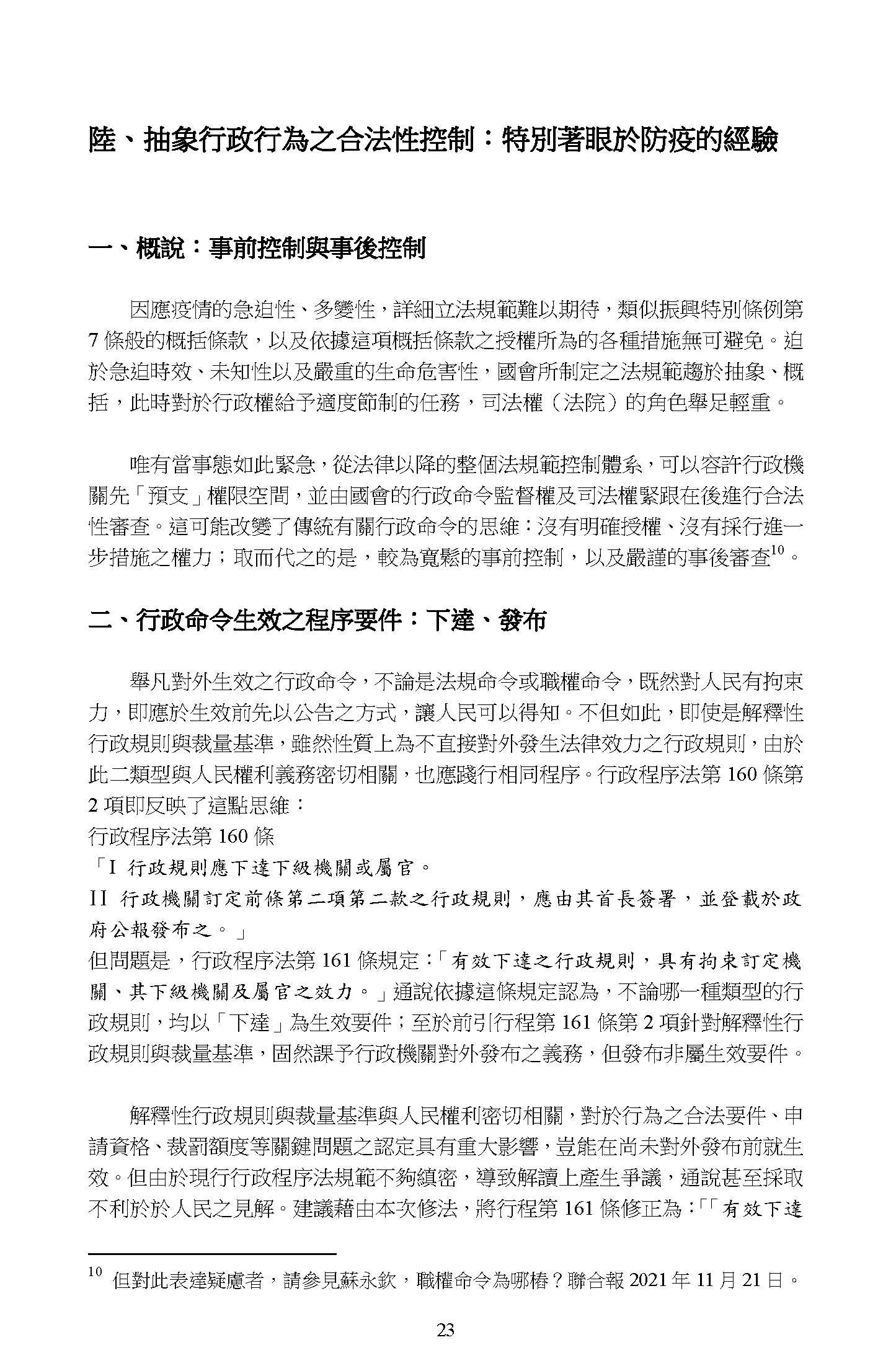 有關所謂的抽象行政行為的合法性控制,因為這是我們提綱之一,我特別有感觸,我剛剛也特別提到,事前當然就包括在內,在我們相關的行政命令,不論何種類型,我想我們讓國會能夠收到這樣一個行政部門送來的行政命令,然後加以審查,這當然是一個有效的監督方式,不管它是生效前、生效後。另外,事後審查部分,當然也包括我們國會審查或者是剛剛我強調的司法審查,這種審查機制當然是重要。程序上,在生效前應該經過什麼程序?事實上我特別注意到一個問題,如果是要對人民生效的,必須要在生效前通過一個對外發布或者公告程序,我們目前的立法上就有一個算是小小的缺失,即我們在行政規則的這個部分,我們行政規則的生效要件是寫在第一百六十一條,只要是有效下達的行政規則都可以生效,其中就不去區分其行政規則類型,但是我們都很清楚,我們的解釋性行政規則,它有裁量基準,這是人民很關切的,因為涉及案件可否被准許?會罰多少錢?這些都有訂定,所以非常重要。行政程序法注意到這點,於第一百六十條第二項提到,這兩種行政規則必須登載於公報,對外發布。但所謂對外發布的公告程序,並非生效要件,只是義務,這是今年的國考考題。我認為此舉是項缺漏,既然認為這兩種行政規則如此重要,理當讓人民知道,為什麼踐行完才生效而非先生效?至於何時公告?再說!這是立法上的缺失,我希望能藉由此次修法一併補足。