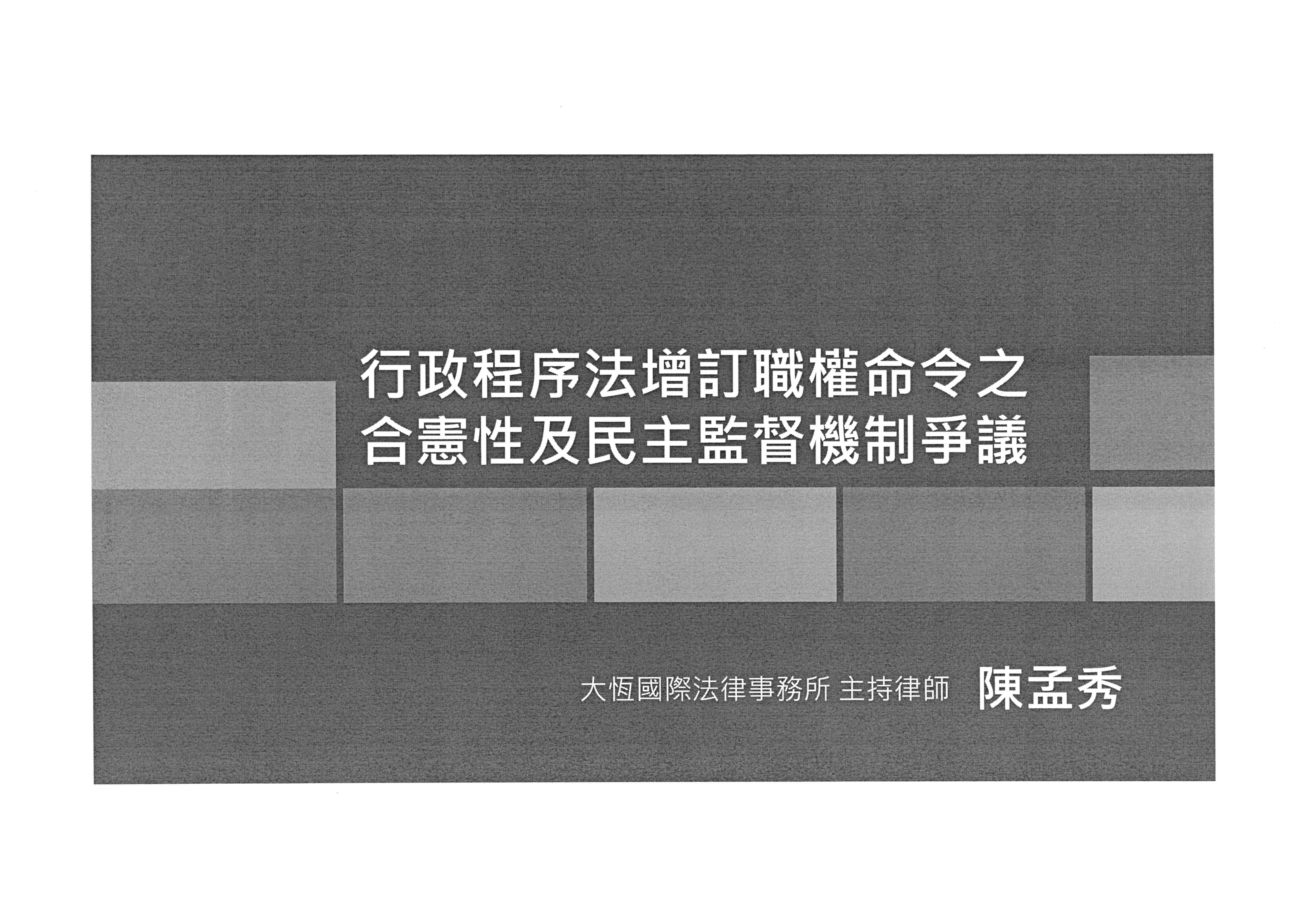 我們回過頭來看,目前的行政程序法修正草案當中針對職權命令的規範定義,與法規命令的規範定義相較,界限是非常模糊的,這樣的情形是不是能夠符合我們剛剛所講的那個框架?反觀在立法說明當中,其實對於這樣的精神有做了說明,因此我們也非常同意前面幾位學者的意見,就我剛剛所講的一些條件或事項的限制,能夠在立法條文中予以明定,把它融入進去之後,可以減輕外界的疑慮。