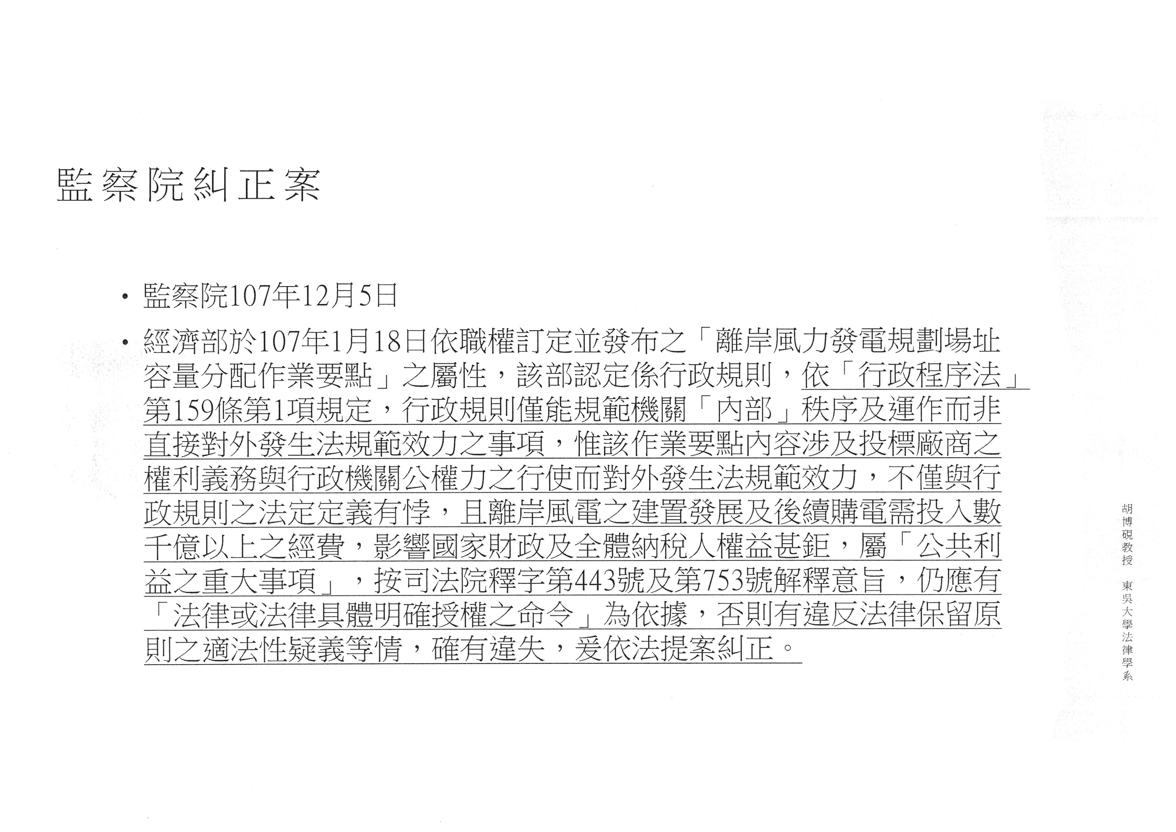 胡博硯教授:主持人、各位老師、各位同仁,大家早安、大家好。我是東吳大學教授胡博硯,很感謝委員會邀請我來參與本次公聽會,我針對行政命令提出一些自己的意見。這次行政命令再次出現的問題,就是因為行政程序法修正草案當中,第一百五十七條之一及第一百五十七條之二當中,我講這叫旱地拔蔥式出現的職權命令。因為職權命令上次的討論,基本上來講,剛剛廖老師有提到,訂定行政程序法的時候是在念博士生,而我根本還是小孩子,所以上次討論這個的時候,原則上來講,我已經很難有記憶了,應該大概是十幾年前討論的題目。突然出現當然就是會讓大家覺得非常好奇,但是我來跟大家解釋一個比較艱困的命題,我們來看一個監察院的糾正文,這是107年12月5日監察院針對離岸風電設置的糾正文,這寫太細了,我直接講,因為離岸風電的設置,現在是用「離岸風力發電規劃場址容量分配作業要點」,這是一個作業要點,很顯然是一個行政規則,這個作業要點分配了哪個離岸風場可以發多少度電,它影響大不大?非常大!它對當事人的民眾影響很大,對廠商影響也大,而且這些廠商,我都常常講這些廠商我們得罪不起,統統都是外國人,所以這件些事情就影響非常大,然後監察院就說:影響這麼大,怎麼用行政規則就把它訂定了?真的,這件事情是一個很大的問題。