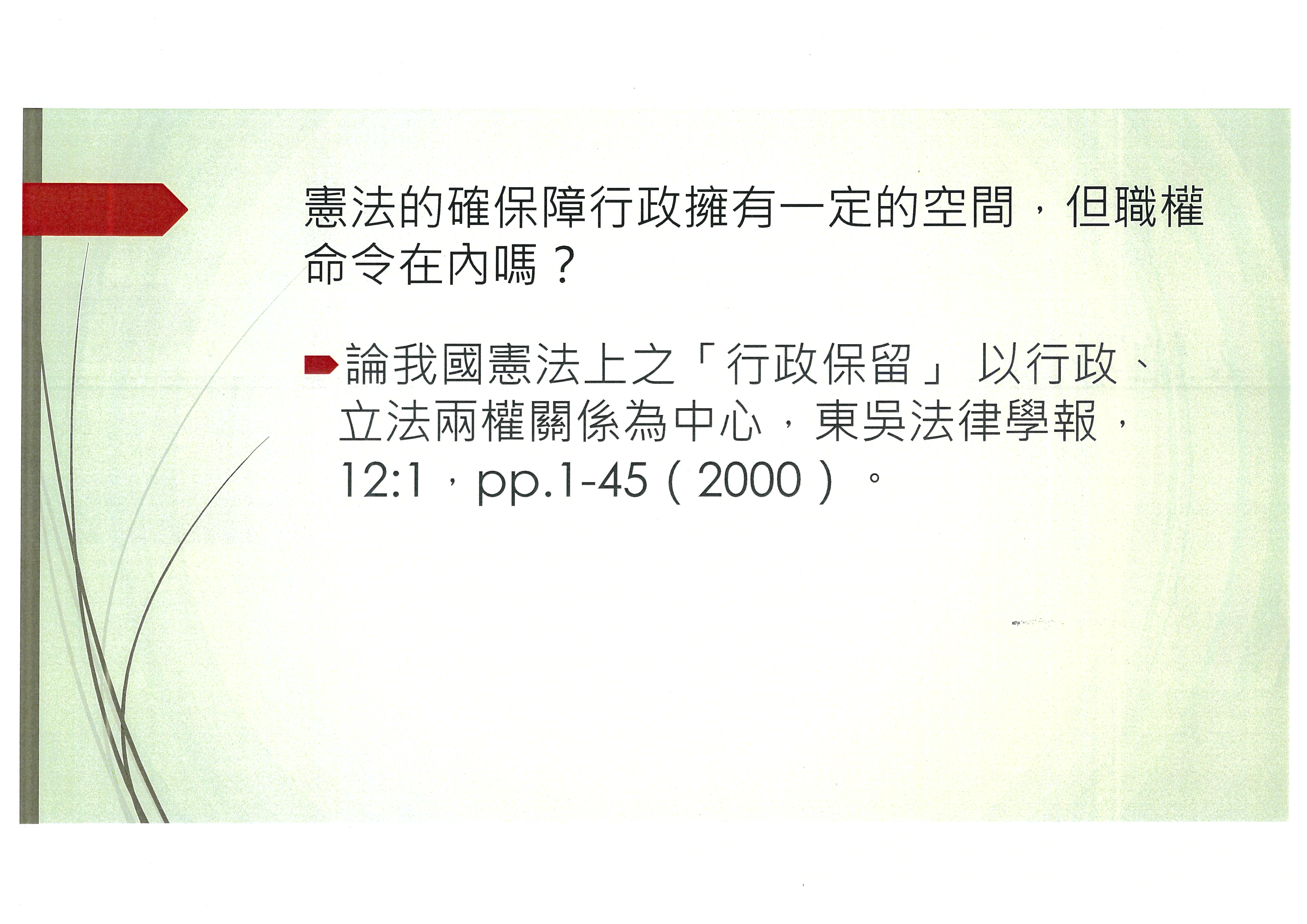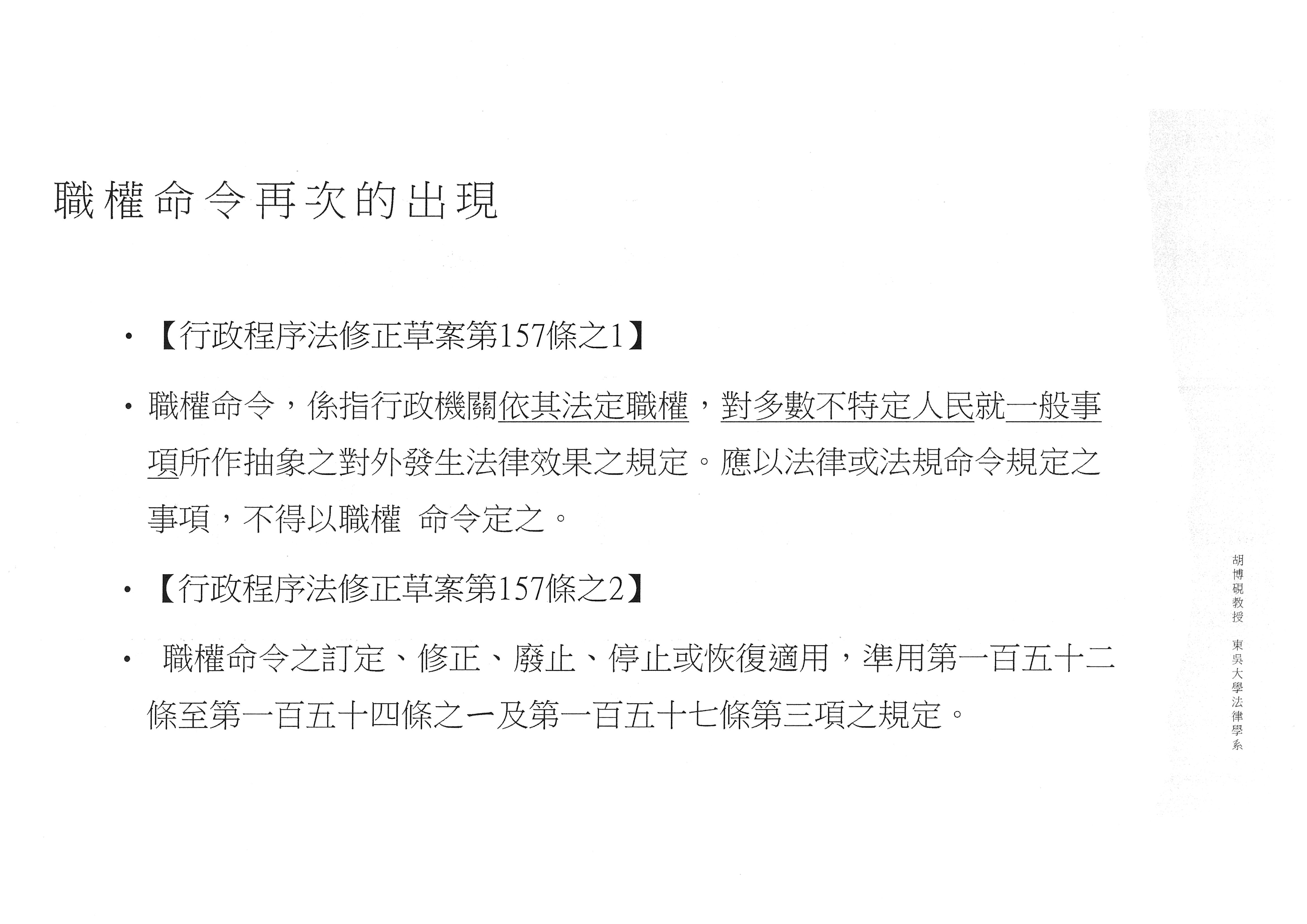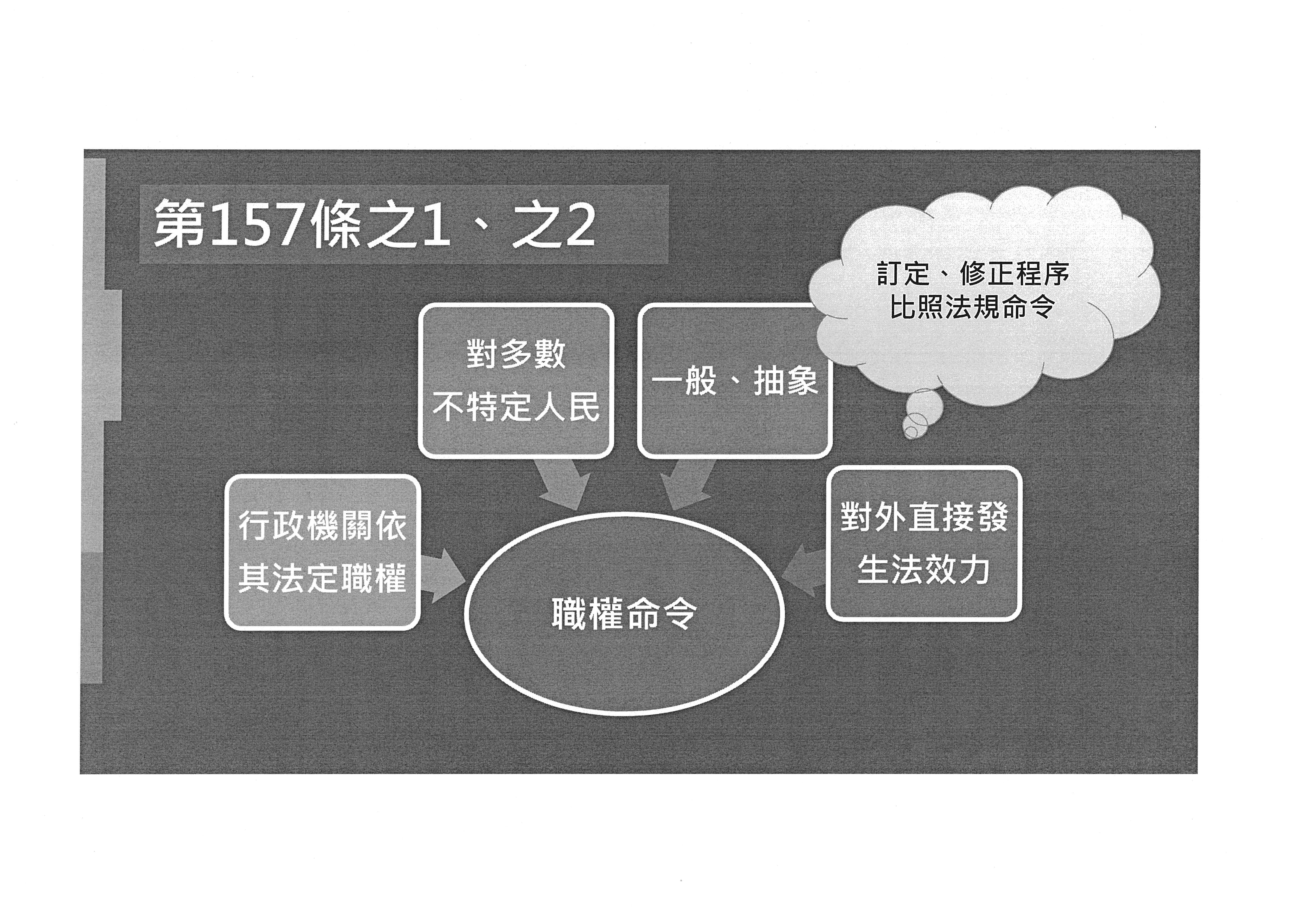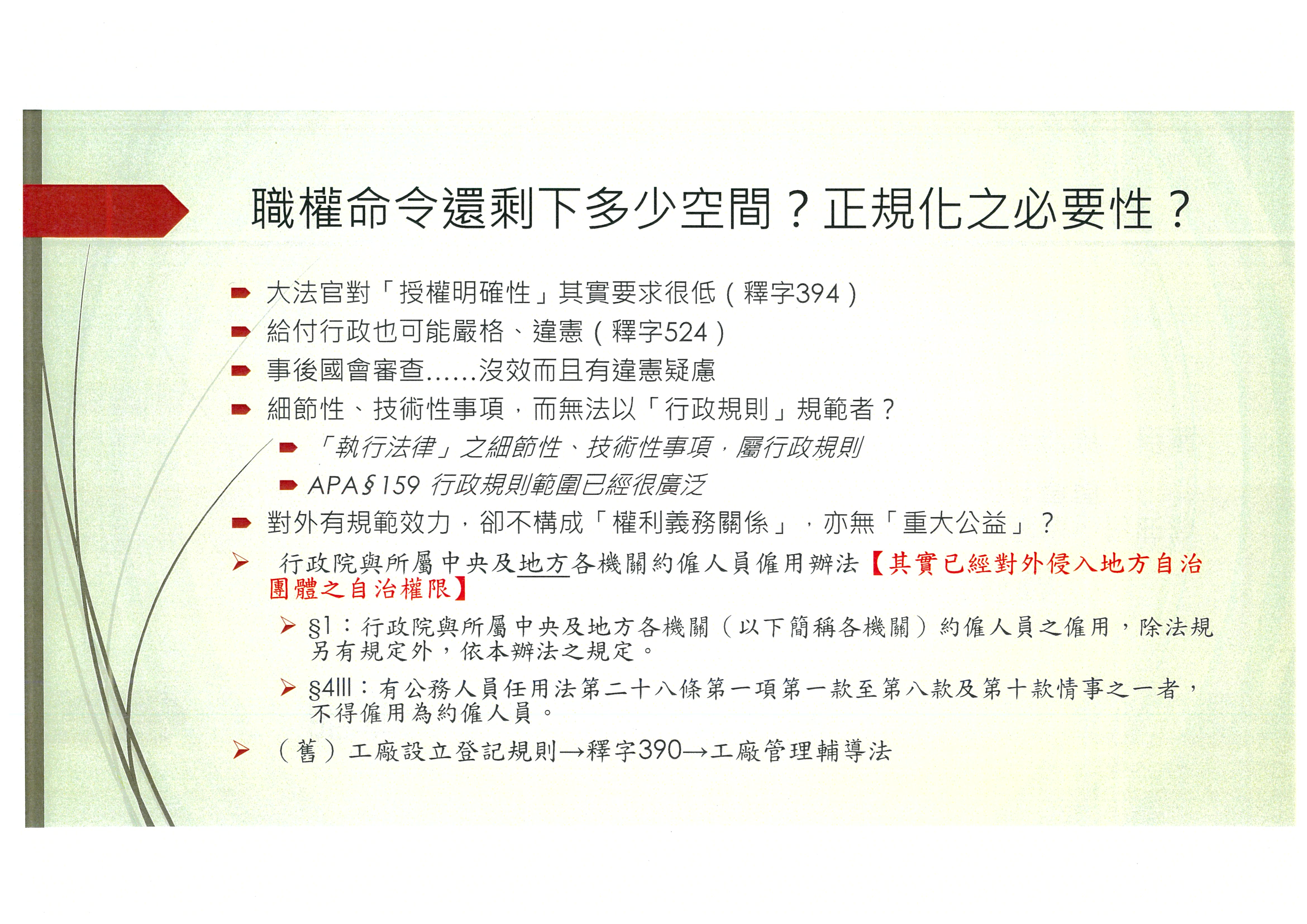 另外,關於職權命令的立法,剛才廖大法官提到職權指的是不是組織法,其實大法官釋字第535號解釋就提到組織法不能作為依據,一定要回到作用法。在立法上也是放在第一百五十七條之後,也就是行政規則之前,所以它應該完全比照法規授權這樣的程序,雖然沒有提及授權,但仍然要比照法規授權程序走。