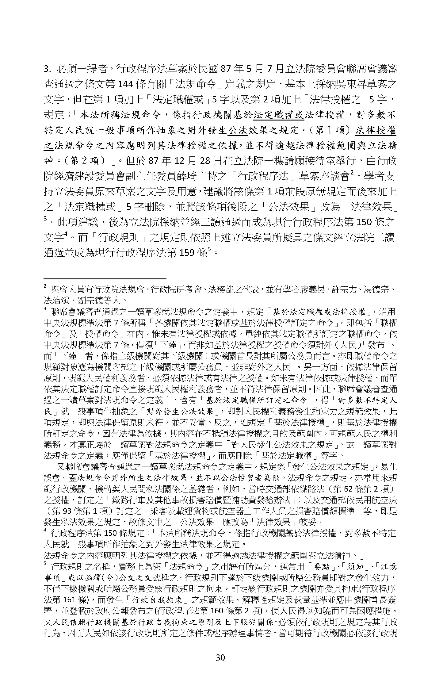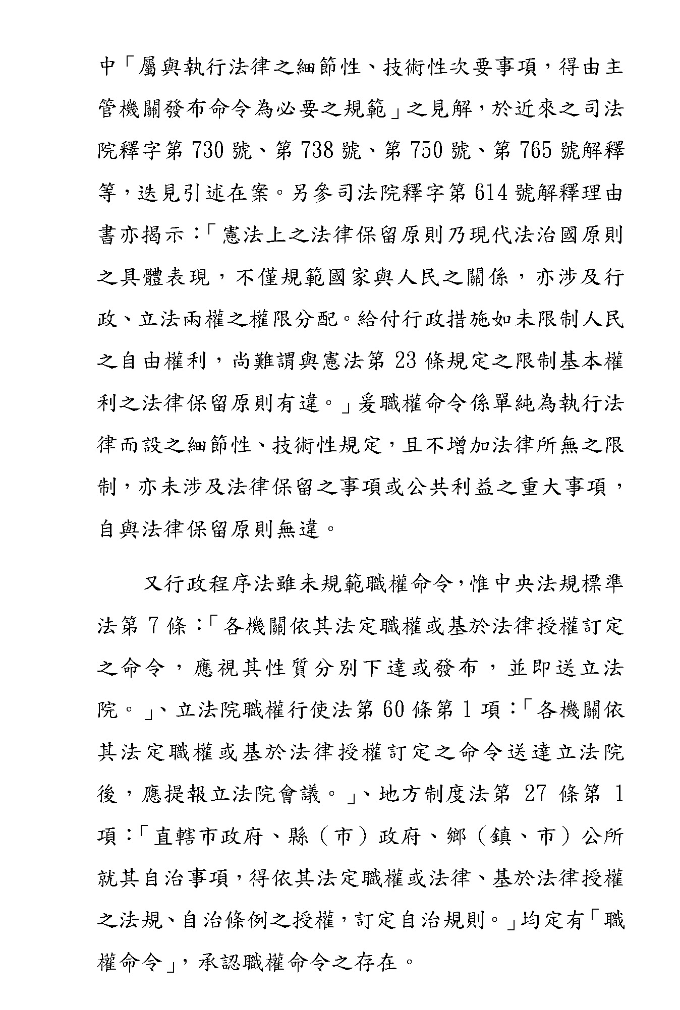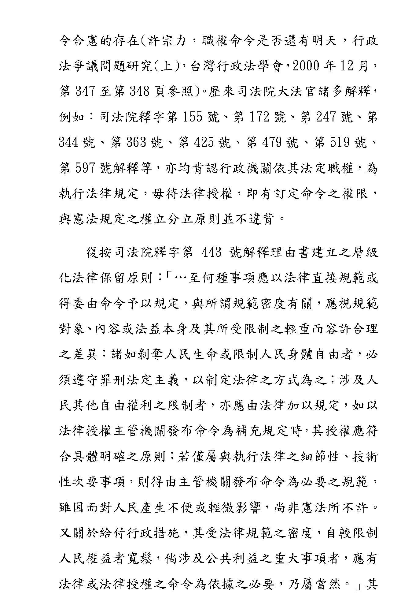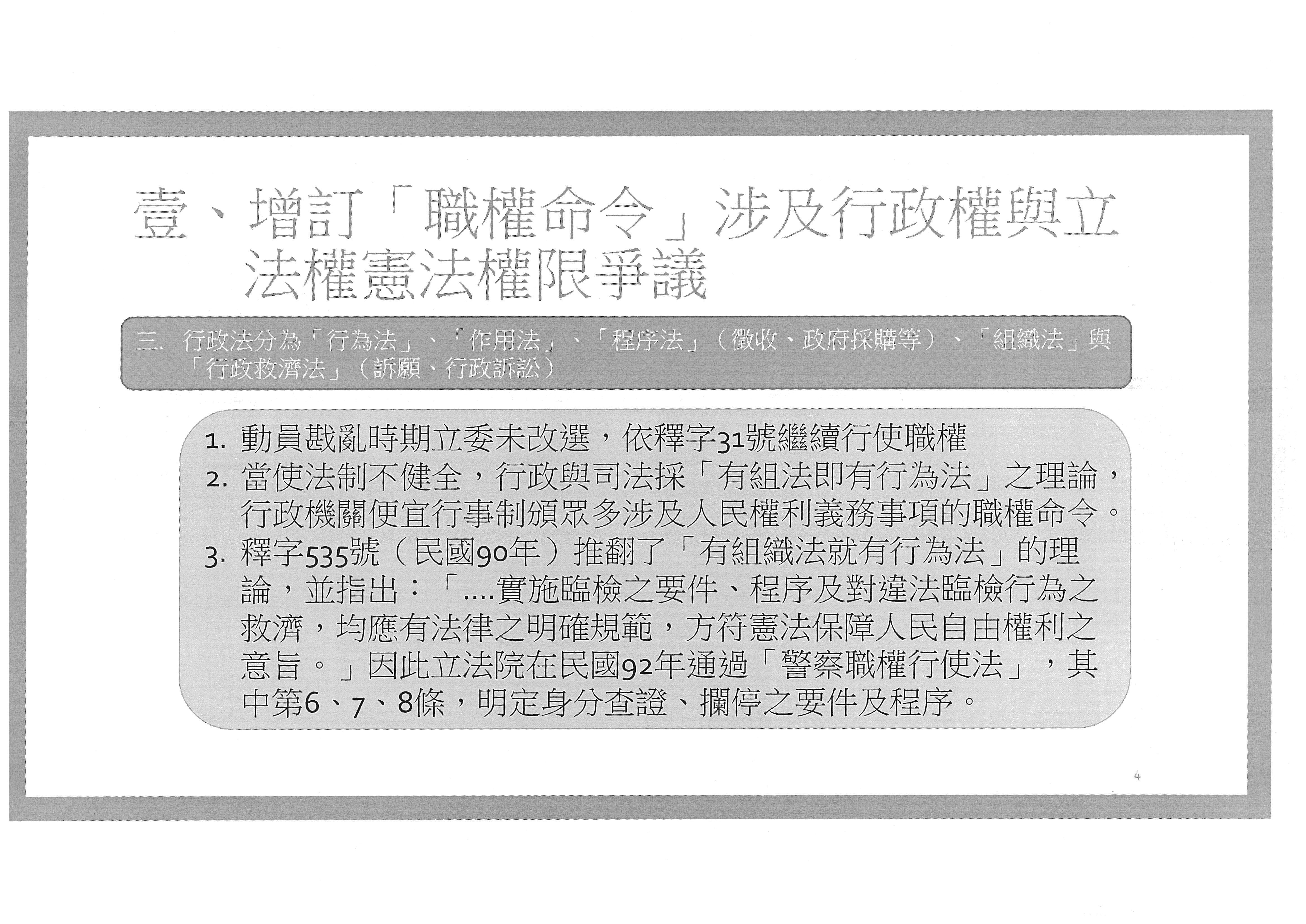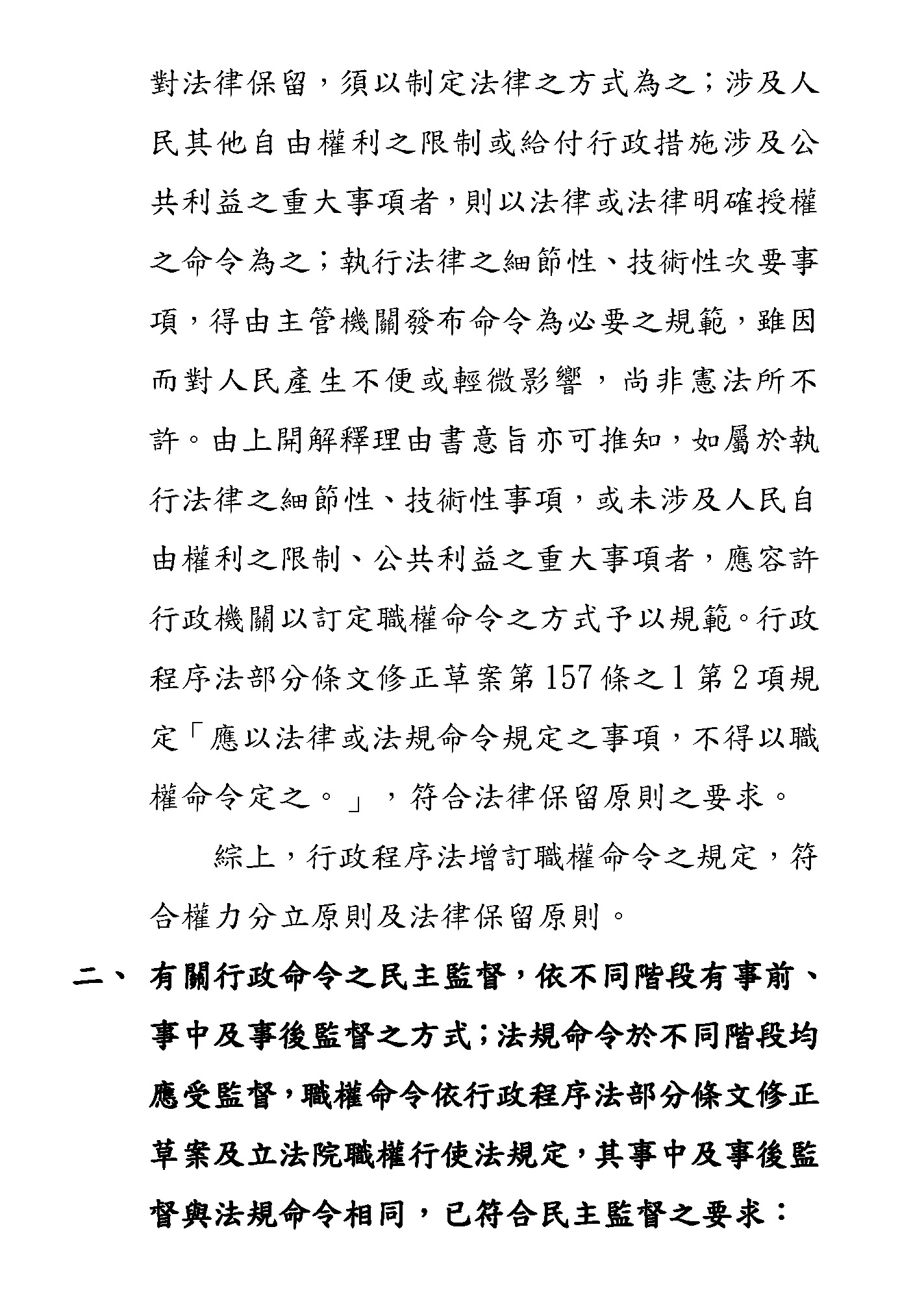 另外,關於職權命令的立法,剛才廖大法官提到職權指的是不是組織法,其實大法官釋字第535號解釋就提到組織法不能作為依據,一定要回到作用法。在立法上也是放在第一百五十七條之後,也就是行政規則之前,所以它應該完全比照法規授權這樣的程序,雖然沒有提及授權,但仍然要比照法規授權程序走。