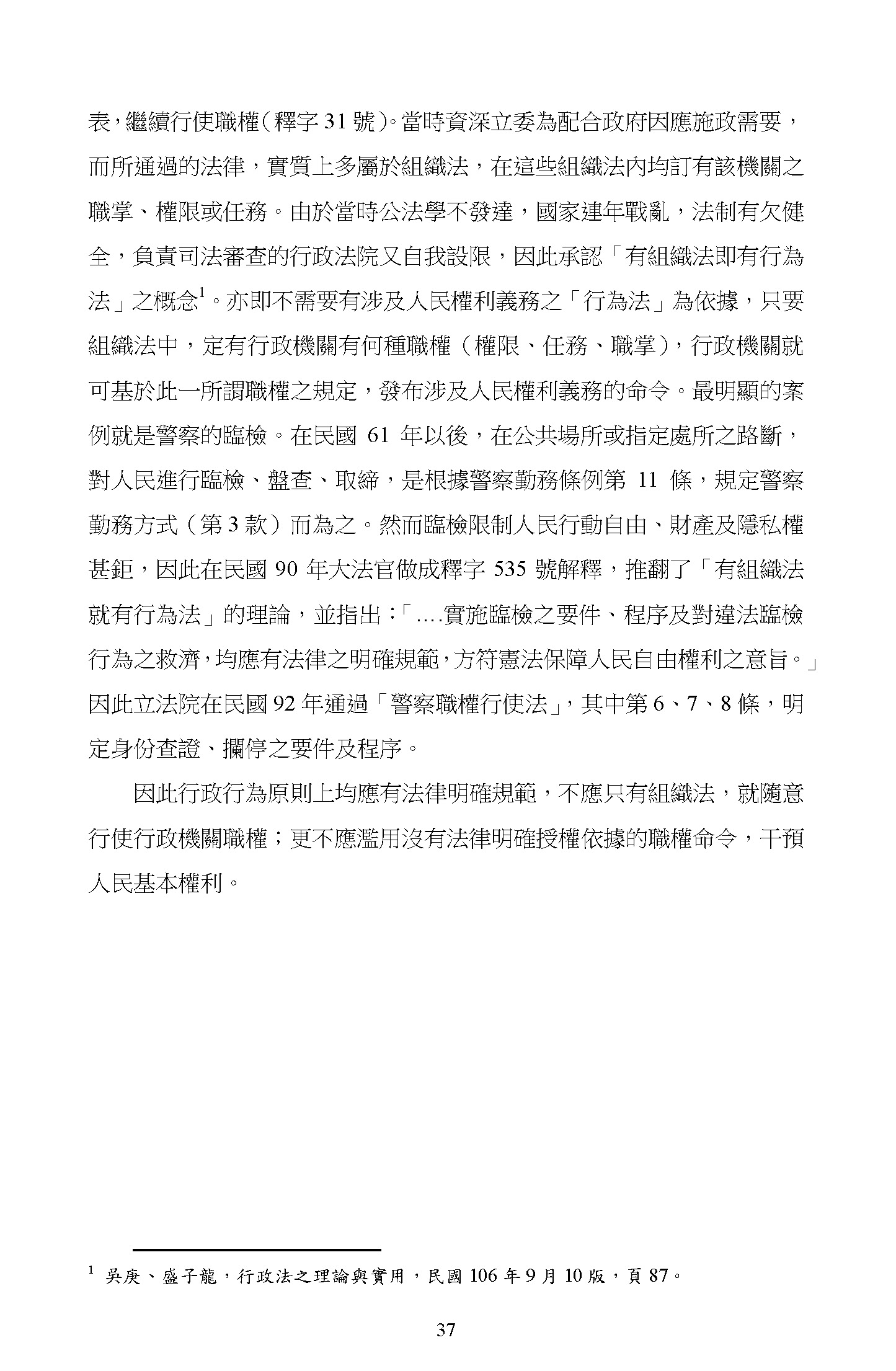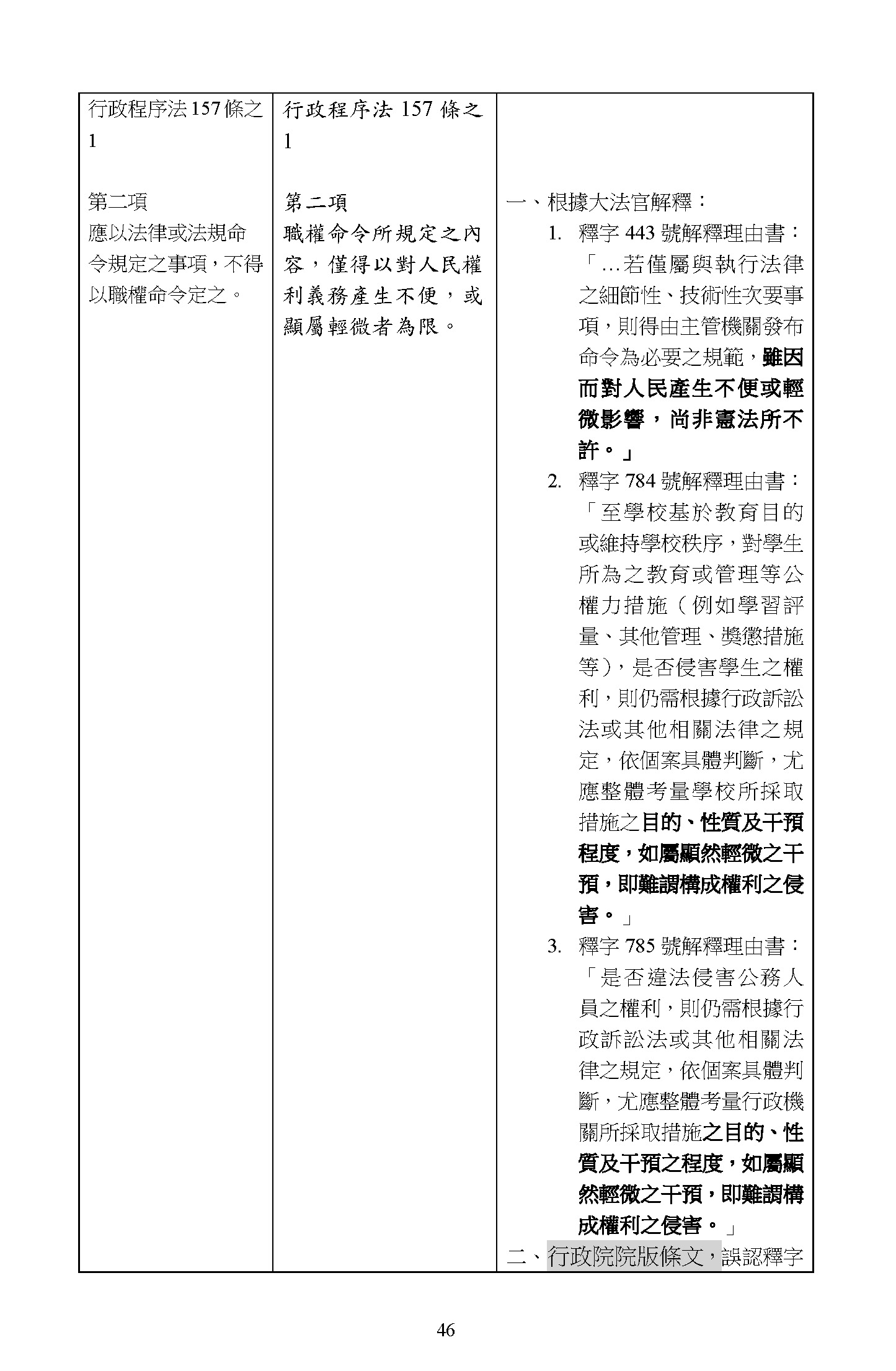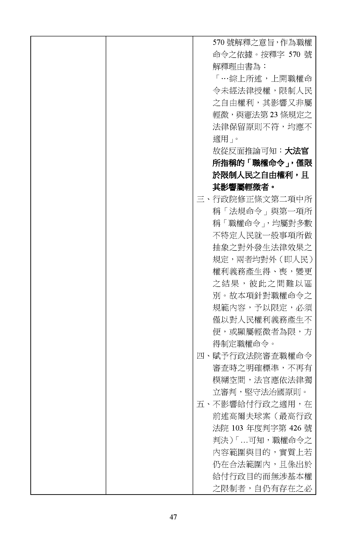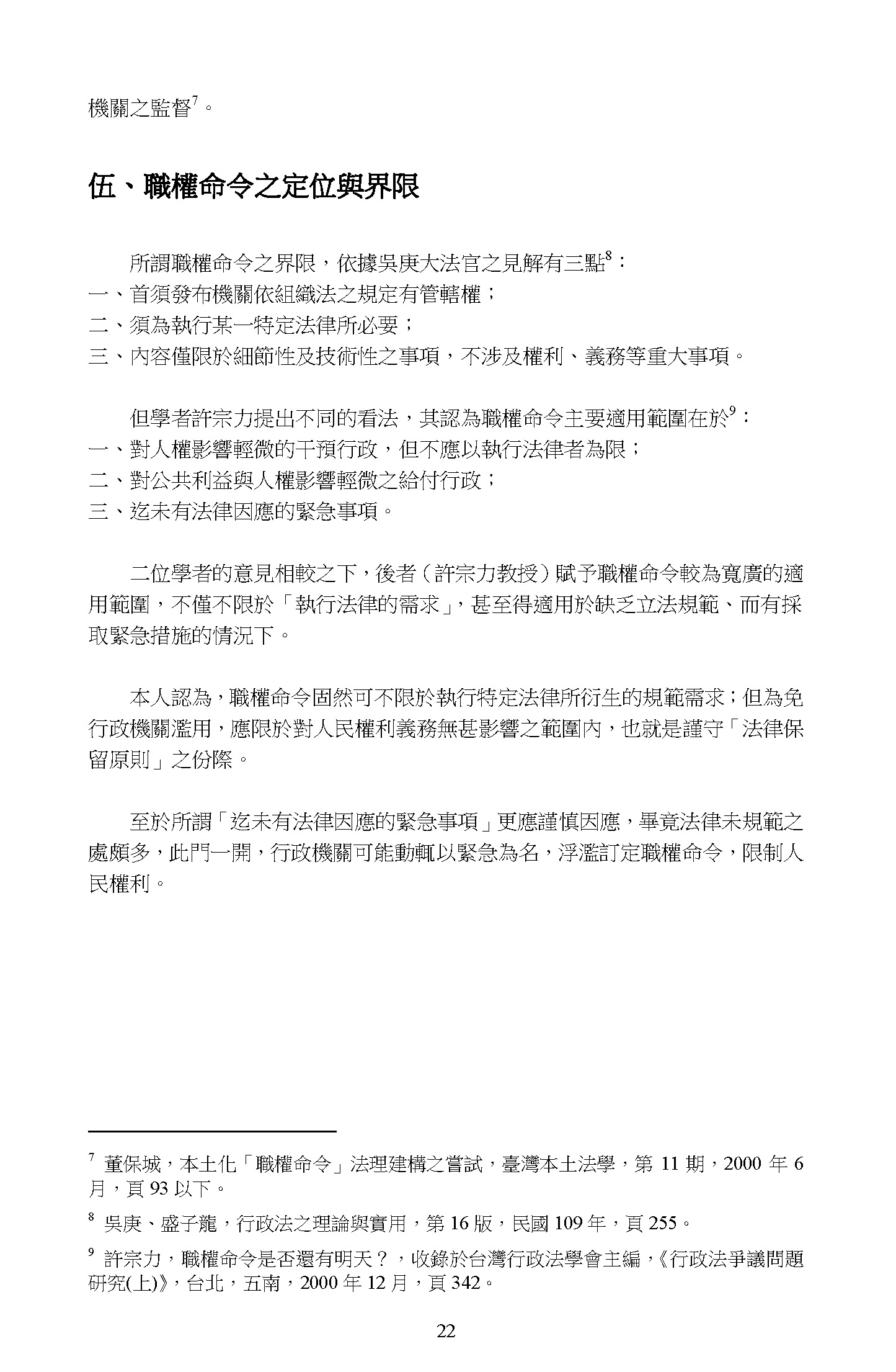另外,關於職權命令的立法,剛才廖大法官提到職權指的是不是組織法,其實大法官釋字第535號解釋就提到組織法不能作為依據,一定要回到作用法。在立法上也是放在第一百五十七條之後,也就是行政規則之前,所以它應該完全比照法規授權這樣的程序,雖然沒有提及授權,但仍然要比照法規授權程序走。