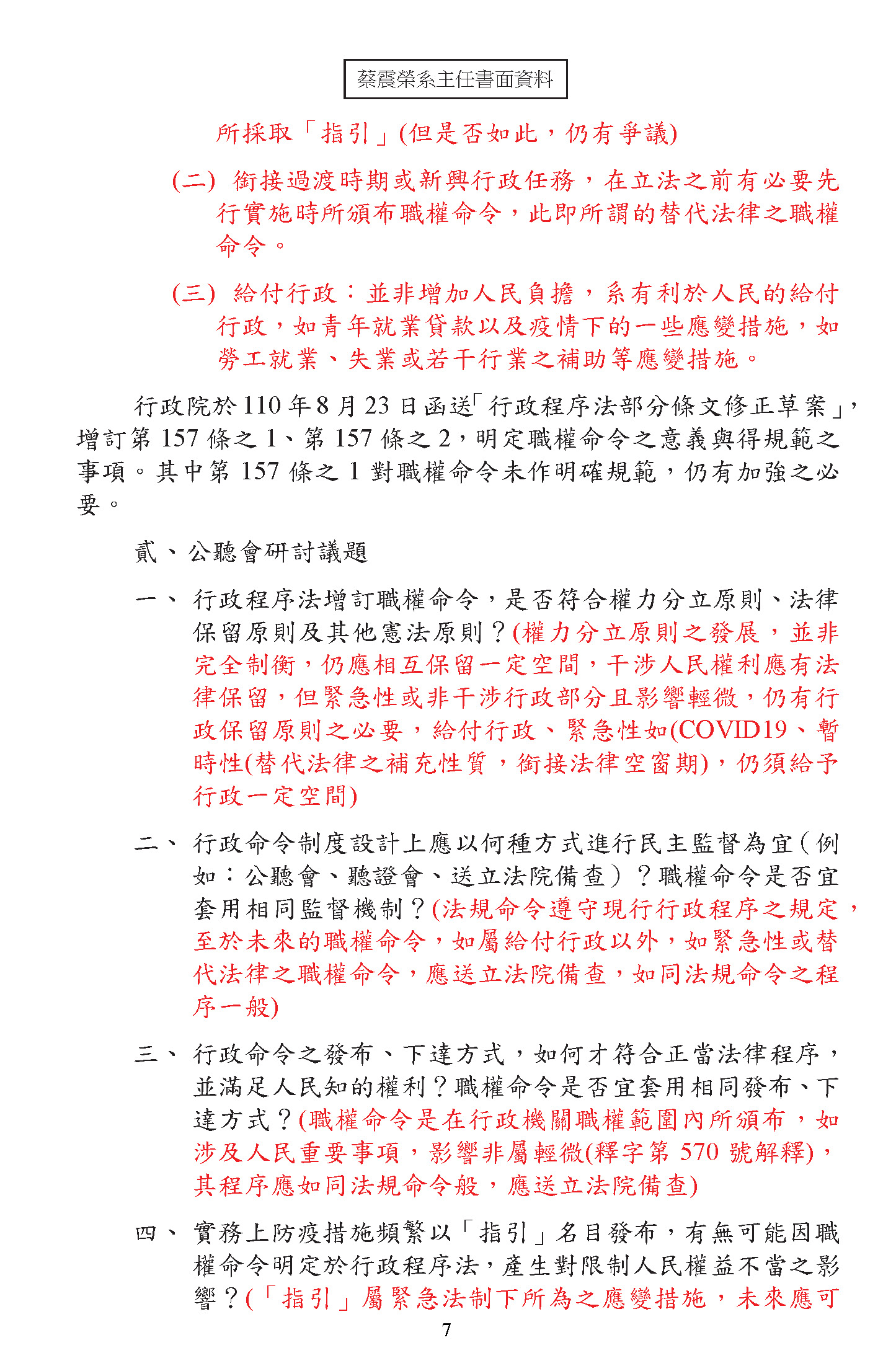 總之,職權命令攸關國會代表人民監督政府整體民主法制發展,也關聯到防疫法制是逐漸上軌道還是乾脆脫軌承認就地合法,因此特別安排這一次的公聽會,希望諸位專家學者給我們寶貴的意見。