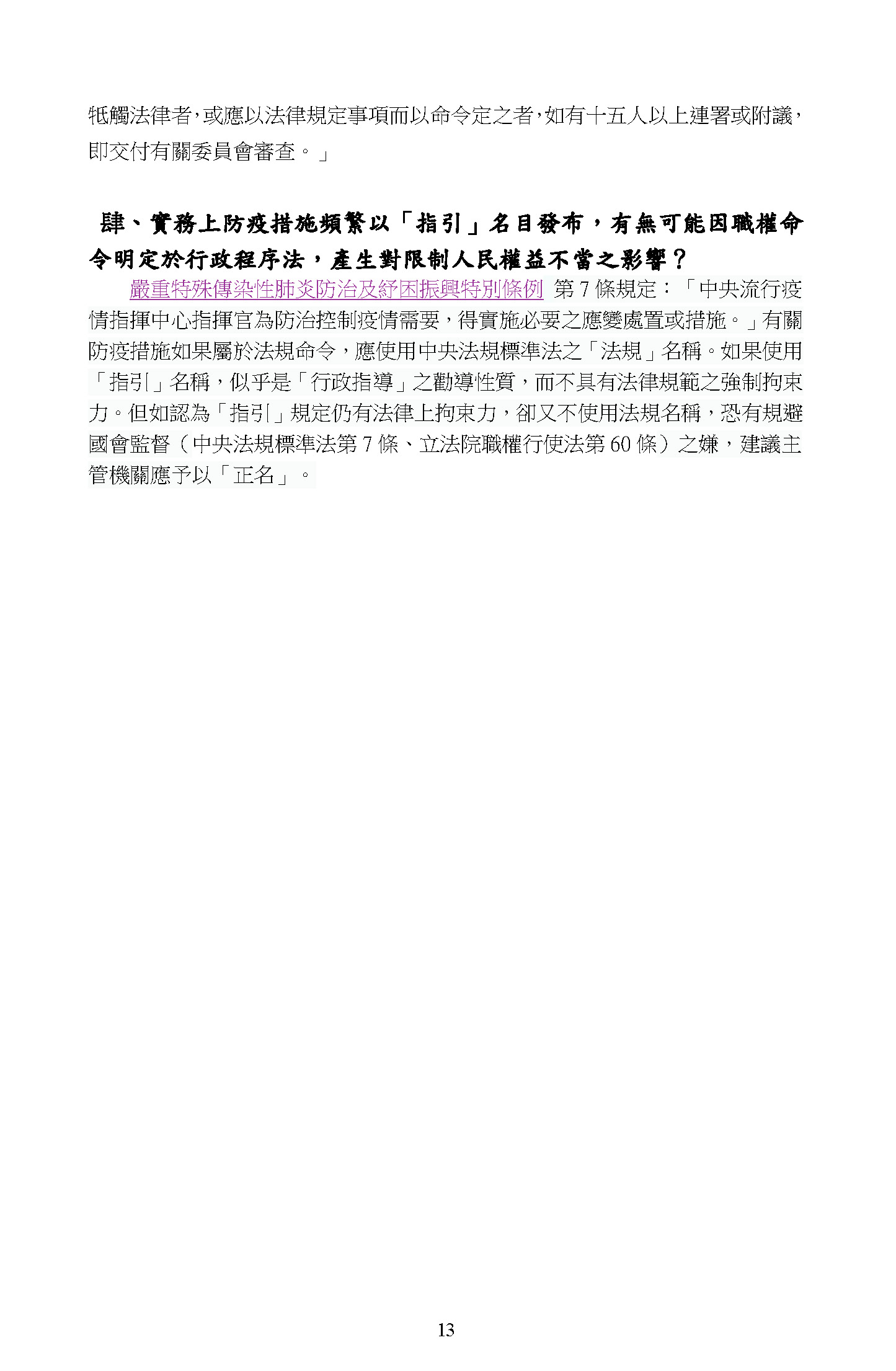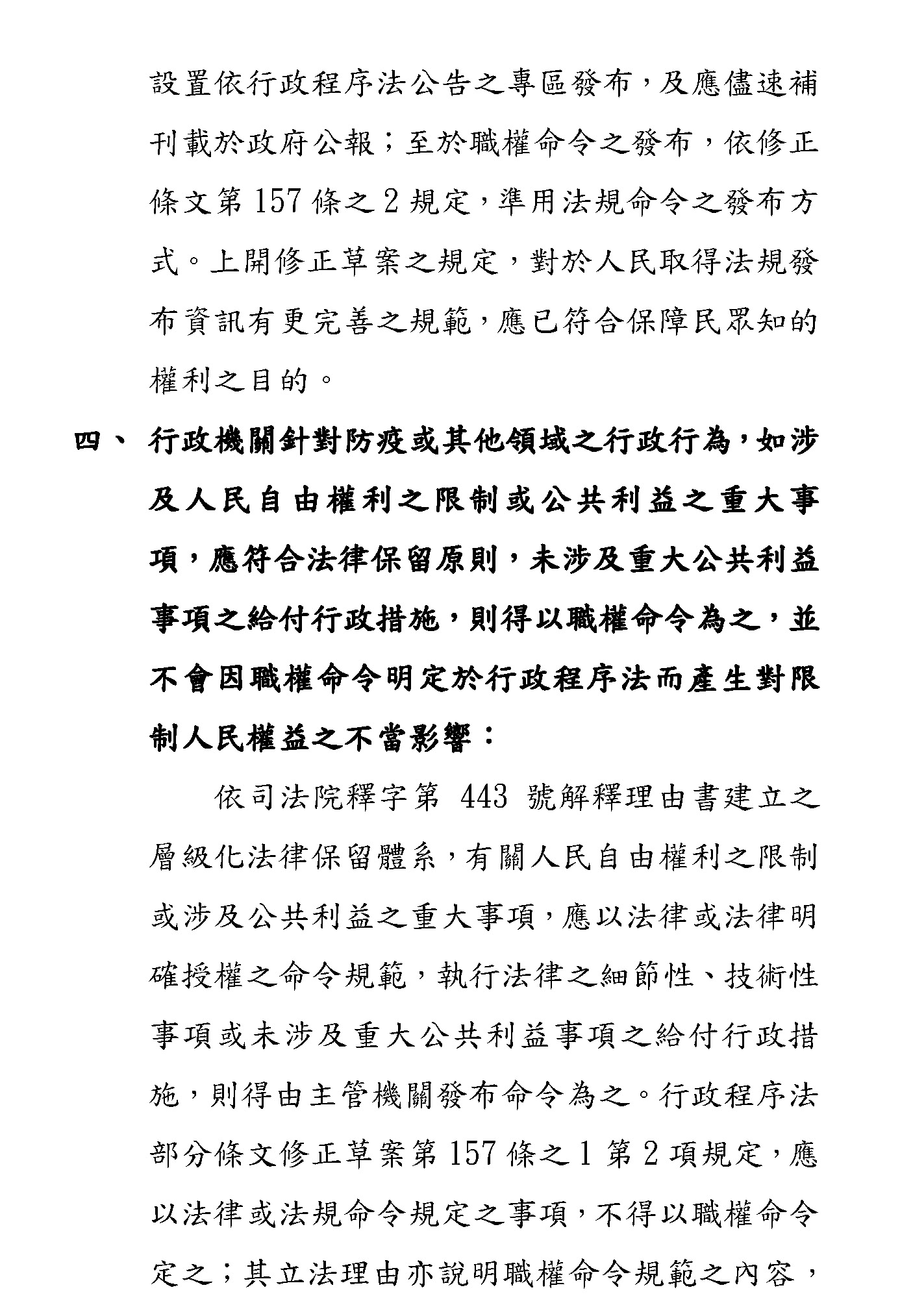 雖然9月30日本會舉辦「防疫措施法制爭議」之公聽會時,法務部曾經表示這次的行政程序法與防疫措施無關,但前大法官蘇永欽仍投書指出,當前頻繁使用只以授權依據不明的防疫法制實務,有可能會因為職權命令的入法而大開後門,更加失控。