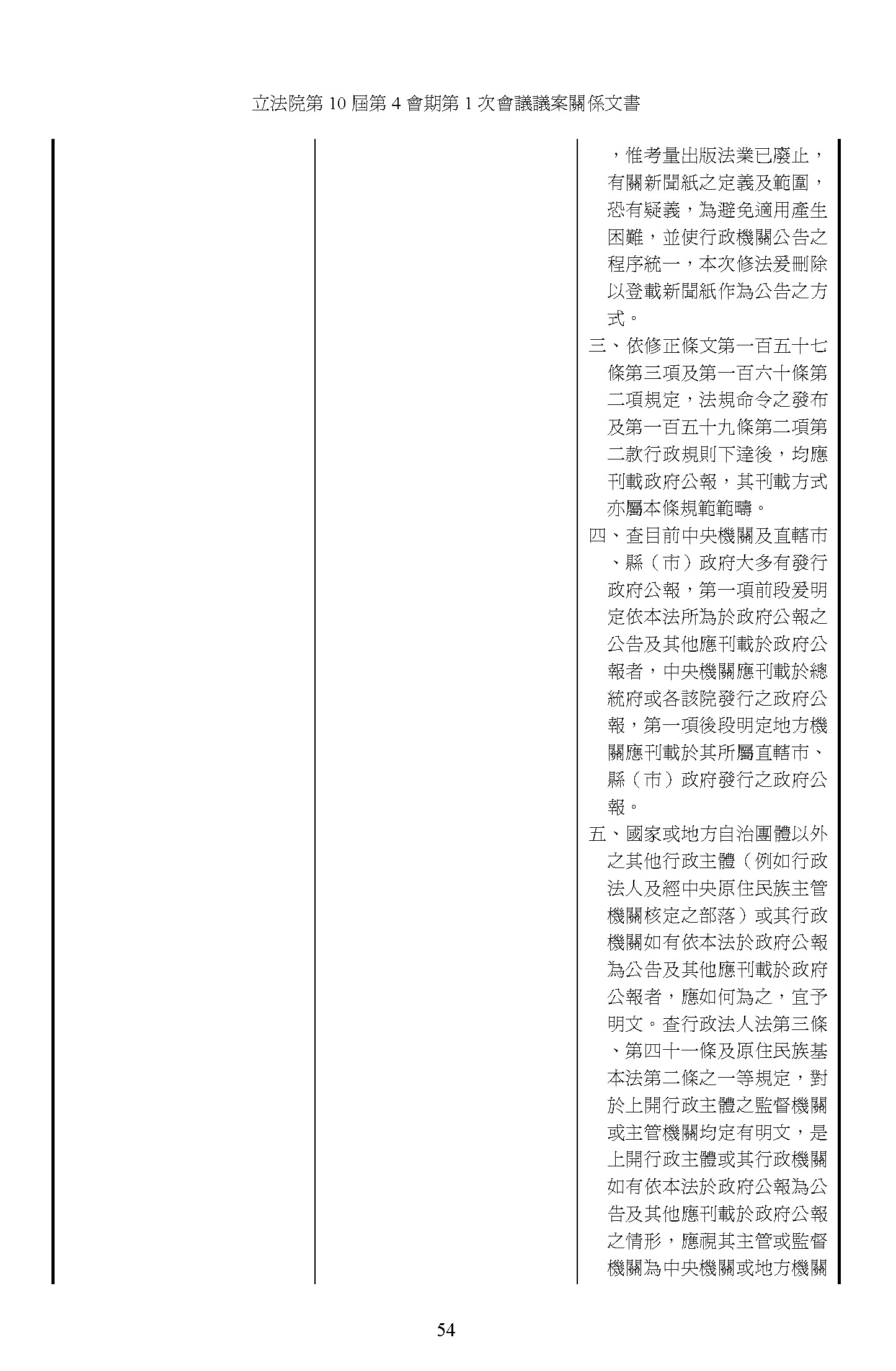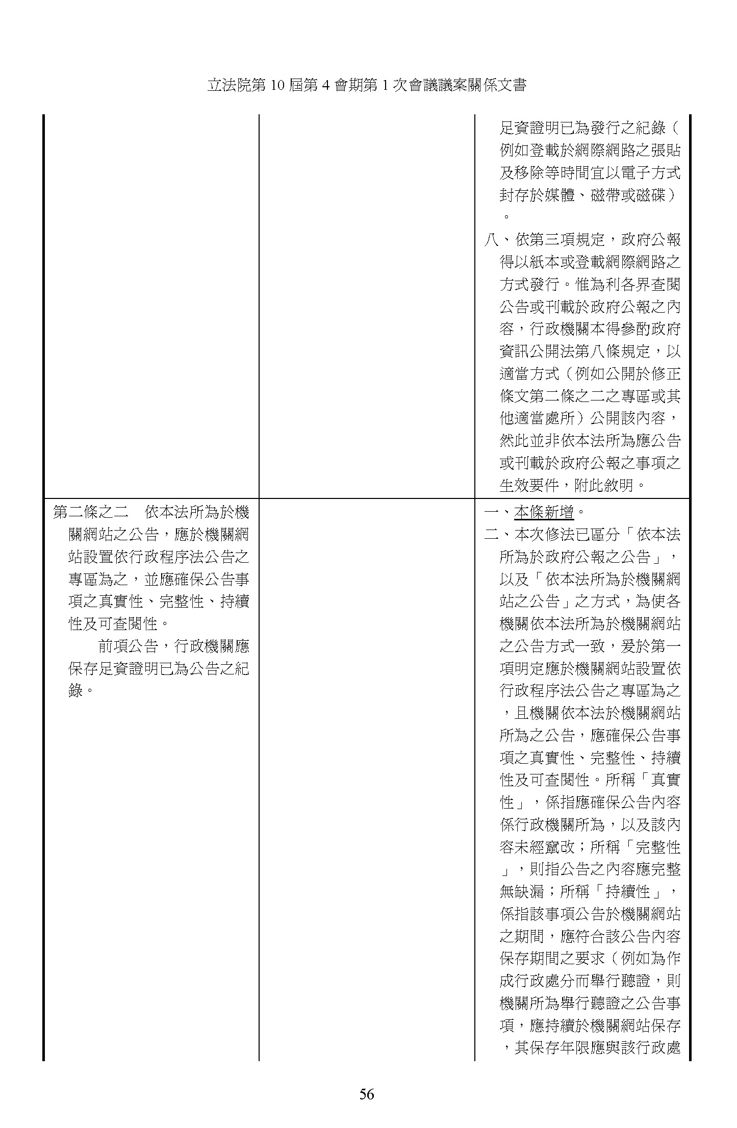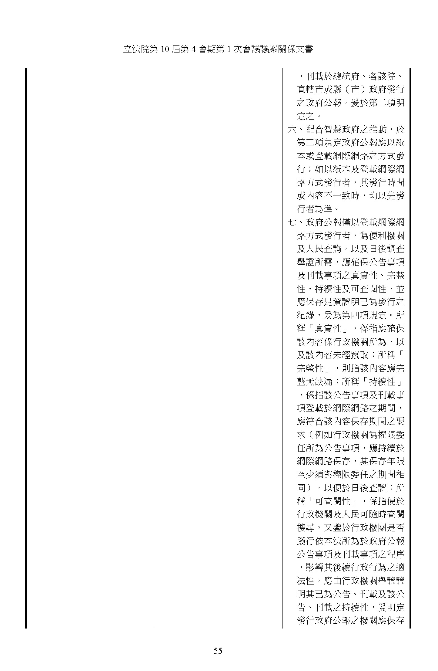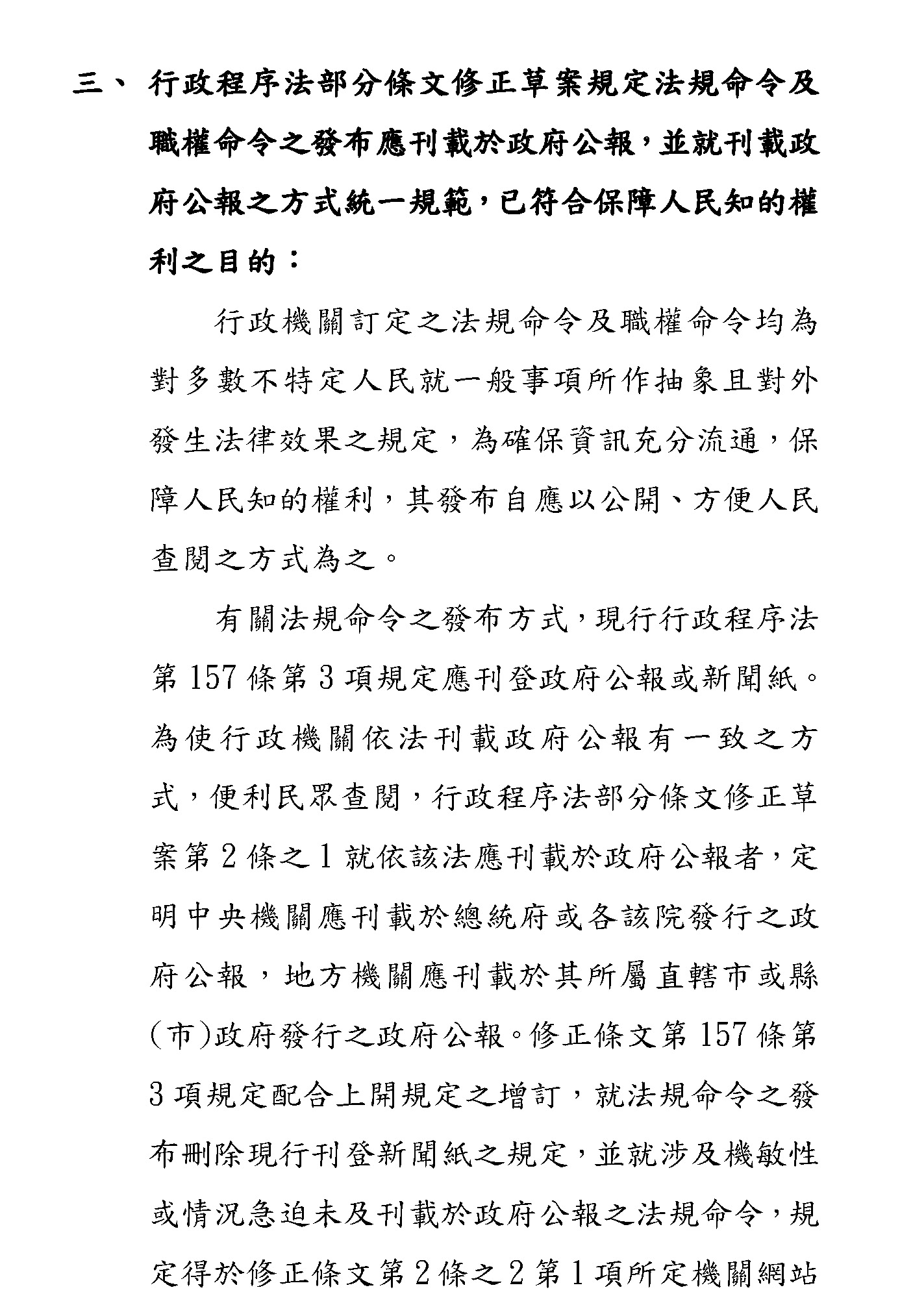 我們要特別提醒,關於行政命令發布、下達方式的部分,我們有一點建議,因為行政程序法原本規定其發布是以公告的方式,刊登於政府公報或其他的新聞紙,可是這次修正的時候,把新聞紙的部分拿掉,現在實務上面會發生的情形是,以刊登政府公報這樣的形式,第一個是發行量不夠廣;第二個是有一定的期程,可能是每個月1日或每月15日刊登政府公報,但可能沒辦法因應彈性或臨時的需求。因此我們建議是不是可以刊登在政府網站?這也是公告的一個方式。