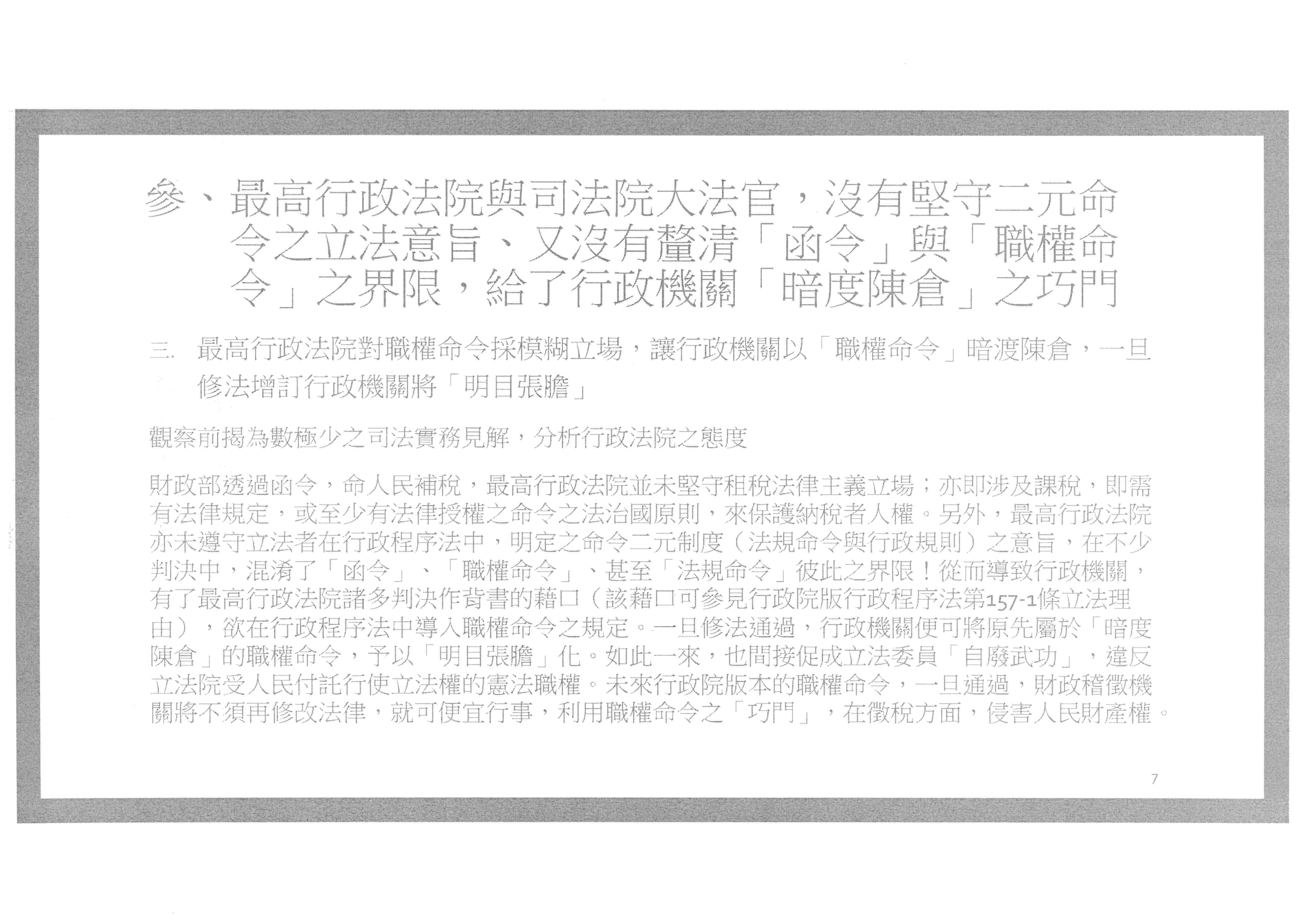各位可以看到今天公聽會的議題、提綱裡面好像是針對這次的防疫指引,其實職權命令如果照行政院的版本通過,將會影響到財稅、健康、警察及一切的行為,未來行政機關隨便發一個函令,就可以視為是職權命令,不需要有法律授權。因此,從最高行政法院對職權命令的態度等等,都可以告訴各位,因為最高行政法院沒有確實遵守、堅守二元命令的理論,才造成這樣的情況。各位可以參看我的書面報告第36頁到第48頁。最高行政法院與司法院大法官沒有堅守二元命令的理論,讓行政機關可以暗渡陳倉,譬如財政部可以透過函令命人民補稅,最高行政法院並沒有堅守租稅法定原則。因此一旦通過了行政院這個版本,行政院就可以從暗渡陳倉變成明目張膽地做,無形中利用職權命令的巧門,如果這樣的話,各位委員,你們以後的工作會大量減輕,因為不需要有法律授權,立法院將淪為自宮。