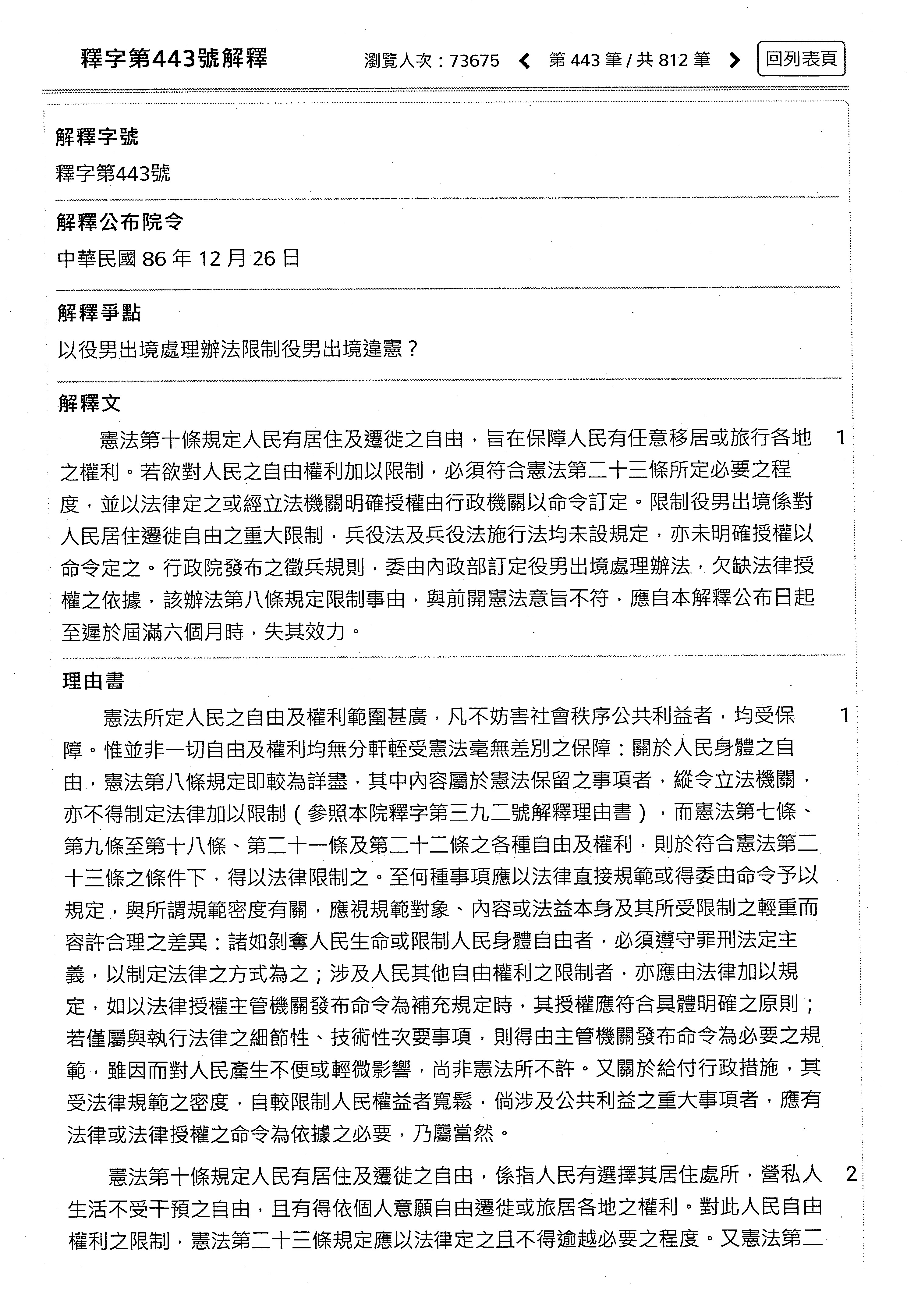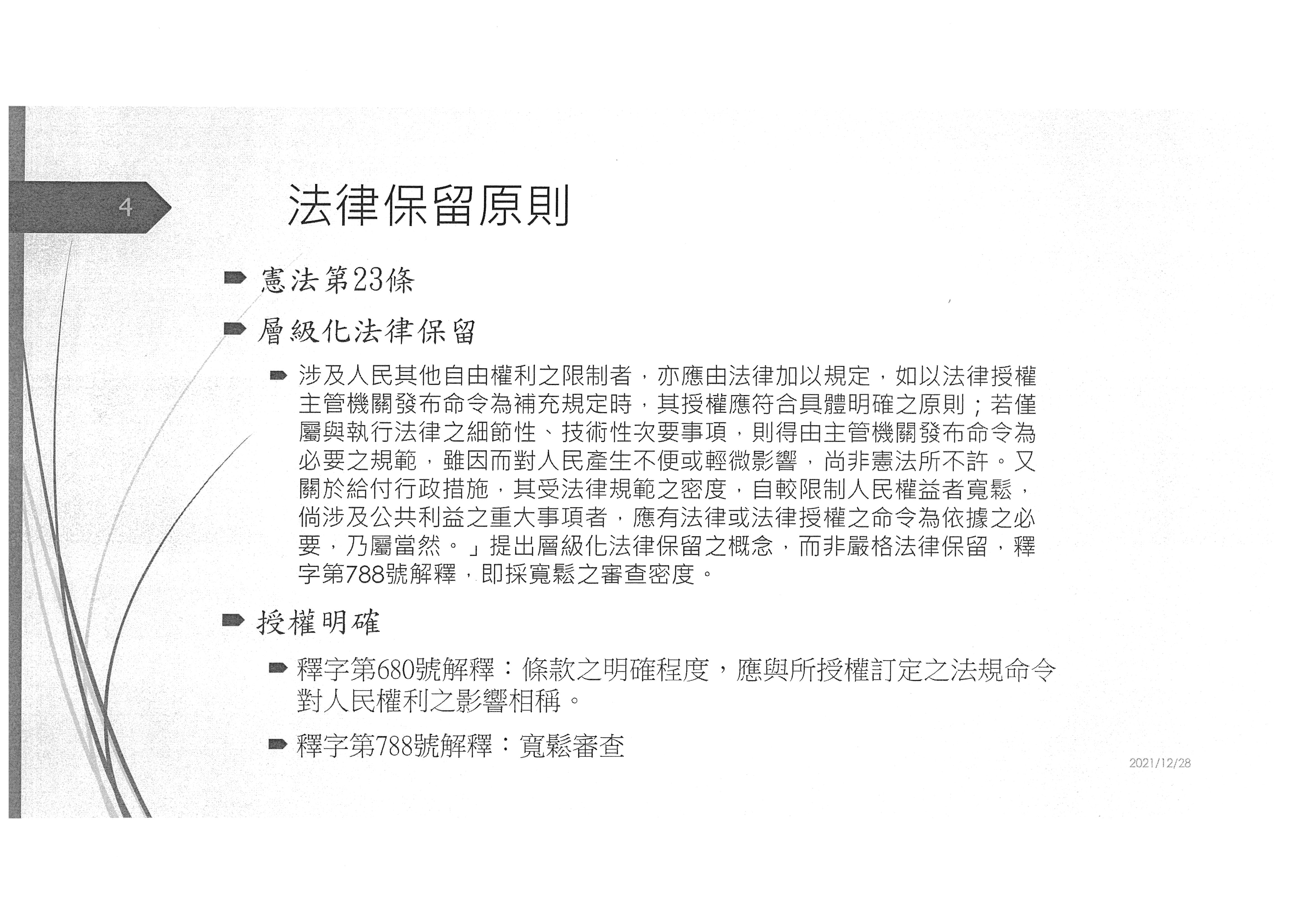 在法律保留部分,今天很多先進都提到釋字第443號解釋,這裡的層級化法律保留就是從釋字第443號解釋導出來的,立法理由裡也引用這一點。但是到了後來,我最近查了一下比較近的一項解釋──釋字第788號解釋,就採用比較寬鬆的審查密度來看這個問題。也就是說,對於法律保留、授權明確這件事在釋字第680號解釋之後就稍有放寬了,這點會對應到人民權利義務受影響的程度到底有多少。