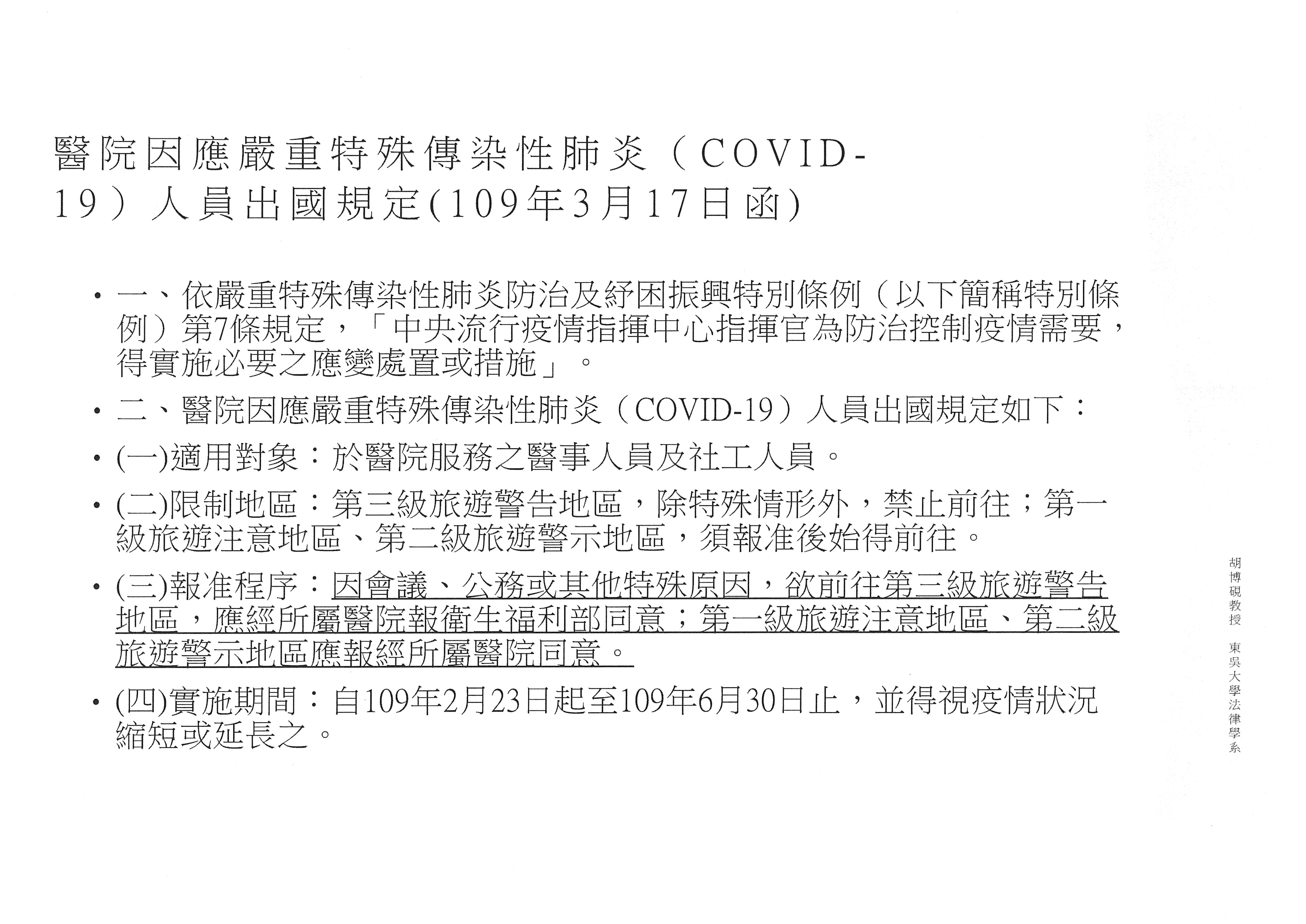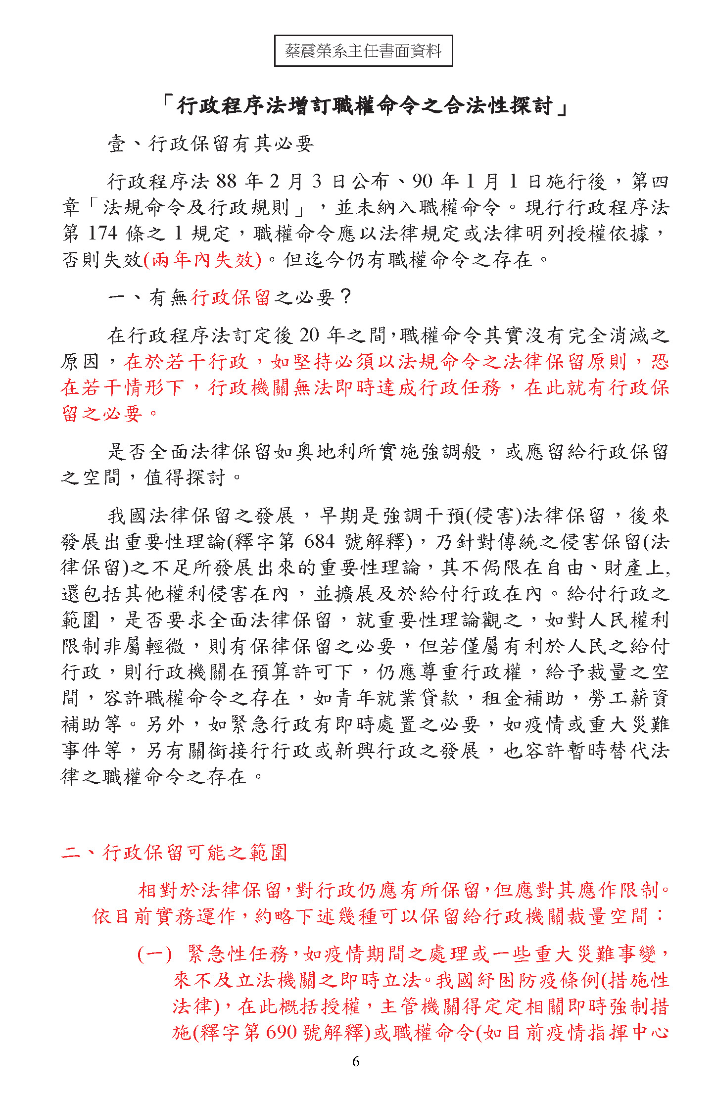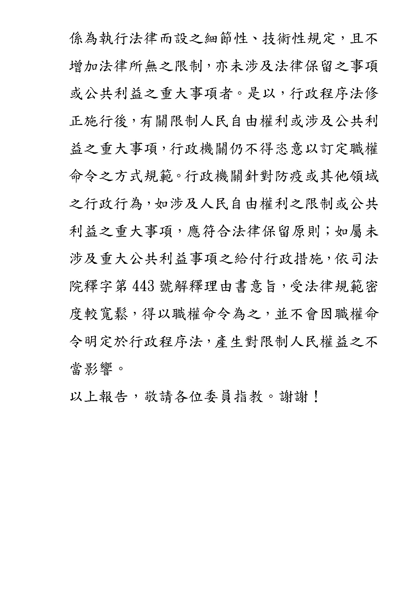蔡震榮系主任:主席、各位委員。今天針對這個議題,我就實務上的一些意見提供給各位參考。大家也知道,最近因為疫情的關係,所以有一些給付行政,包括因疫情關係而提供的一些紓困措施,還有勞動部的失業補助,以及衛福部及各機關發放的補助,有很多都是職權命令,這個是有它的必要性。所以雖然剛剛主席宣布過,我們當時在訂定行政程序法的時候,只有允許兩個──法規命令跟行政規則,就是內跟外,但是在實務的操作上,雖然行政程序法第一百七十四條之一有關職權命令的失效期限,在89年是限定一年,後來延長到二年,但是迄今職權命令仍有存在的情況。我剛剛講的這一種給付行政,又不干涉人民的權利,在各部會之間都明顯存在,所以從法律保留的原則去發展,我們通常講法律保留是有所謂的全面保留或是部分保留,如果要求所有對人民發生效力的全部都要法律保留,這叫做全面性的法律保留,但是事實上我們如果去觀察,在疫情期間有緊急狀況的情形下,或者是剛剛講的給付行政的情況下,對人民有利的、補助人民的,像是失業補助者或是有救助必要者,這些大部分都是在沒有授權的情況之下,行政機關以自己的預算就可以發放補助,所以他們會訂定一個類似職權命令的規定,像這一次疫情限制醫護人員出國,還有其他各項限制,這個有一點類似職權命令的性質。我自己個人有看了行政院所提出的版本,其中是有職權命令的規定,但是這個法規範仍然有所不足。
