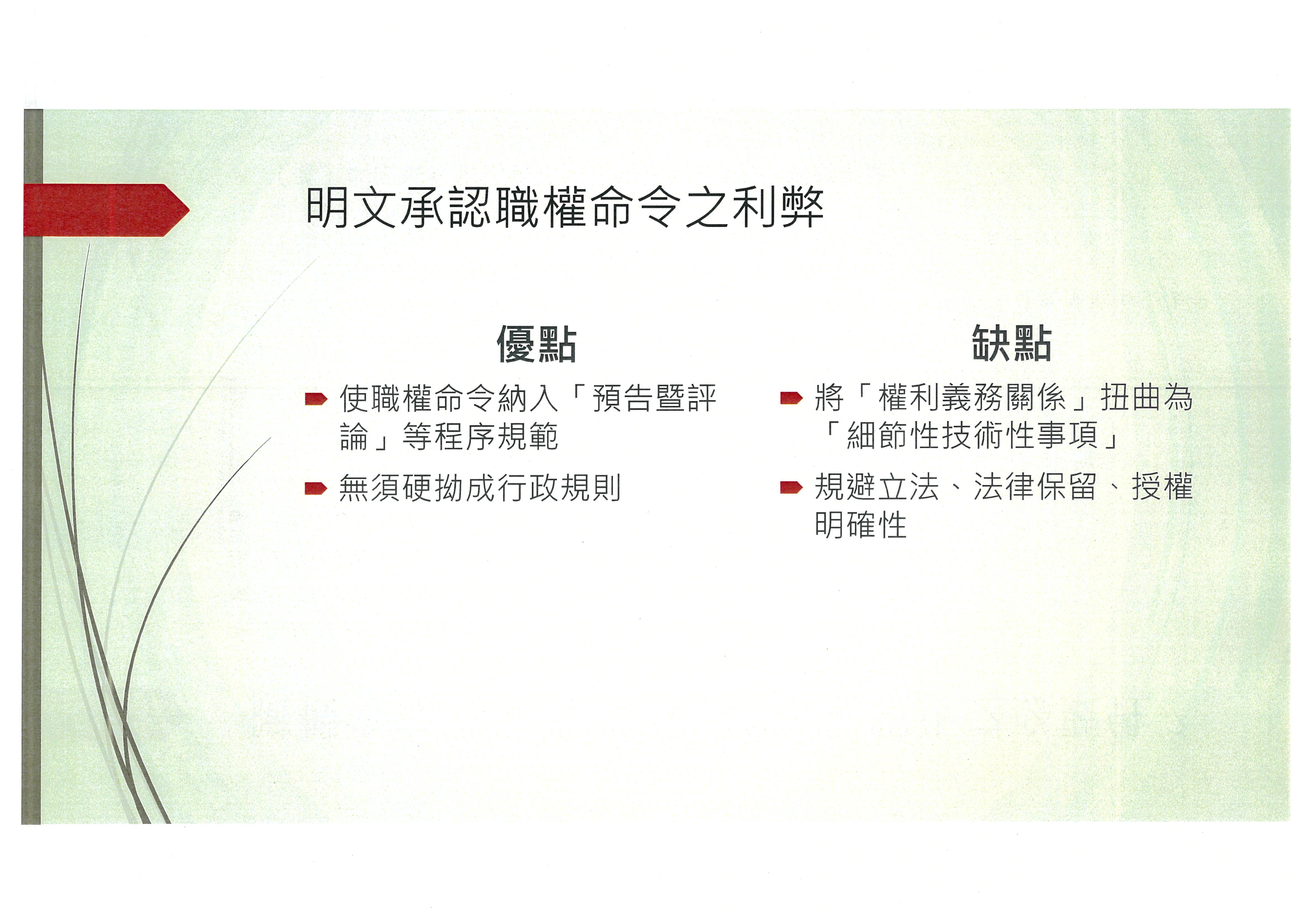 我覺得就算要讓職權命令存活,但認真檢討一下,它的空間其實並不多,所以要明文承認它嗎?我覺得優點是反正它都存在了,至少讓它有notice command,就是草案先公告一下,讓大家可以評論,人民的參與多一點,你就不用拗成行政規則了。但缺點是,反過來講它會不會有規避立法的問題?明明是權利義務的事項,你硬說它是細節性、技術性?
