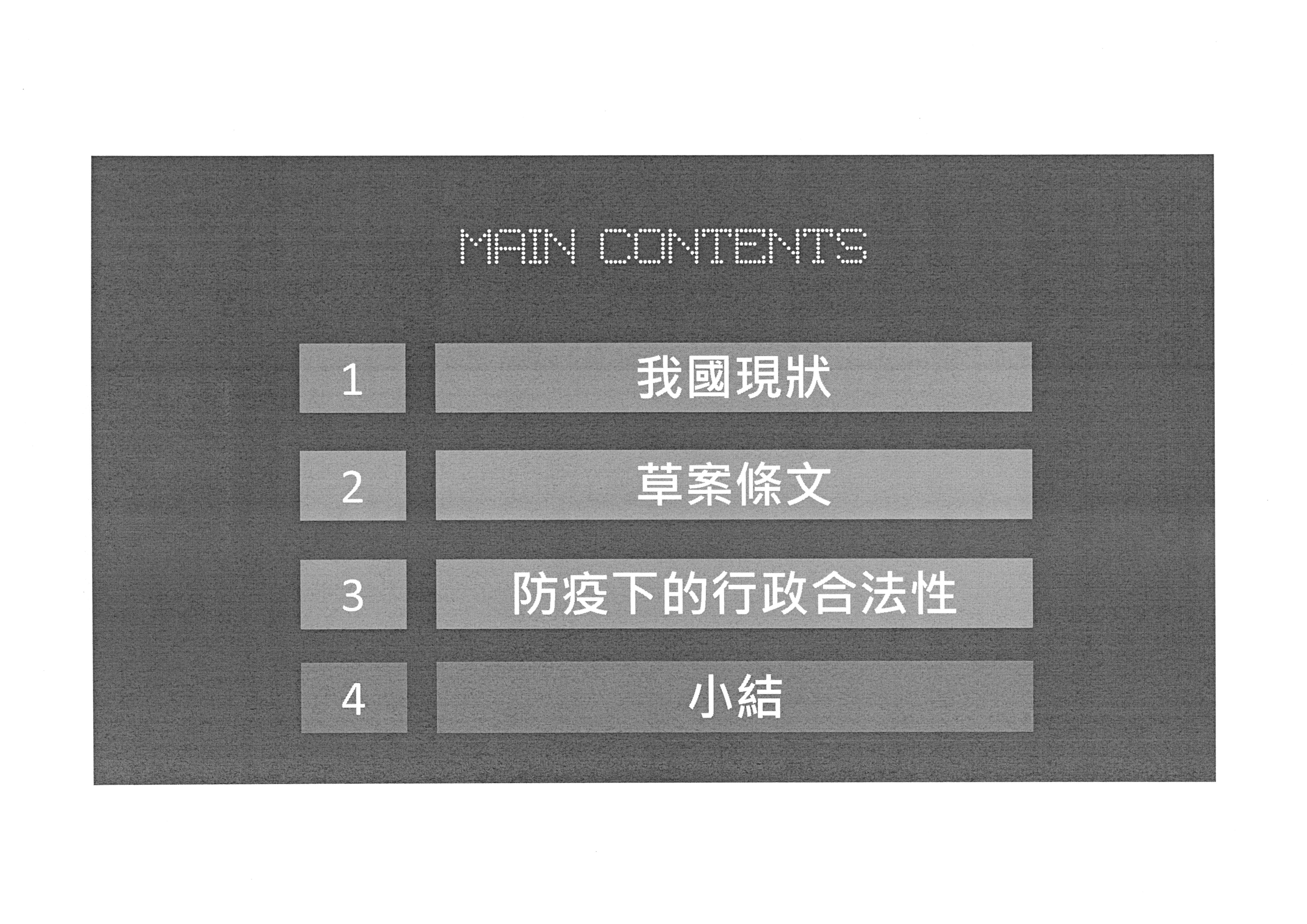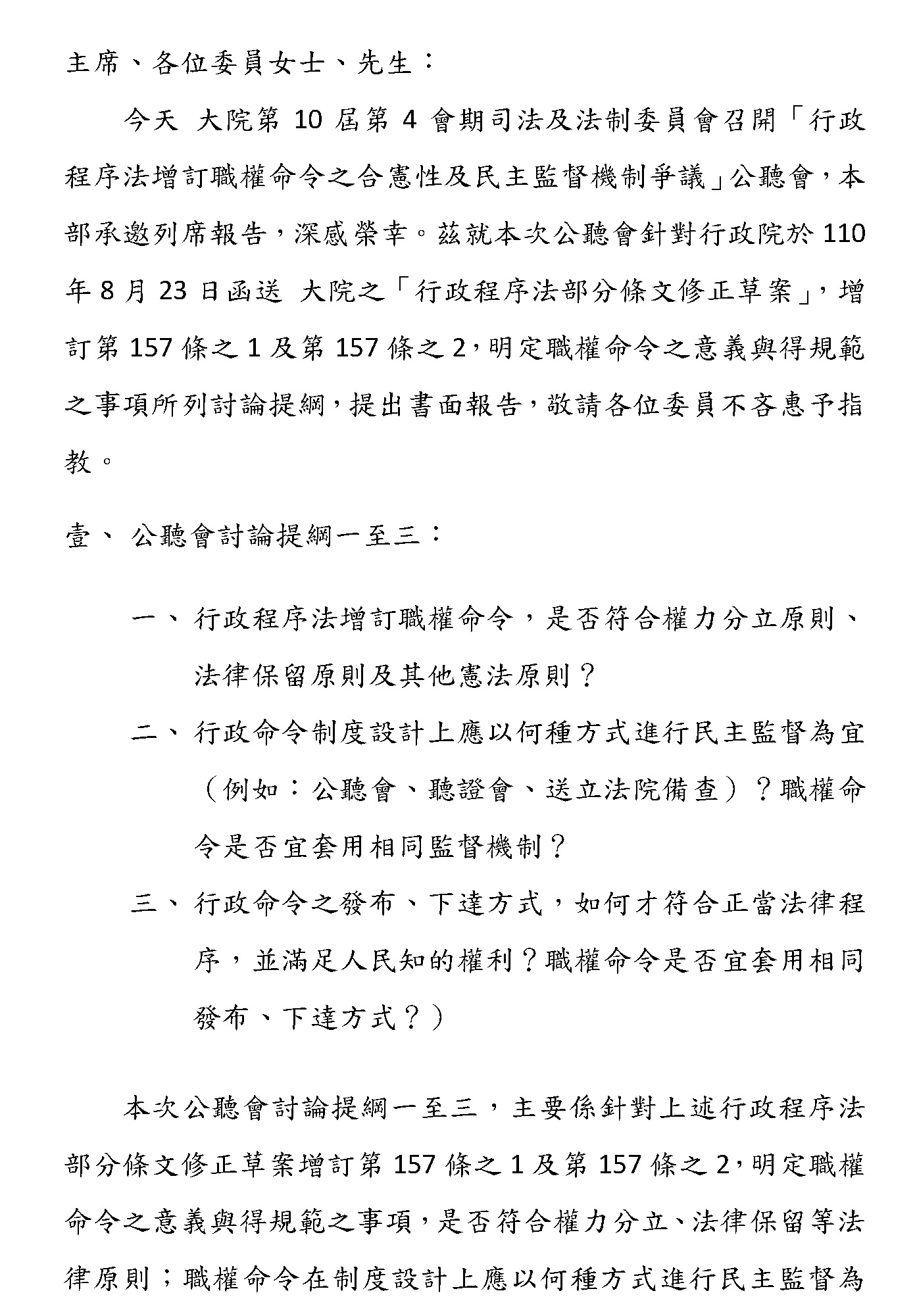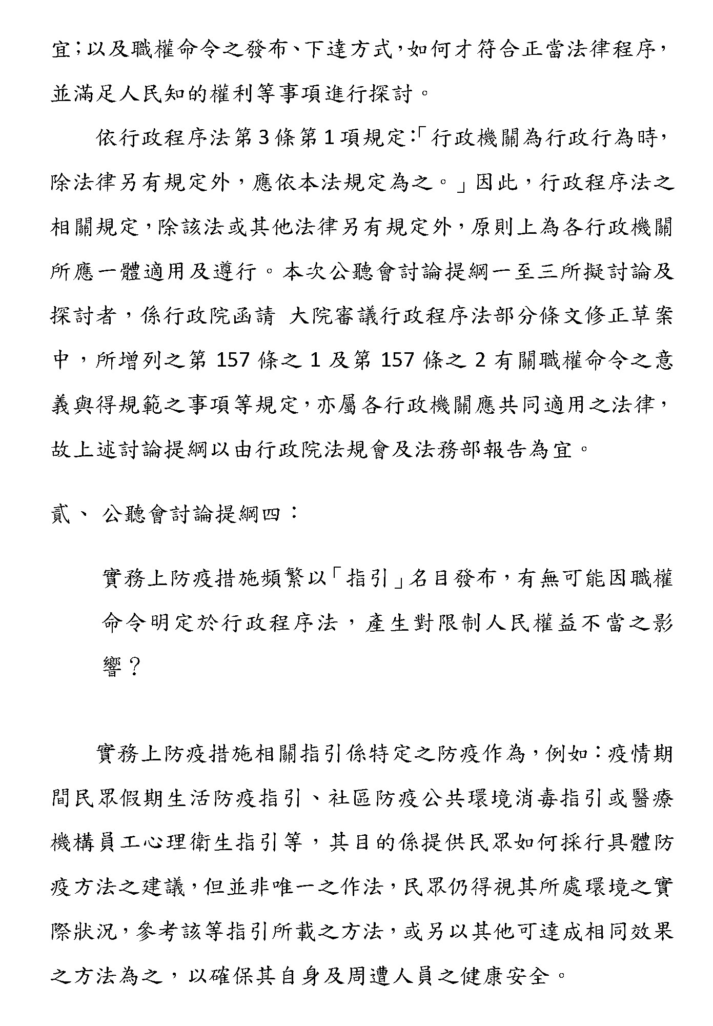 石次長崇良:主席、各位先進、各位與會代表。有關今天在公聽會討論的提綱四,特別討論到在疫情期間所發布的各項指引會不會侵犯、限制到人民權益,與目前行政程序法擬修法的職權命令部分之關聯性,我們做以下的說明。