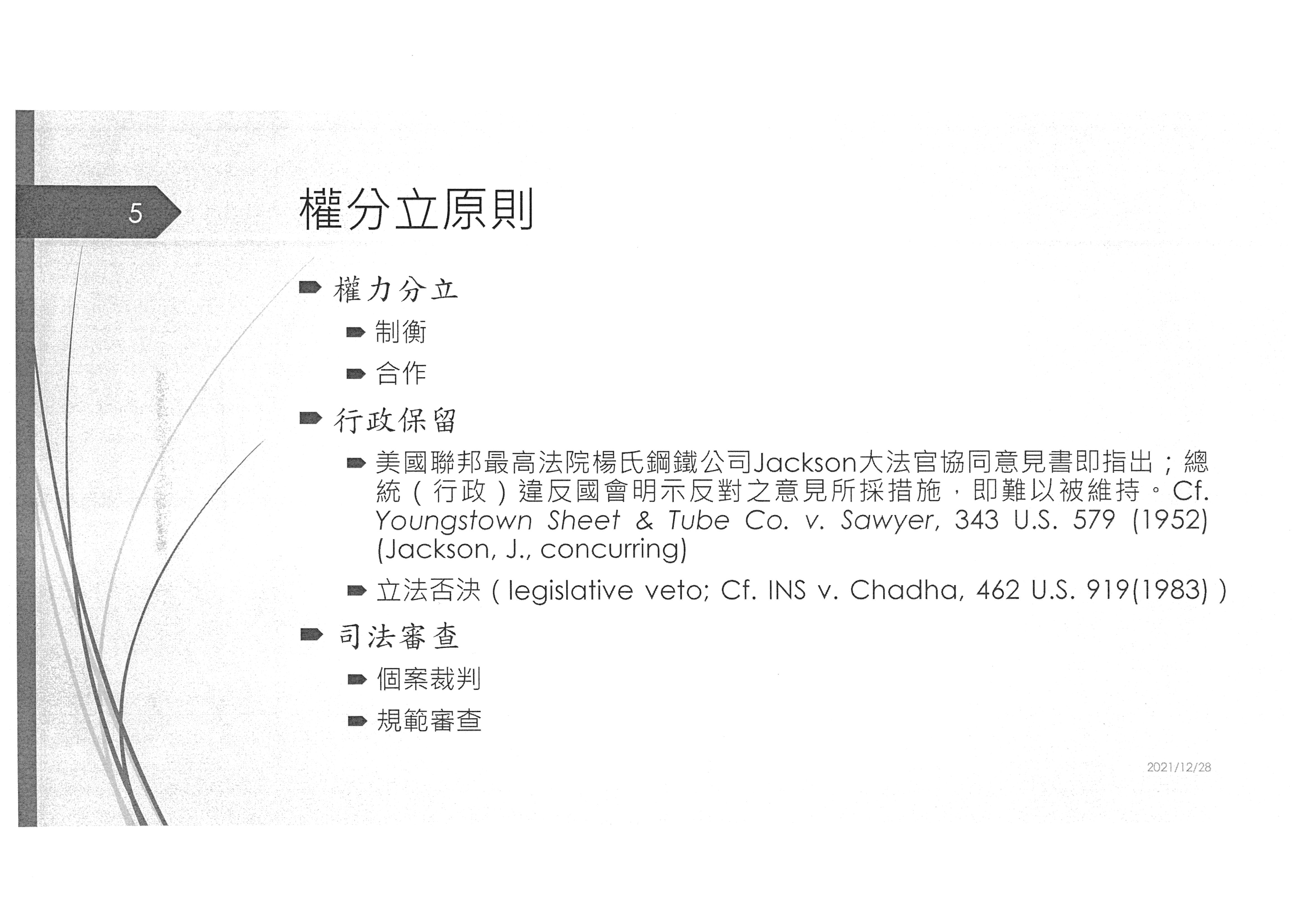 我今天要向大家報告的第一點是有沒有違憲爭議的問題。其實要談是否違反憲法條文或基本原則等,或許比較難看得出來。如果從美國法來看,若是要達到違反權力分立,一定要侵害到立法權或侵害到司法權等等,所以美國除了法律保留之外,還有行政保留,我剛才已經向大家報告。就這點來看,其實就看法律設計上、憲法解釋上要怎麼做到平衡。