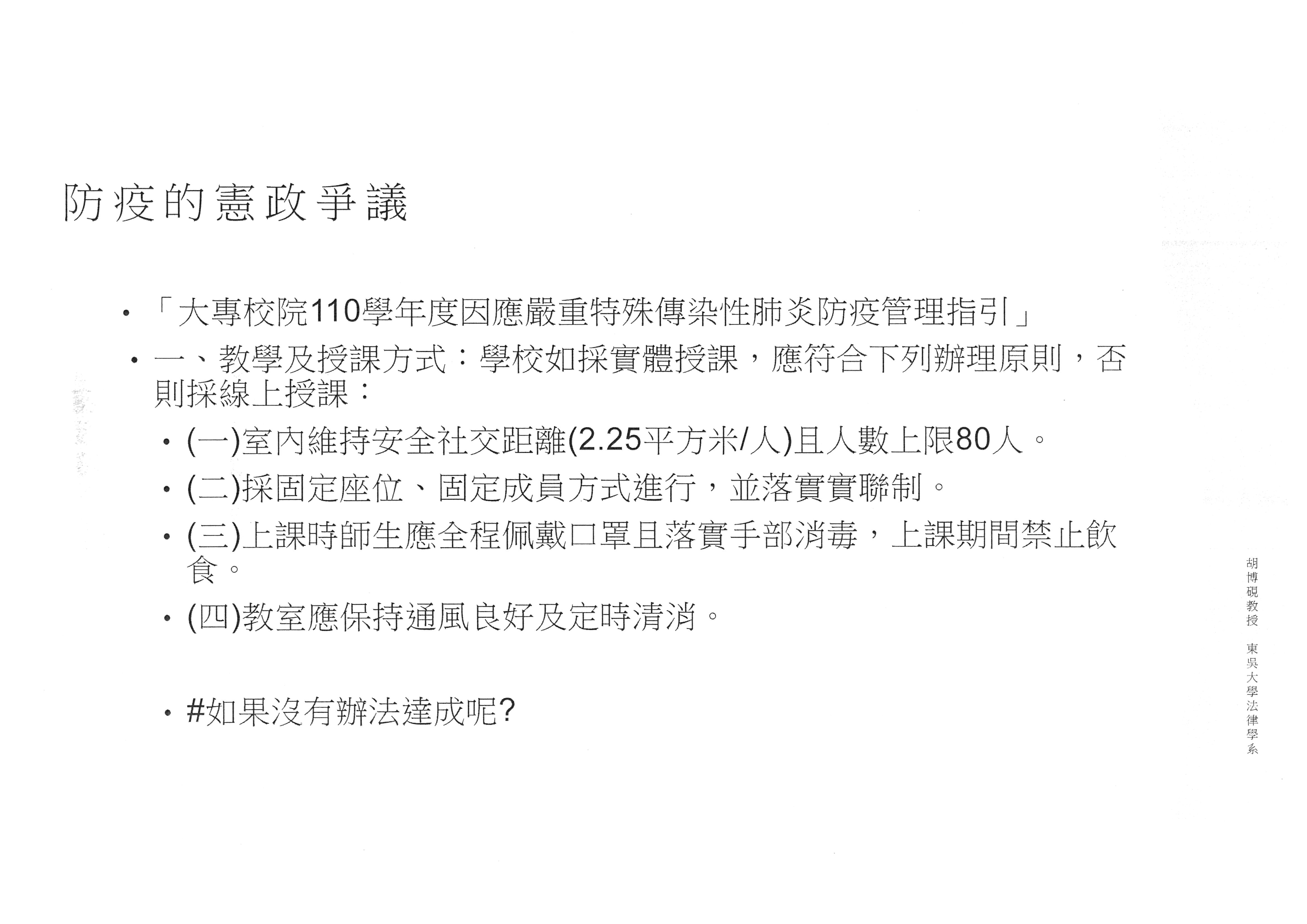 當然,今天邀請的專家學者有對於職權命令持保留態度者,也有基本上肯認職權命令的存在者,但認為應該加上一些條件限制,比如我印象比較深刻的,尤其可以呼應現在行政機關所面臨的行政事務性靈活多變狀況,需要隨時去應對這個多變的社會,所以像廖元豪老師、蔡震榮老師提到在緊急性任務時,應該可以賦予行政機關訂定職權命令的空間,但是廖元豪老師特別指出來,應該要訂定落日條款,我覺得這是可以再去呼應陳律師提到的,應該在事後讓那個法規能夠明確化,就是透過一陣子的執行之後,如果覺得有必要提升到法規命令的位階、甚至是法律位階時,可以透過這樣的程序,讓職權命令在法律上獲得一個更好的地位保障。以上。