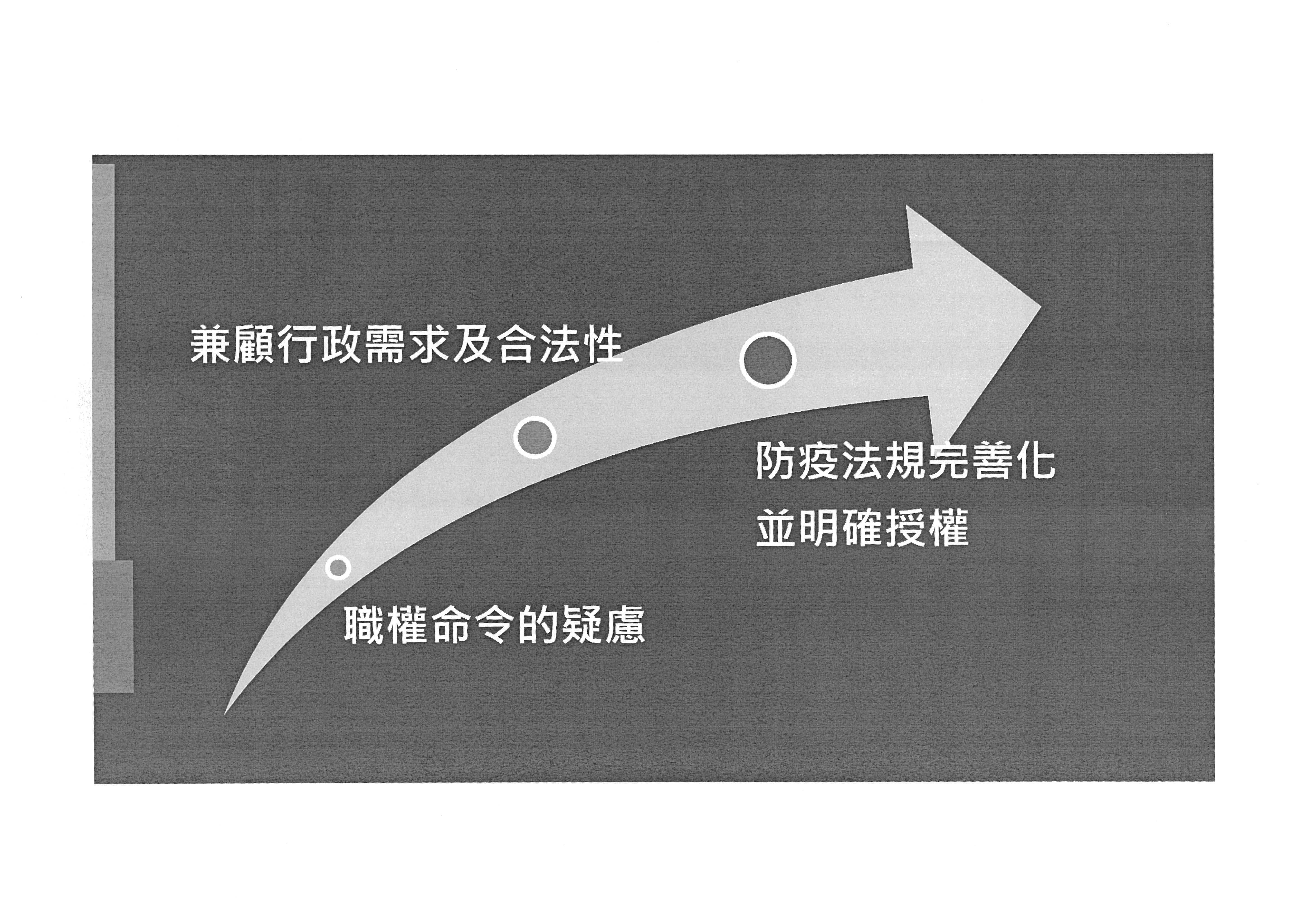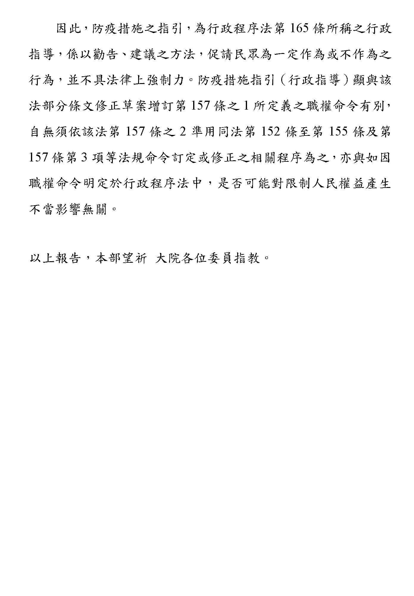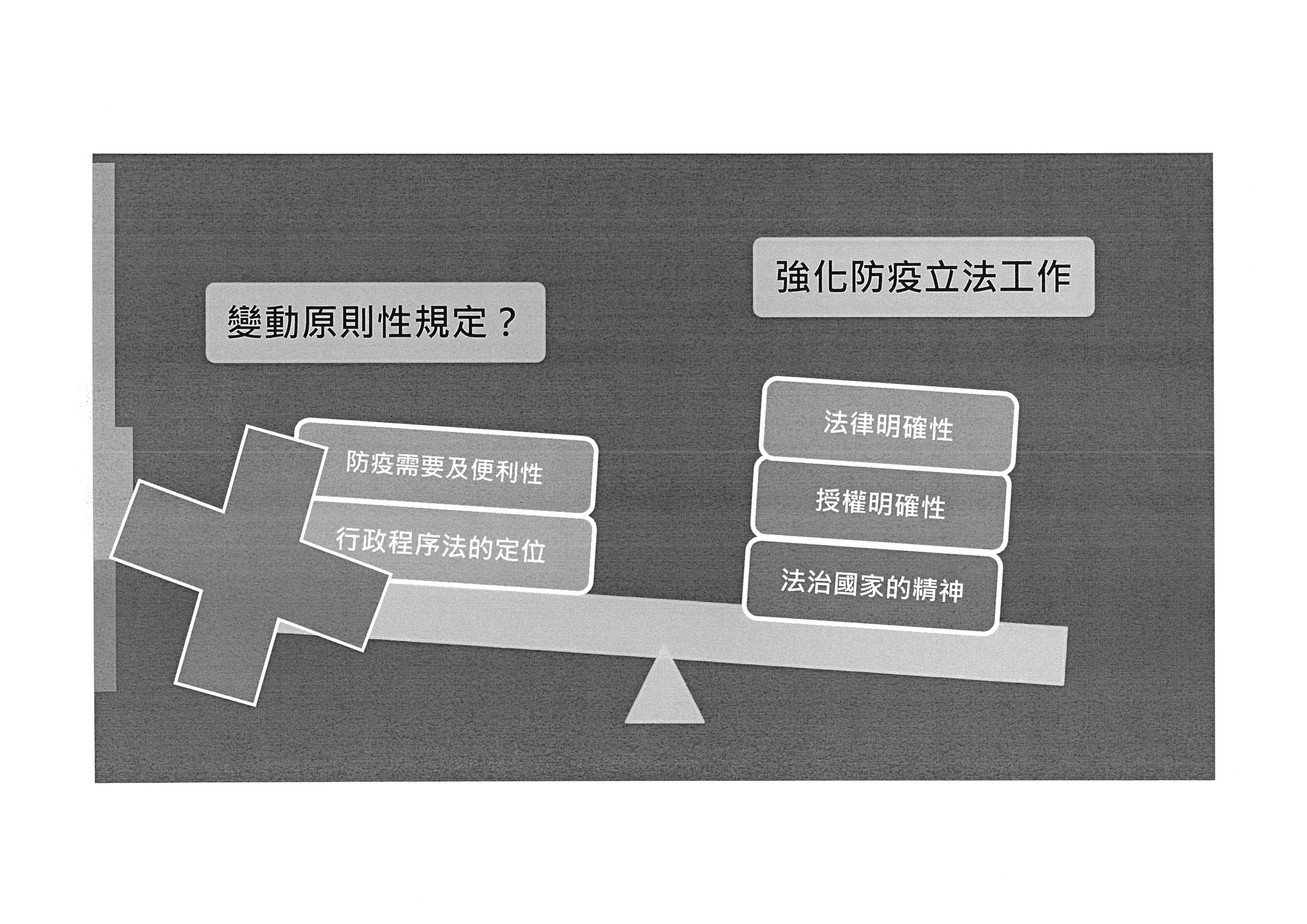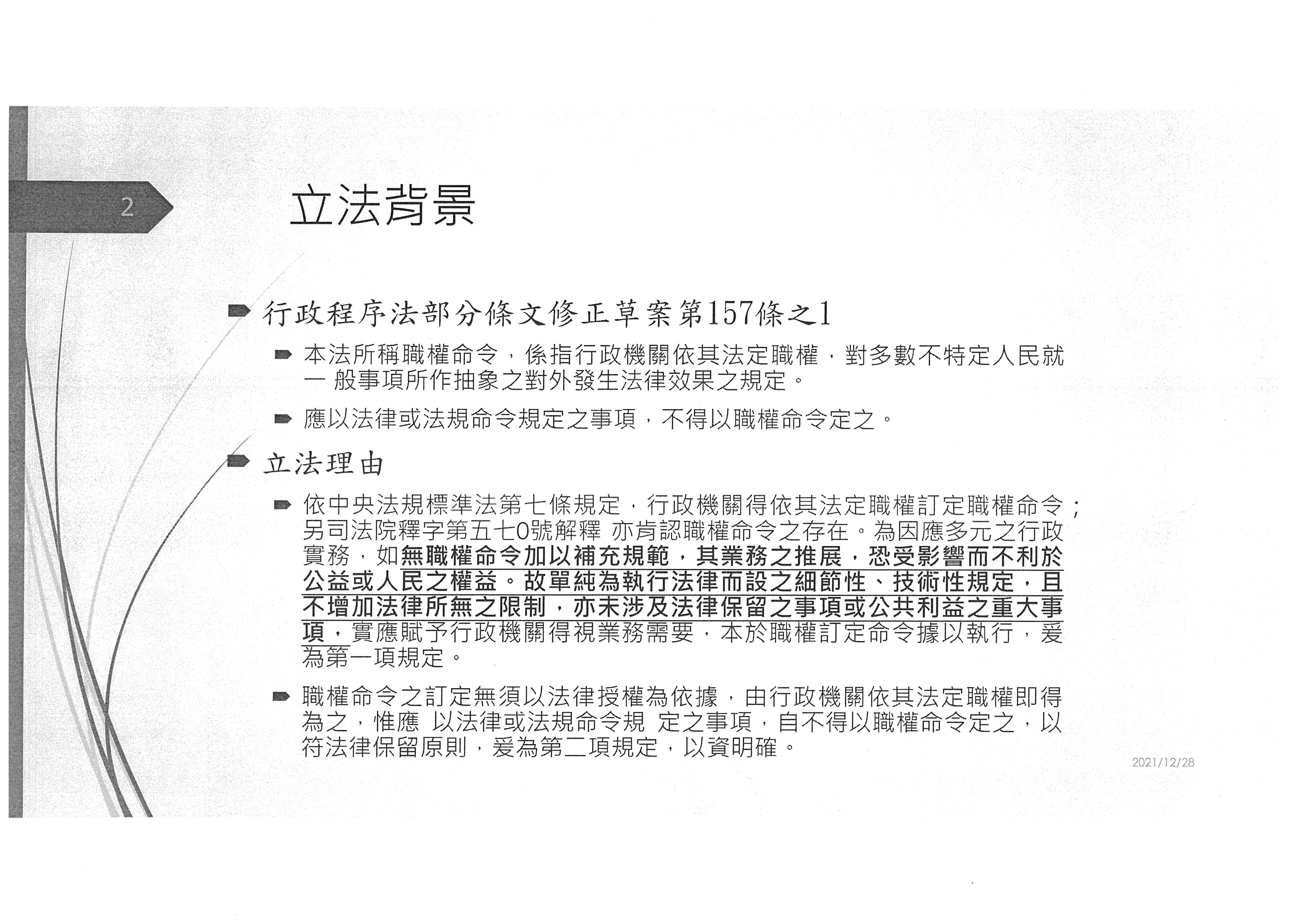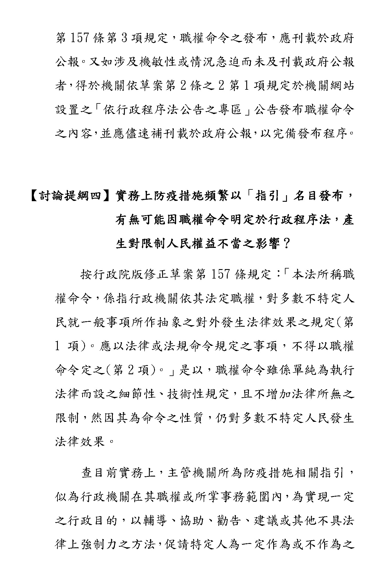 就職權命令的存在性如何的問題,96年12月法務部即組成行政程序法的修法小組,針對施行將近10年以來的行政程序法有哪些需要檢討之處,在96年組成修法小組,經過多方討論,我們不是閉門造車,找了專家學者及行政機關,把職權命令存廢與否納入討論。後來是決定職權命令仍然有存在的必要,而且把它明文化,在106年我們就報行政院審查,所以並不是為了這兩年的疫情才提出職權命令的部分,就這點外界可能有某種程度的誤會,我們先說明當時的狀況。