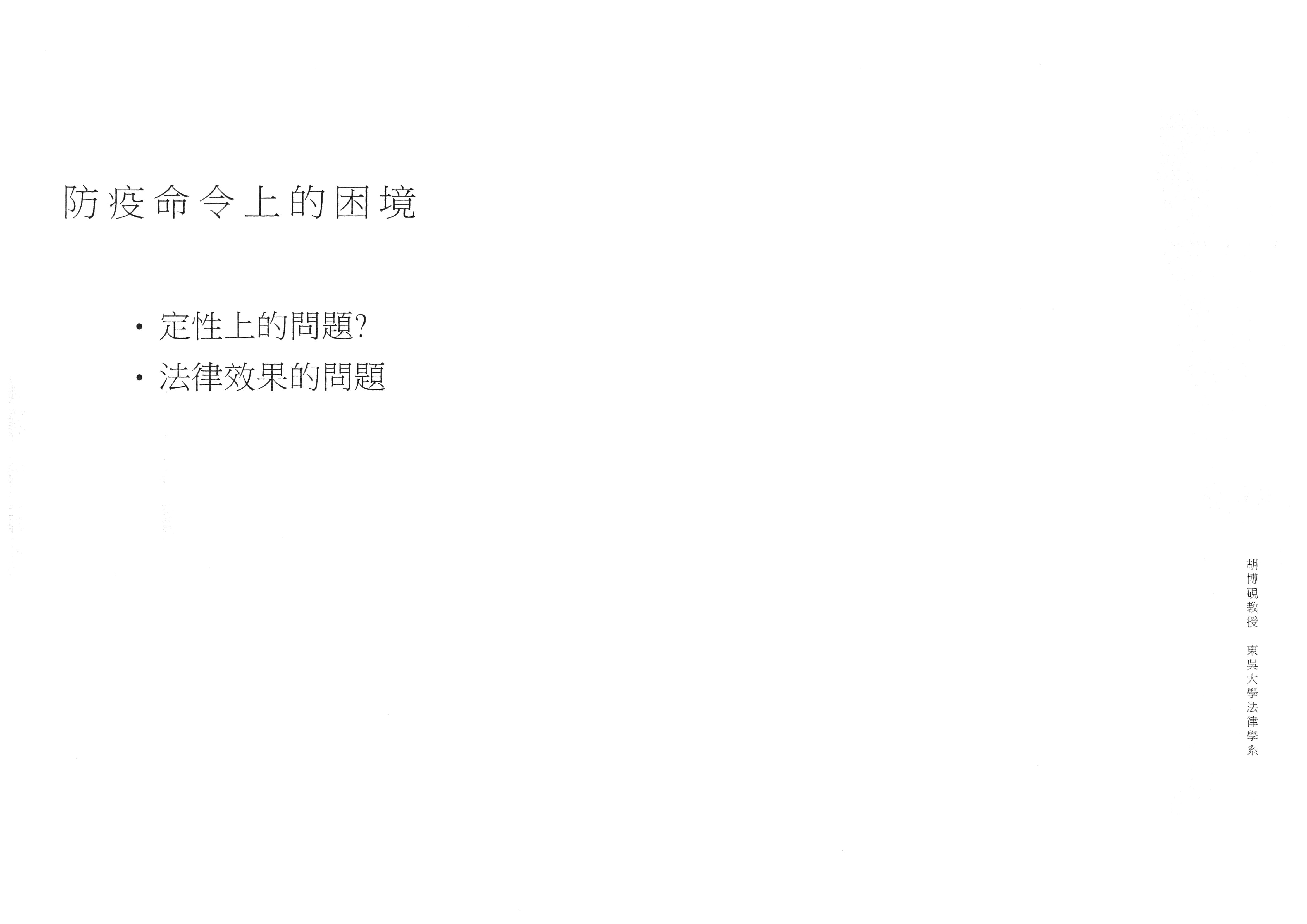 再來關於職權命令的定位,我想大家都很熟悉,吳庚大法官在他的教科書裡面提到所謂的三個定論,第一個就是你要有管轄權,第二個必須是執行某個法律所必要,第三個是只能夠細節跟技術的範疇。事實上許宗力院長的見解可能更開闊,他覺得不需要一定是在執行法律下,甚至於如果有一個緊急的情事需要因應的話,也可以用職權命令。我個人是可以部分贊同許老師的意見,就是說,我們固然不侷限在所謂執行一個法律的範疇下去訂定職權命令,這個不一定是在執行法律的情況下,但也不能夠動輒說我現在有一個緊急事項,因為現在來不及立法,我就頒布職權命令,我認為這個見解是應該要更審慎。