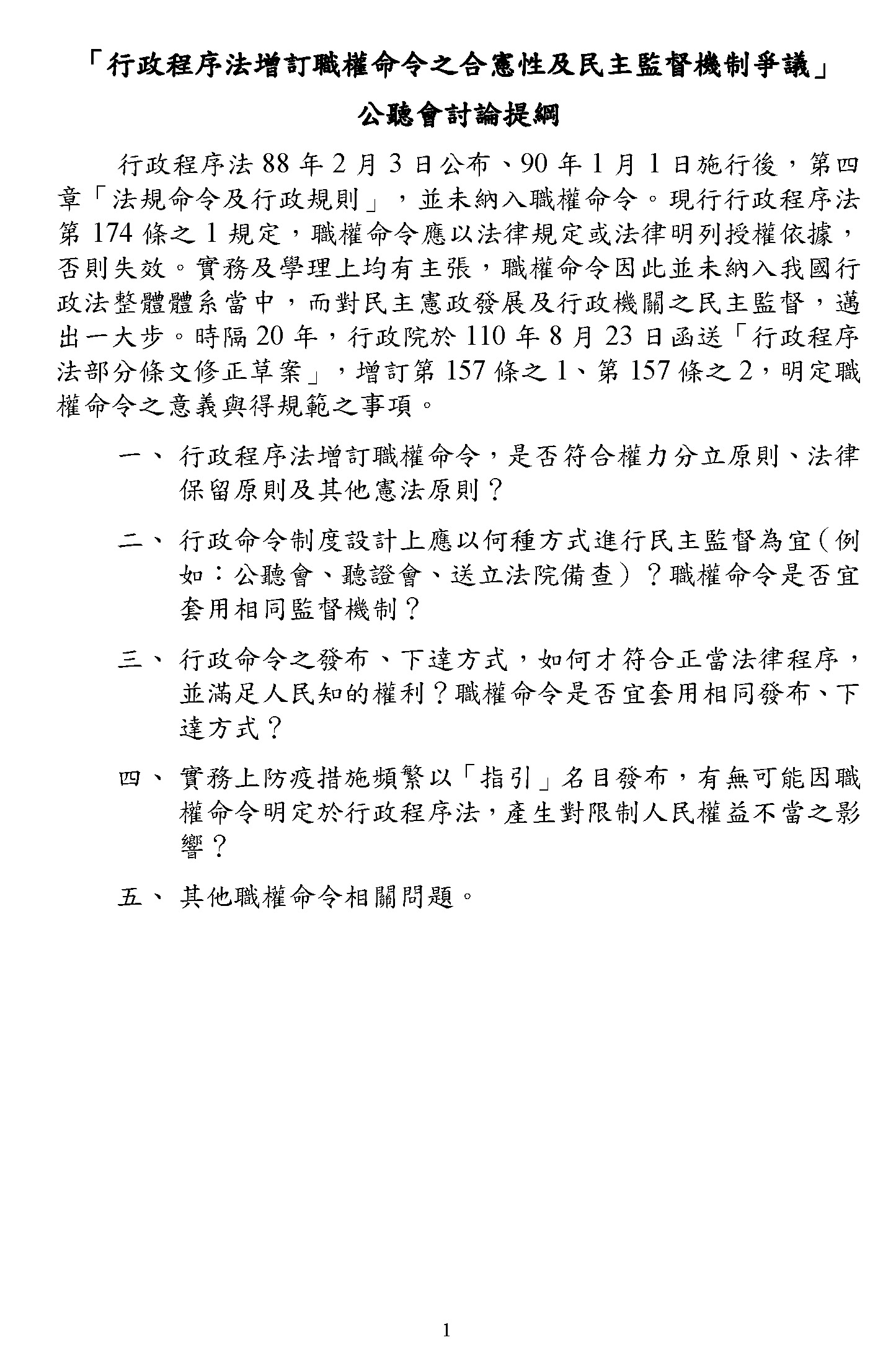 「行政程序法增訂職權命令之合憲性及民主監督機制爭議」公聽會討論提綱: