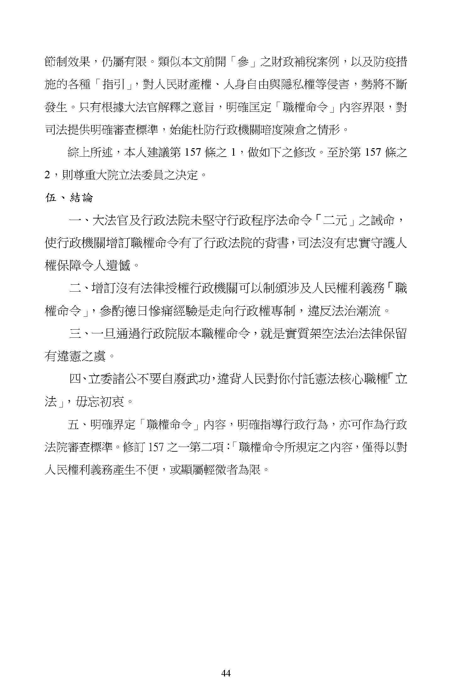 今天職權命令要這樣訂,我認為明確界定職權命令內容、明確指導行政行為,也可作為行政法院的審查標準。今天陷入這個結果,就是因為內容不清楚,因此我認為應該增訂第一百五十七條之一第三項:「職權命令所規定之內容,僅得以對人民權利義務產生不便,或顯屬輕微者為限。」。