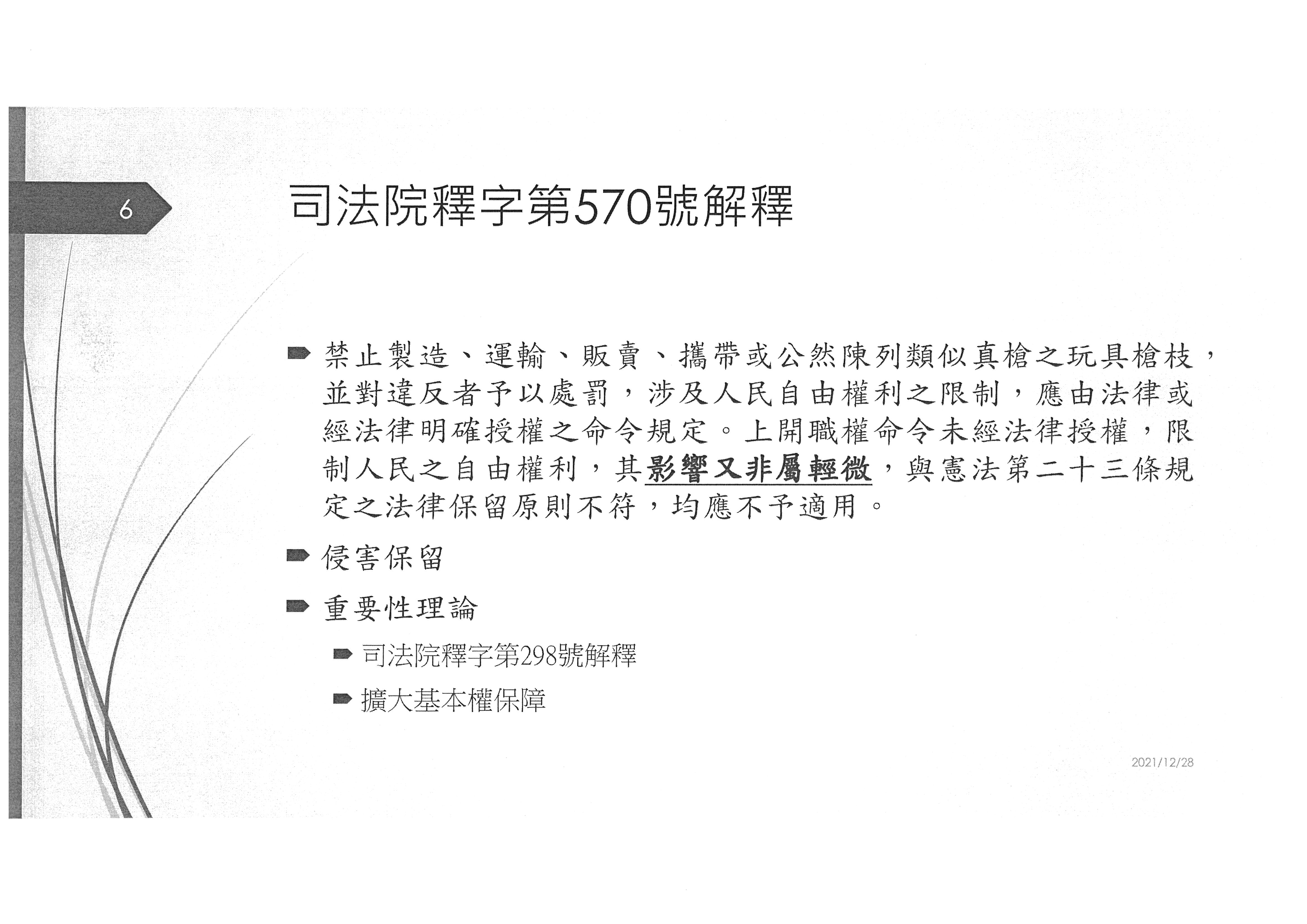 另外,在今天的議題中也提到釋字第570號解釋,該解釋提到滿重要的一點。我們要知道釋字第570號解釋是在民國92年作成,當時行政程序法才剛剛施行,所以我們從這項解釋中可以看到因為該法才剛施行,職權命令本身雖然可以不受影響,但仍然不符合法律保留。其實這比較屬於侵害保留的概念,所以就導向影響非屬輕微的看法,也就是我們一般所講的重要性理論。重要性理論其實也是我覺得在這次修法中比較麻煩的,但我後續再向大家報告。其實在司法院大法官釋字第298號解釋裡就曾經提到,這種作法在過去都是為了擴大基本權的保障,而不是縮小基本權的保障。