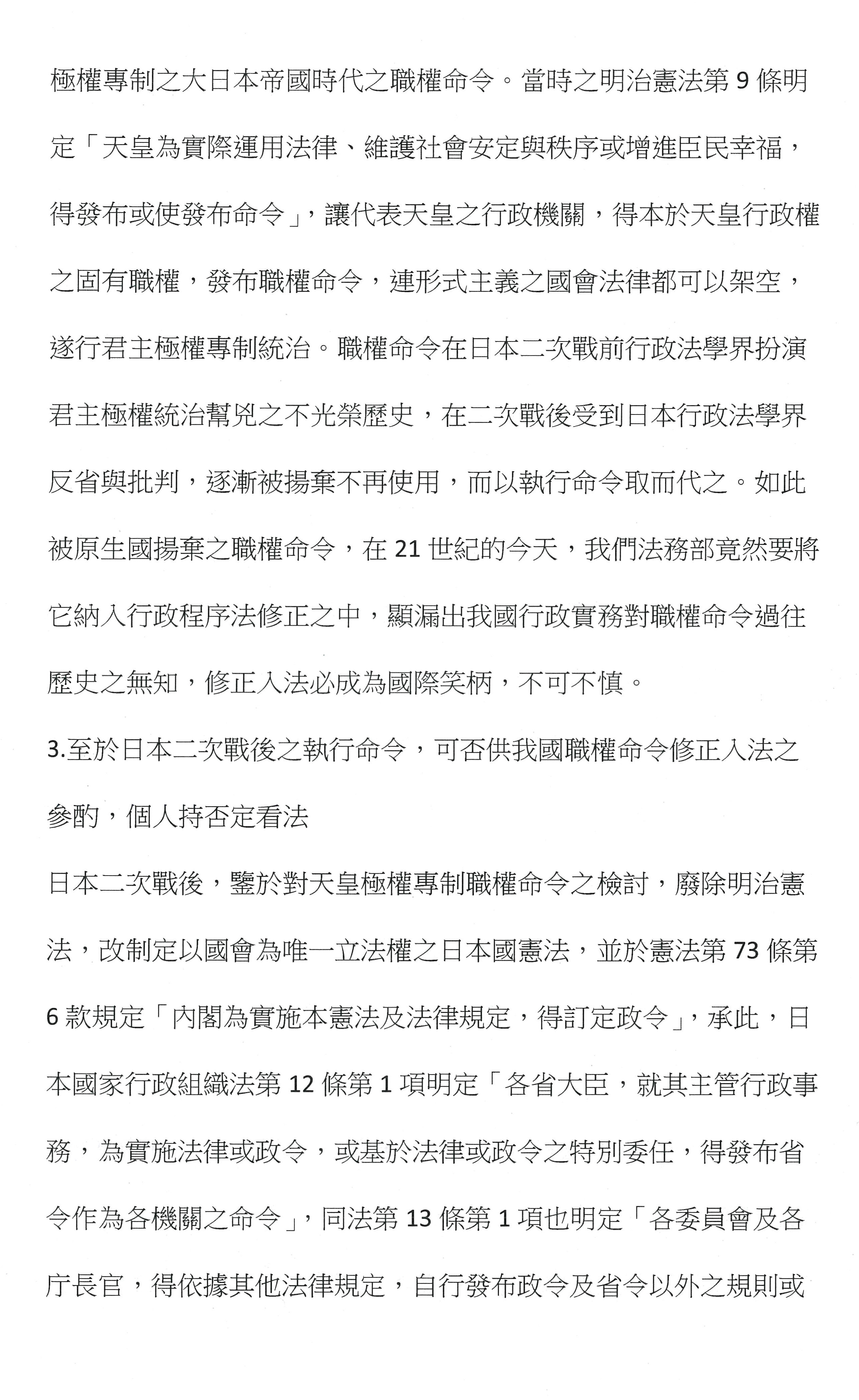 我再舉一個例子,這是日本的案例,日本受到德國的影響很大,它在戰後也用了法規命令與行政規則,因為它是直接從德文翻譯過來的,跟我們的稱呼完全一樣。不過他們基於事實上的需要,也有很多職權命令這樣的東西出現,它是稱為一般命令,譬如說健保的費用就是最典型的,但是它仍然把這些職權命令視為行政規則,不讓它成為法規命令,到現在為止還是這樣。他們這樣做有一個好處,就是讓這些真正有需要的職權命令不敢太過恣意,不會變成首長說這樣就是這樣,沒有人敢反對,他們不會這樣子,為什麼?因為它後面要受到司法的監督,倘若過分了,就會被宣告為違憲。因此,他們在訂定職權命令的時候,這些行政機關、這些首長都會格外小心,因為事後這個東西假如被宣告不行、違憲的話,他們要負的責任是很大的,要負的責任非常大。所以這種方式在日本,到目前為止還是維持著,雖然他們跟我們一樣,有很強烈的職權命令需求,但是他們還是把它視為是行政規則,這裡有一個好處,就是行政機關會謹慎小心。
