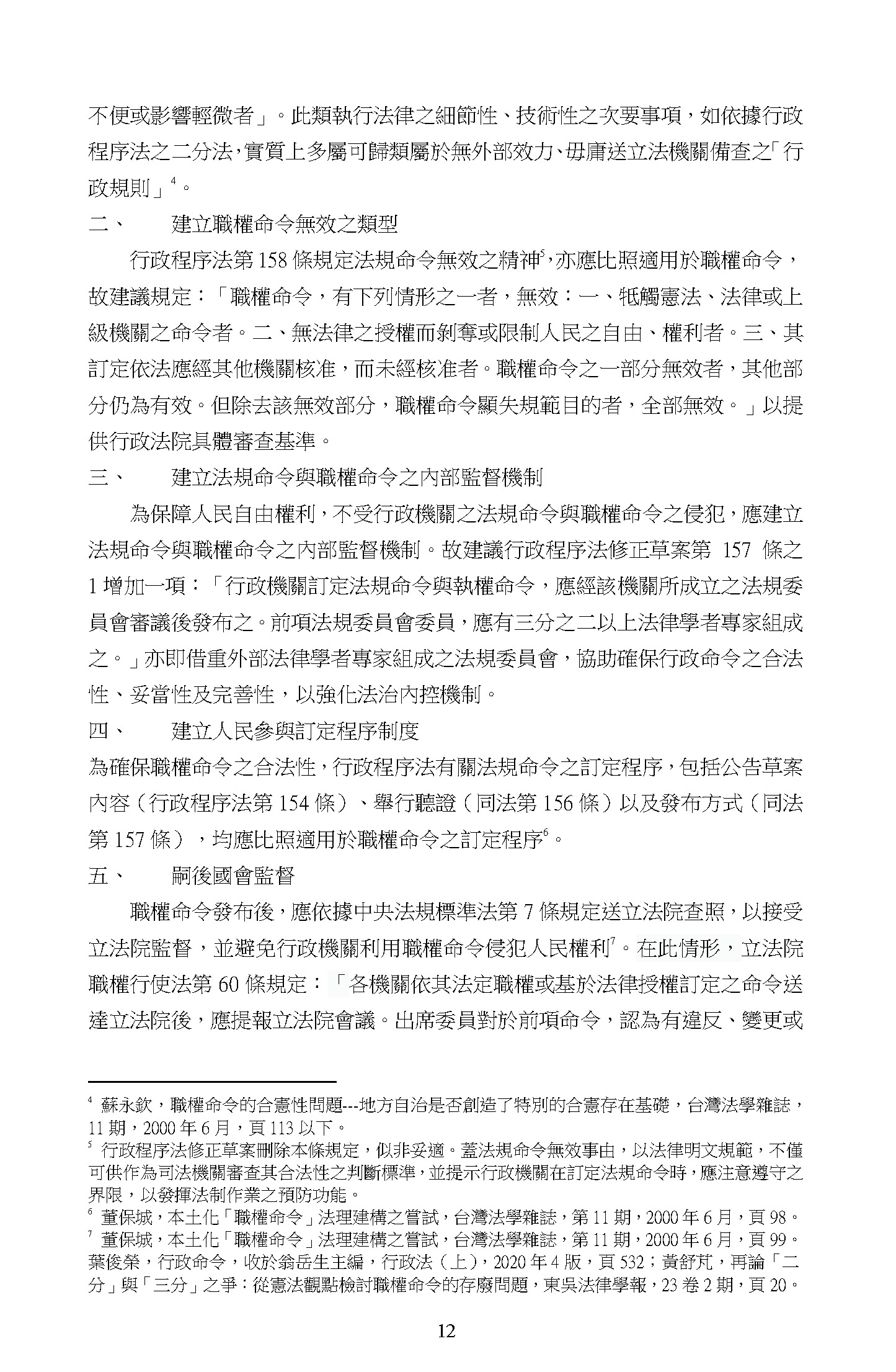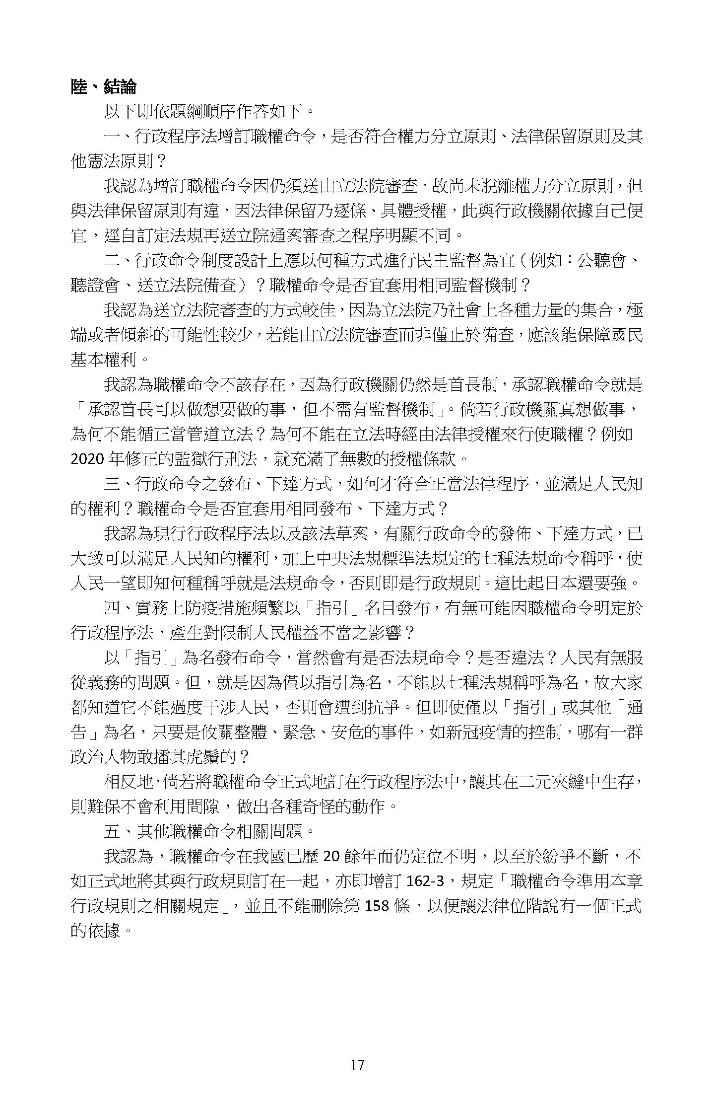 最後,剛剛陳清秀老師也特別提到有關行政命令無效的規定,原本法規命令無效是有明文規定,但後來被刪除了。這部分我們是建議能夠維持,且職權命令之無效事由也可比照、準用,讓人民、執行法規命令的行政機關或者審判機關都有明確的指引或標準可循。以上說明,謝謝。