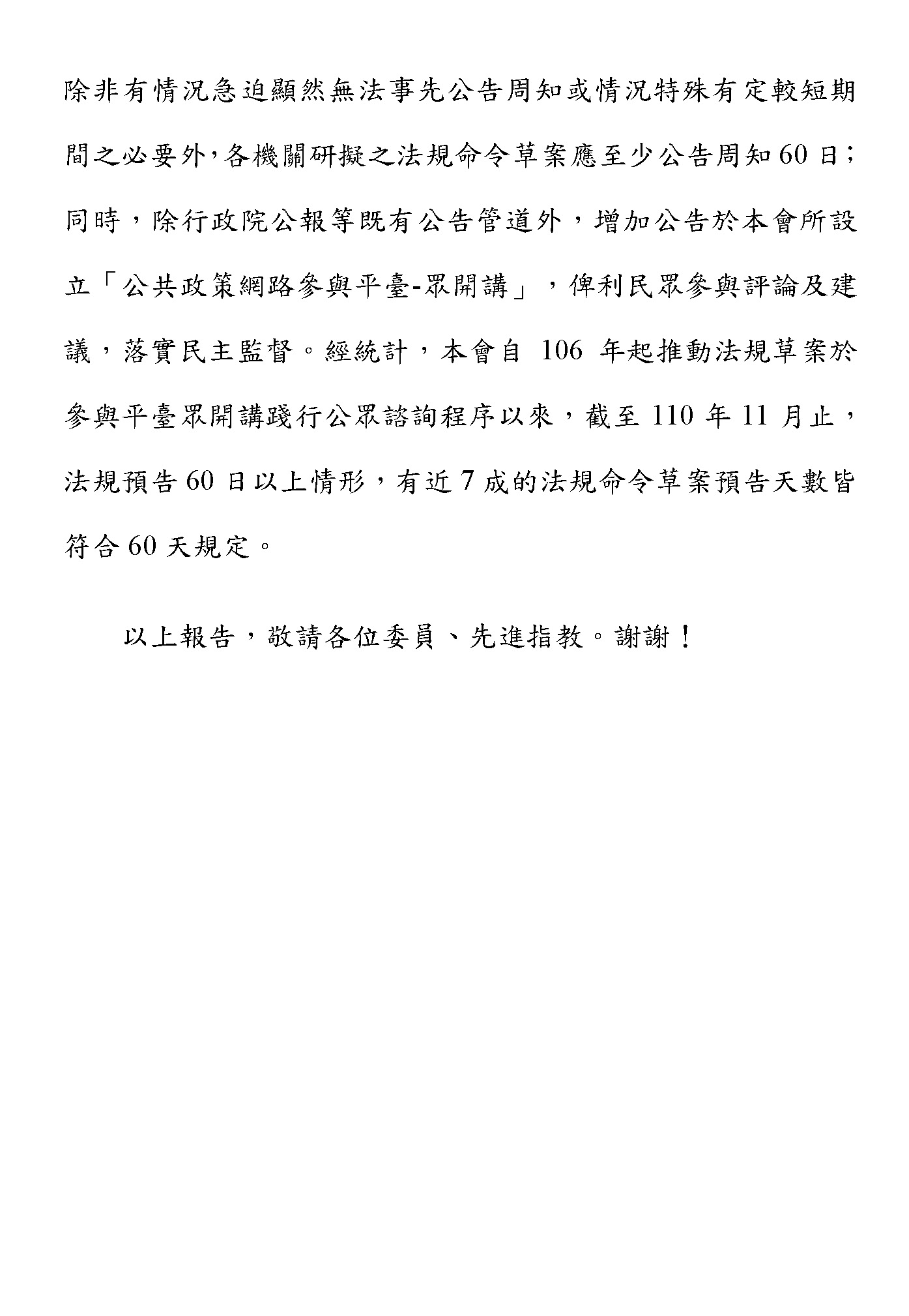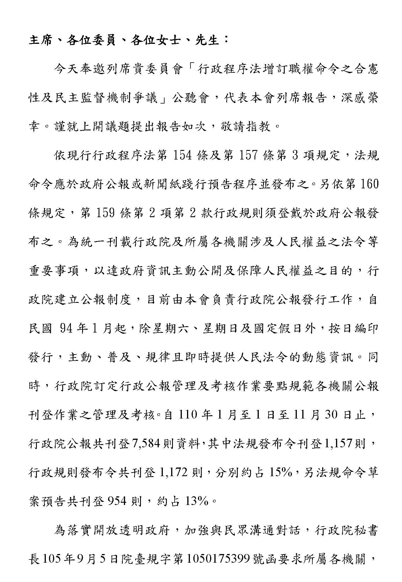 另外,今天學者專家有特別提到行政規則因為沒有發布,可能造成效力是否生效的疑義部分,這邊補充報告。今年1月到11月,公報上已經受理1,172則行政規則的發布,未來本會也會透過公報的考核程序,要求各機關在訂定行政規則時,都應該確實踐行法規發布的程序,在公報上刊登。另外再補充說明,從民國94年以來,本會負責公報發行的工作,目前公報的整個發行,除了週日及國定假日以外,都是每日發行,而且我們同時採行書面及網路版,所以確實已經達到將這些相關的法規資訊及執行普遍讓人民周知的效果。以上補充。