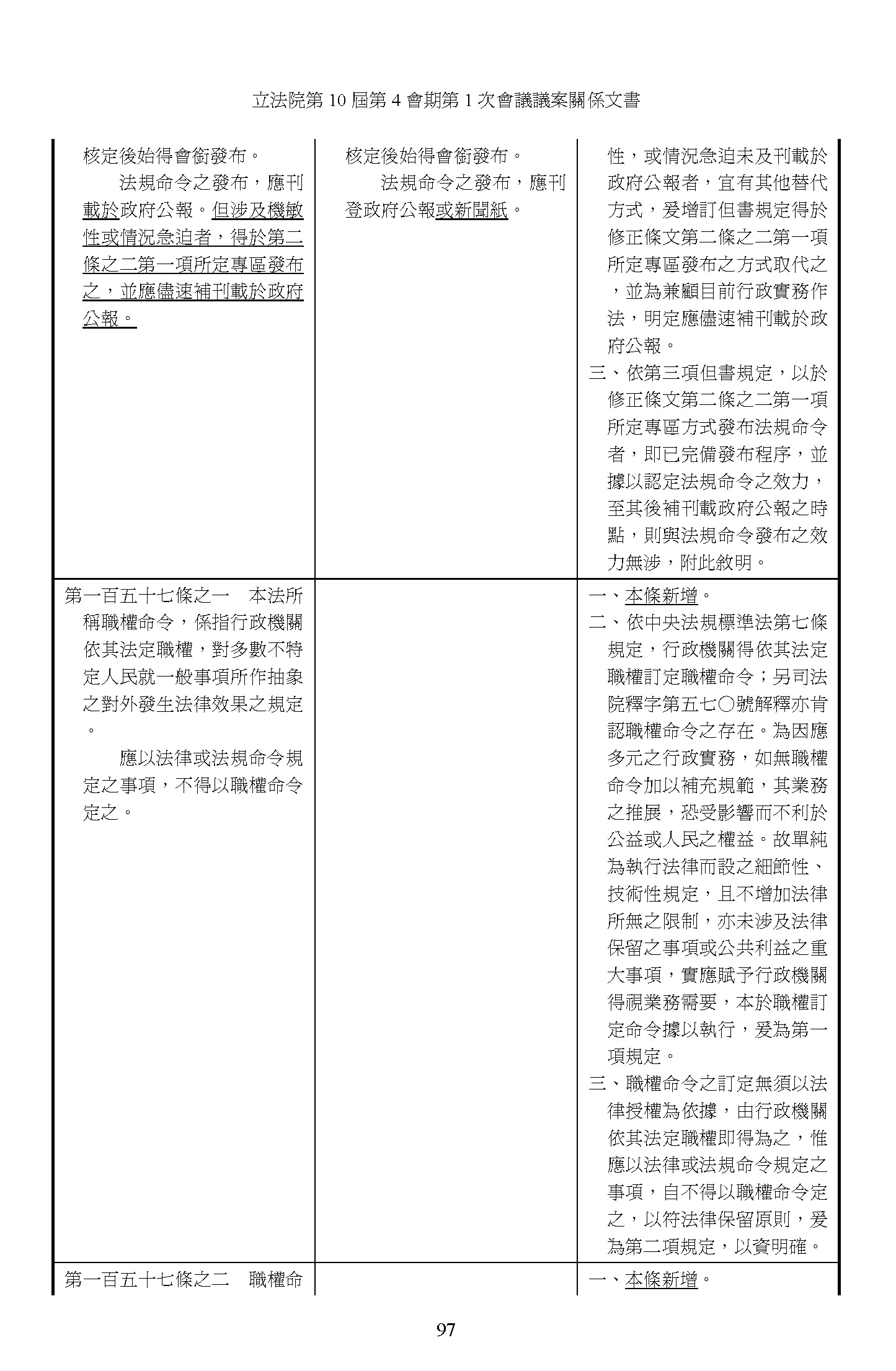 至於民主監督的部分,依照草案來看的話,是相當於中央法規標準法上的職權命令來做,我覺得這樣已經可以達到一定的目的,也就是說中央法規標準法裡面不管是法規命令或行政規則,只要用了那7種名稱全部都要送,現在連職權命令也要送,我覺得這在立法監督上已經相當充分,更何況行政權在憲法上有一定的執行權,而對於執行方法、執行手段,事實上本於專業能夠迅速、有效地加以解決,這已經接近所謂的行政權核心,因此對於這部分,立法權應該給予適度的尊重。