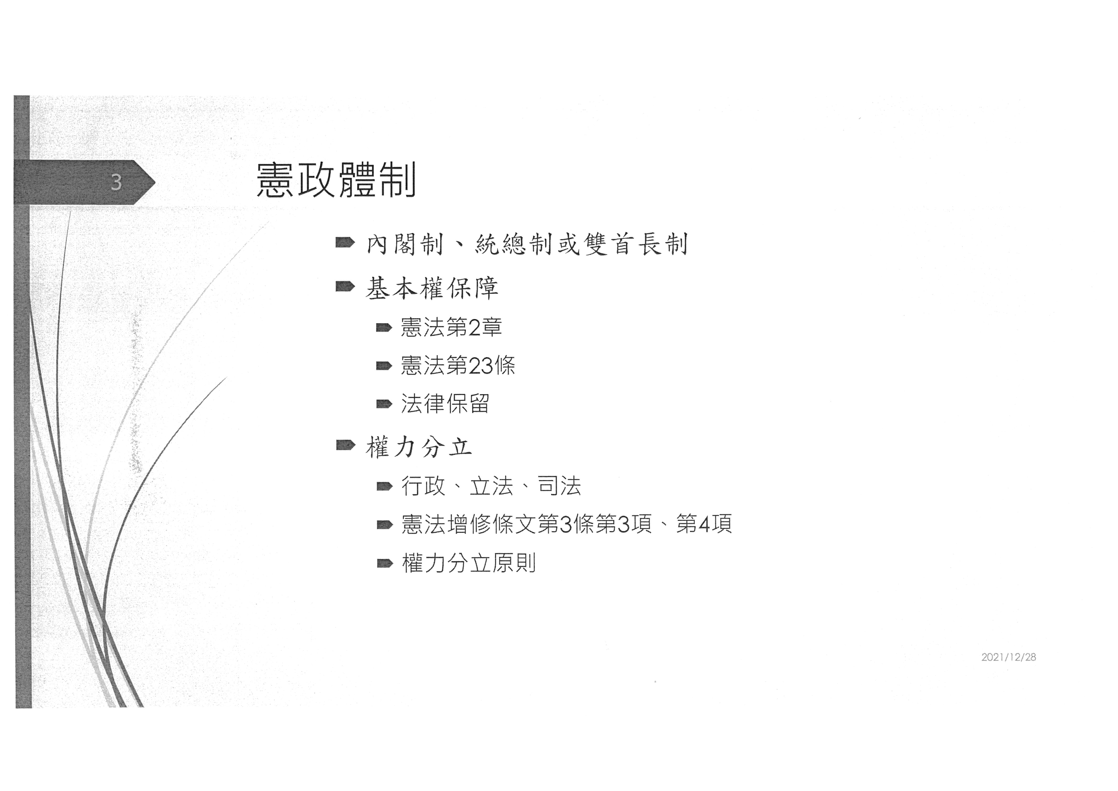 今天的議題有一點滿重要的,就是牽涉憲法上的議題。其實這個議題與整部憲法的設計是有關係的,因為在現代民主國家,憲法大致上都有基本權的保障與權力分立這兩大部分,但在採內閣制、總統制或雙首長制的國家,各自設計其實又不太一樣。臺灣的憲法其實比較接近德國的憲法,從總綱之後,第二章開始就是人民之權利義務,即基本權保障,也就是把法律保留的立法權放在最先,權力分立是在後面。美國憲法就不一樣,美國憲法先有政府機關的形成,在後面增修條文裡才會規範到這部分。我國後來修憲,大致上都著重在權力分立這一塊,以我們的傳統,從解嚴之後,整個憲法、包含大法官解釋等等,都比較偏向從法律保留出發,權力分立談得比較少。