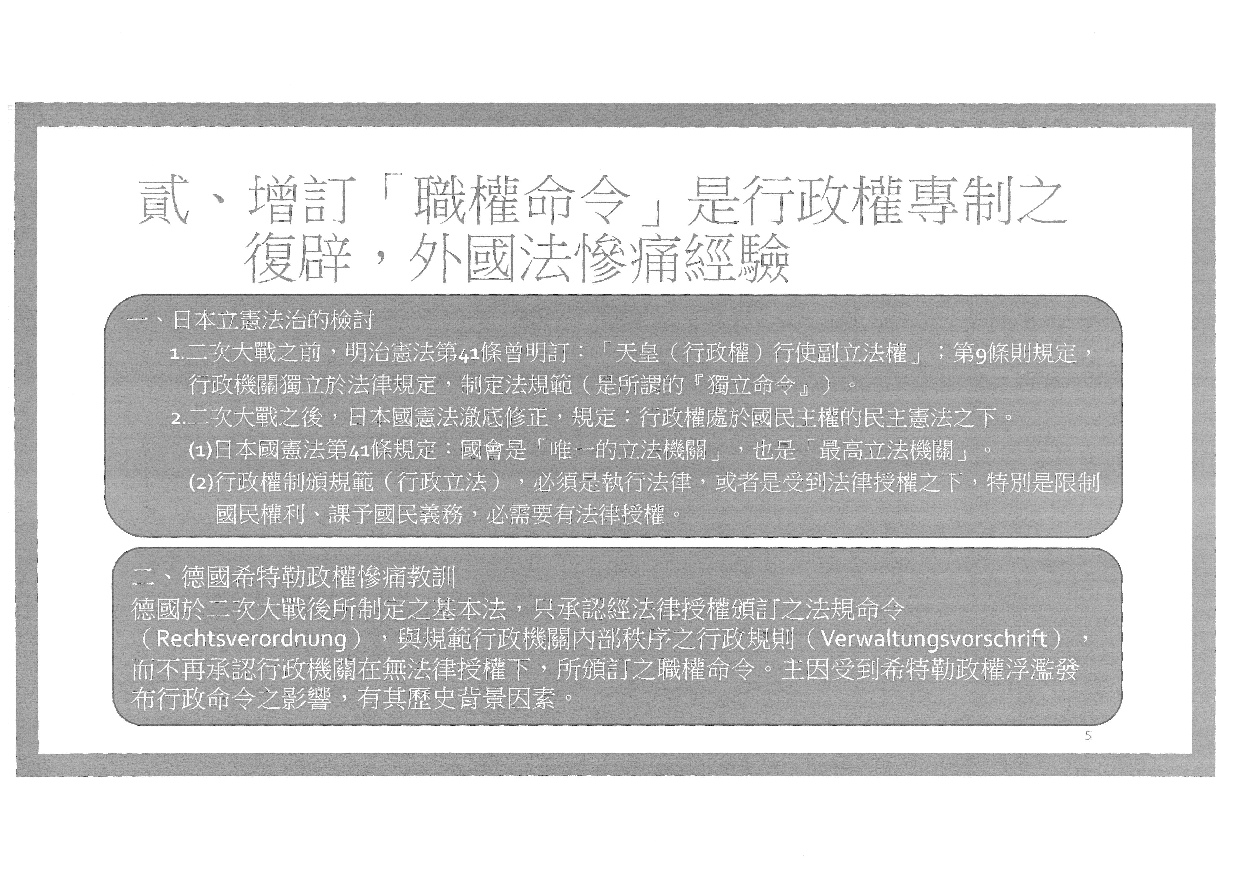 接著我們來看職權命令,國外不是沒有,日本、德國都有。日本二次大戰前,明治憲法第四十一條明定,天皇有行使副立法權,但是二次大戰後,日本國會澈底修正,規定行政權是處於國會主權的民主憲法之下,所以日本憲法第四十一條規定,國會是唯一的、最終的、最高的立法權;德國希特勒在任的時候也是濫用行政權發布了很多的命令,所以德國也是二分法。因此各位可以看到世界潮流及法治國的建構都是走這條路。