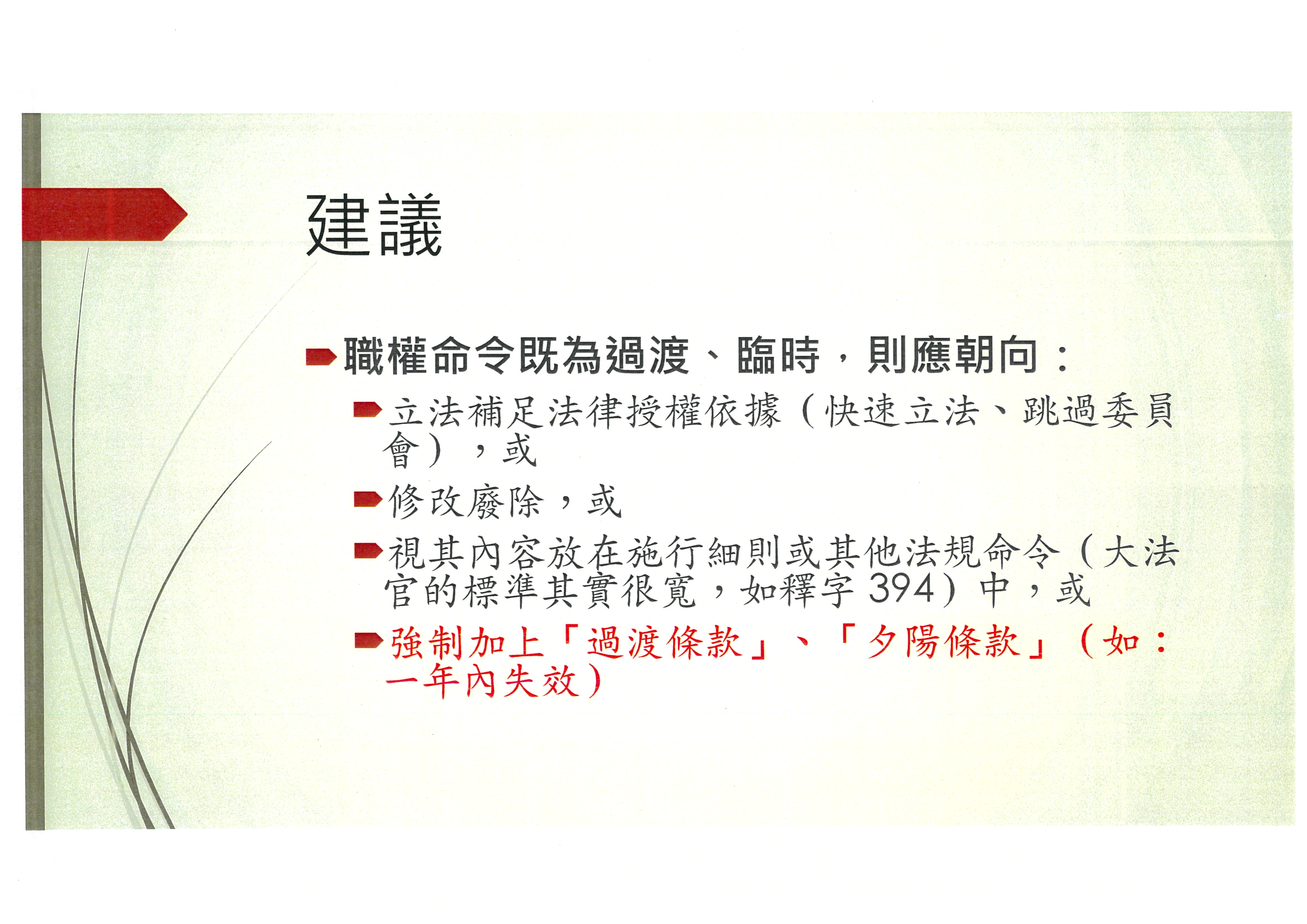 最後,我的建議是,我認為職權命令既然是過渡、臨時的,那就應該儘可能立法補足。第二個,把它統統廢除,就像現在的第一百七十四條之一第一項一樣。第三個,把它儘可能放在其他的法規命令或施行細則裡面。最後一個,我還沒有在這裡面加上去,但我覺得它很重要,我認為目前的行政院版如果要過,應該要加一條,就是所有的職權命令都應該要有過渡條款或夕陽條款,例如一年內失效,因為一年後會失效,所以你就必須重新再來訂,或者把它塞到立法裡面,這樣才能逼立法機關跟行政部門趕快把它的法源依據補足,不要讓那個不得已臨時存在的東西,反而變成讓它一直拖著,然後變成正軌,這是我的建議,謝謝。