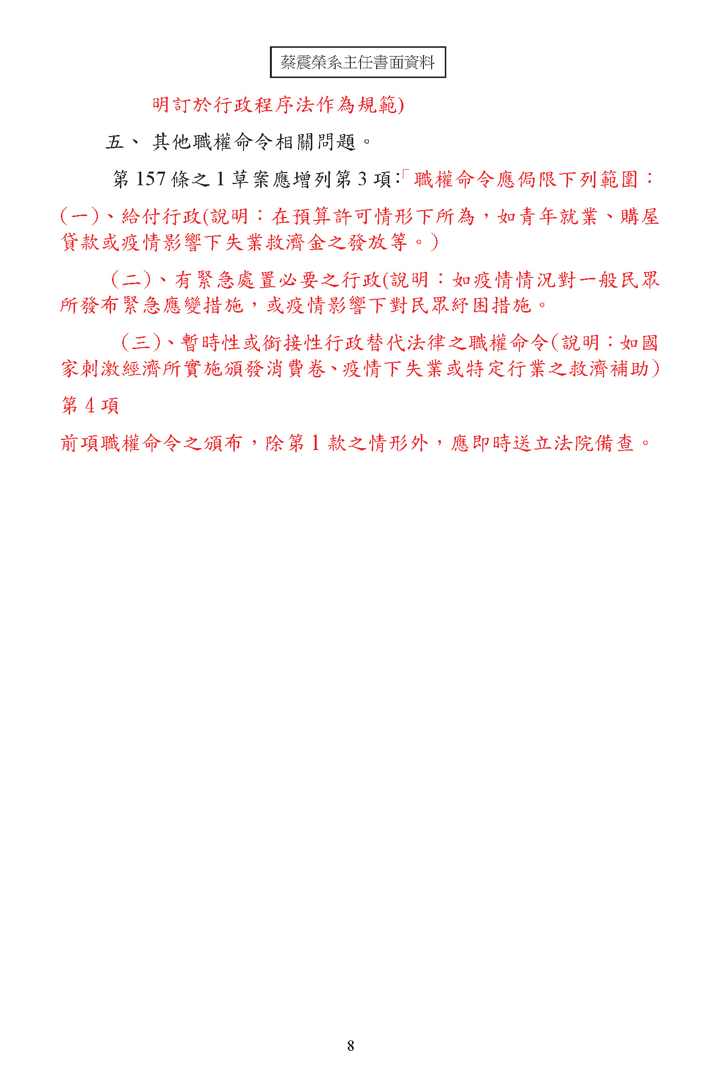 當然我們說保持職權命令的好處是,假設這個預算只有今年度有,明年度不一定有,我訂成法規好像是永久要發放,所以我們以暫時性的措施、暫時性的一種社會給付的話,可能用職權命令就可以,因為它必須要有一種權宜措施。但是如果是一種比較常態性的,而且是重大金額的發放的話,比如說一發放就幾千億元,我覺得這個應該要有法規的授權,要國會同意,因為這個預算支出是屬於人民的錢,是納稅人的血汗錢,納稅人繳的稅怎麼分配要經過人民同意,人民同意就是國會要同意,那國會都沒有同意就可以隨便發放了嗎?那就變成獨裁國家,不是民主法治國家嘍!大家要暸解這一點。我們臺灣作為民主法治國家,預算的支出就應該要有國會同意的這個機制,而不是概括的通盤授權,所以我們現在的作法其實已經不符合現代民主法治國家的國會審議預算同意的一個基本精神,因此我覺得用職權命令的話,如果金額比較龐大,當然大家可以設定看要10億元、20億元、100億元,類似這樣。