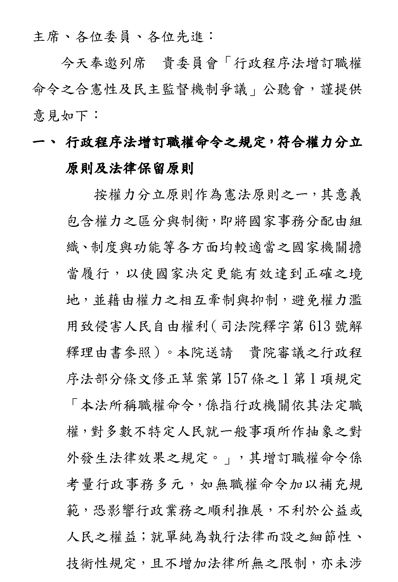 剛才也有學者提到,引用吳庚大法官所提的,如果法規命令存在的話,要有管轄權,這個管轄權也不是在組織法,應該是在作用法裡面。有管轄的部分,加上有作用法,所以要有執行的法律依據,同時針對細節性、技術性或是大家還考慮到其他侵害度比較不足、影響輕微的部分等等,大家可以思考在法律裡面如何訂定。透過行政程序法明定職權命令規範的話,如果通過了,事後立法監督、司法監督、甚至還有輿論監督等等,讓法規命令明文化、透明化。我們認為,比起放在行政規則裡面,這樣是不是能更加保障人民的權利義務,而不會造成機關的濫權?這個是我們基本的態度,才做修法。其他的部分,會後我們會再做書面意見報給委員會,請大家指教,謝謝。