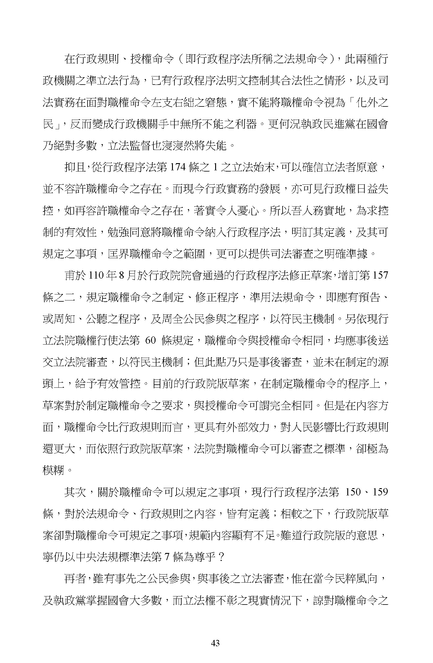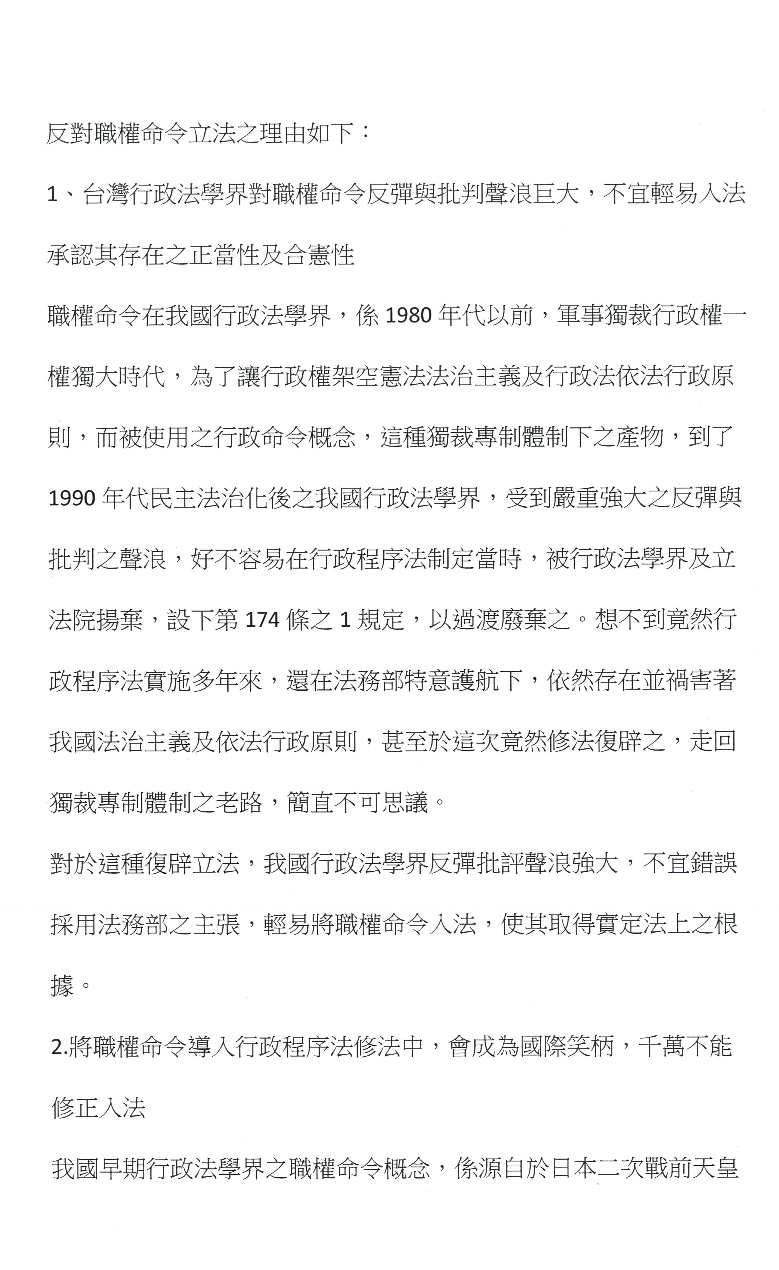 倘若我們准許職權命令在行政程序法裡面讓它定位,讓它整個正式存在,會有一些危險的地方,第一個,行政機關仍然是首長制,各位都是公務人員,我相信首長下令,在首長的決定底下,應該沒有反對的意見,所以倘若我們給它一個正式地位的話,會造成無限多的──因為它的職權所需要,會有無限多的職權命令出現。出現以後,在立法院這個地方,雖然你要審查,但是你的時間最多是6個月,這是立法院職權行使法第六十一條的規定,3個月沒有做好,頂多再延長一次,那麼就會視為通過,我們哪裡有這個能量能夠一個、一個來審查?這是第二個意見。