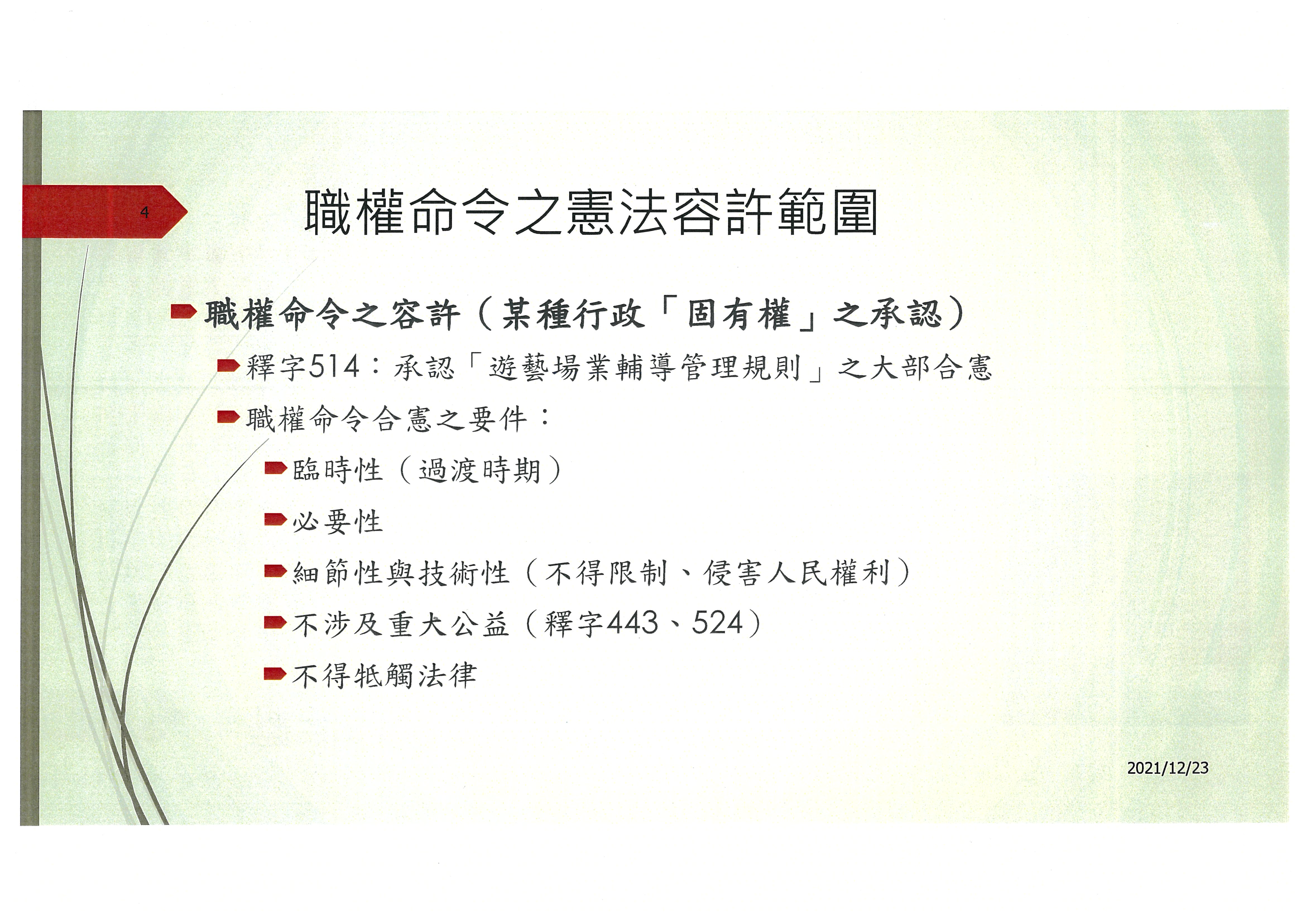 我今天的題目是:暫時過渡的職權命令要正規化嗎?我強調的是「暫時過渡」,就算已經存在,也應該是暫時的,也因此,我的結論是:原則上不論是否同意職權命令,都會同意即使有,也應屬例外。依照大法官解釋,就算承認其存在,理當屬於過渡期,不該永存!在行政程序法制訂時,我是博士生,對於職權命令,我的看法是比較友善的。在2000年還是博士生時,我就寫過行政保留這篇長文,因為我們應容許一些行政空間存在。大法官釋字第514號解釋文解釋遊藝場業管理規則時承認,在某些限度內可承認職權命令。因此,這條線必須從大法官解釋劃起,讓大家知道憲法對此的容許空間究竟是多少?在514號解釋涉及的其實是以前的電動玩具場,我女兒根本不知道原來臺灣有過這種東西。電動玩具場是一定要管的,但多年來政府都沒有立法管制,故而訂定遊藝場業輔導管理規則。對此,大法官認為,這是「於法制未臻完備之際,基於職權所發布之命令,固有其實際需要」,所以真的是法制未臻完備,只好不得已趕快訂定。之後一旦有了法律,當然就不再施行該規則了。照理,應該儘快立法,這是第一點。