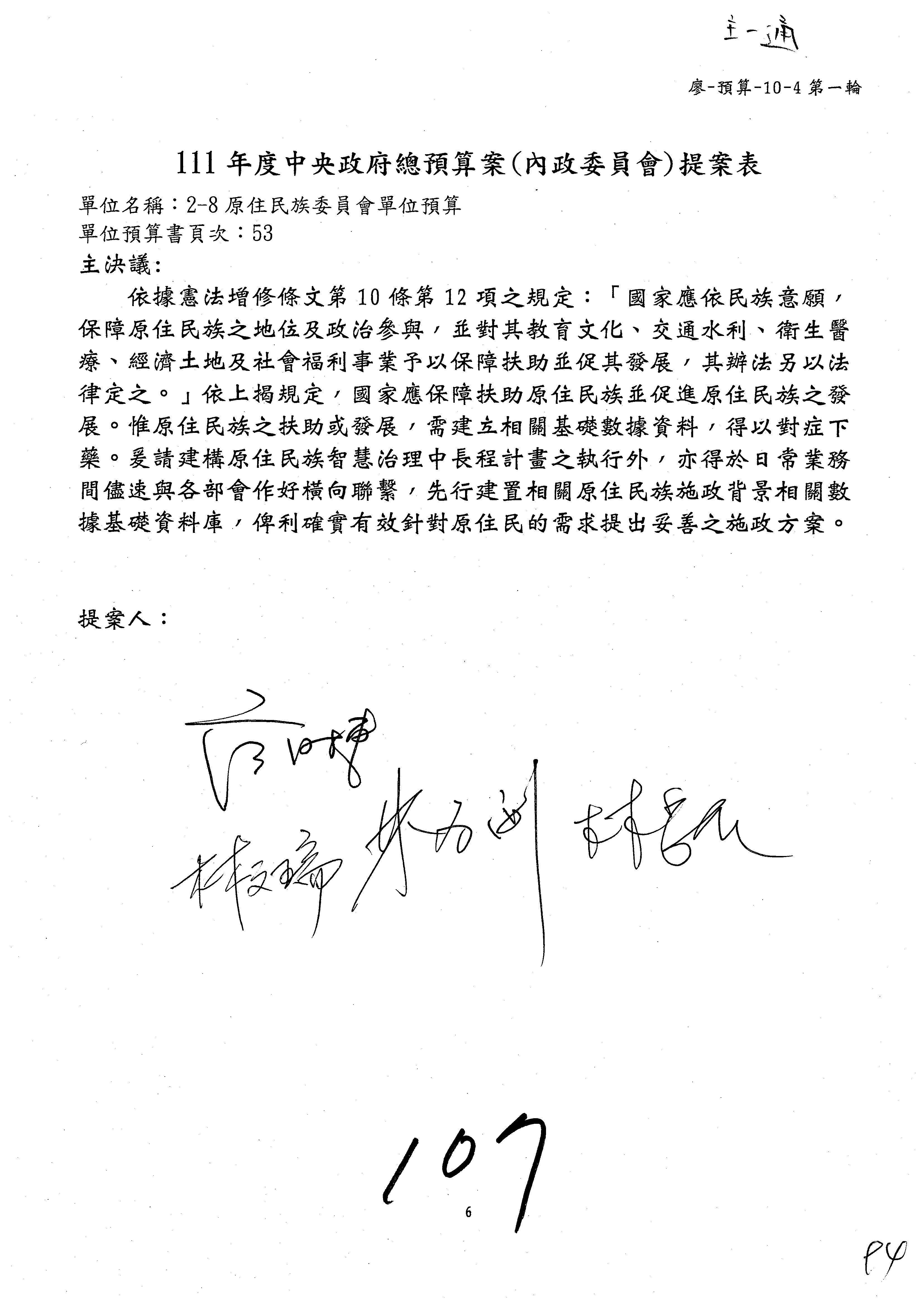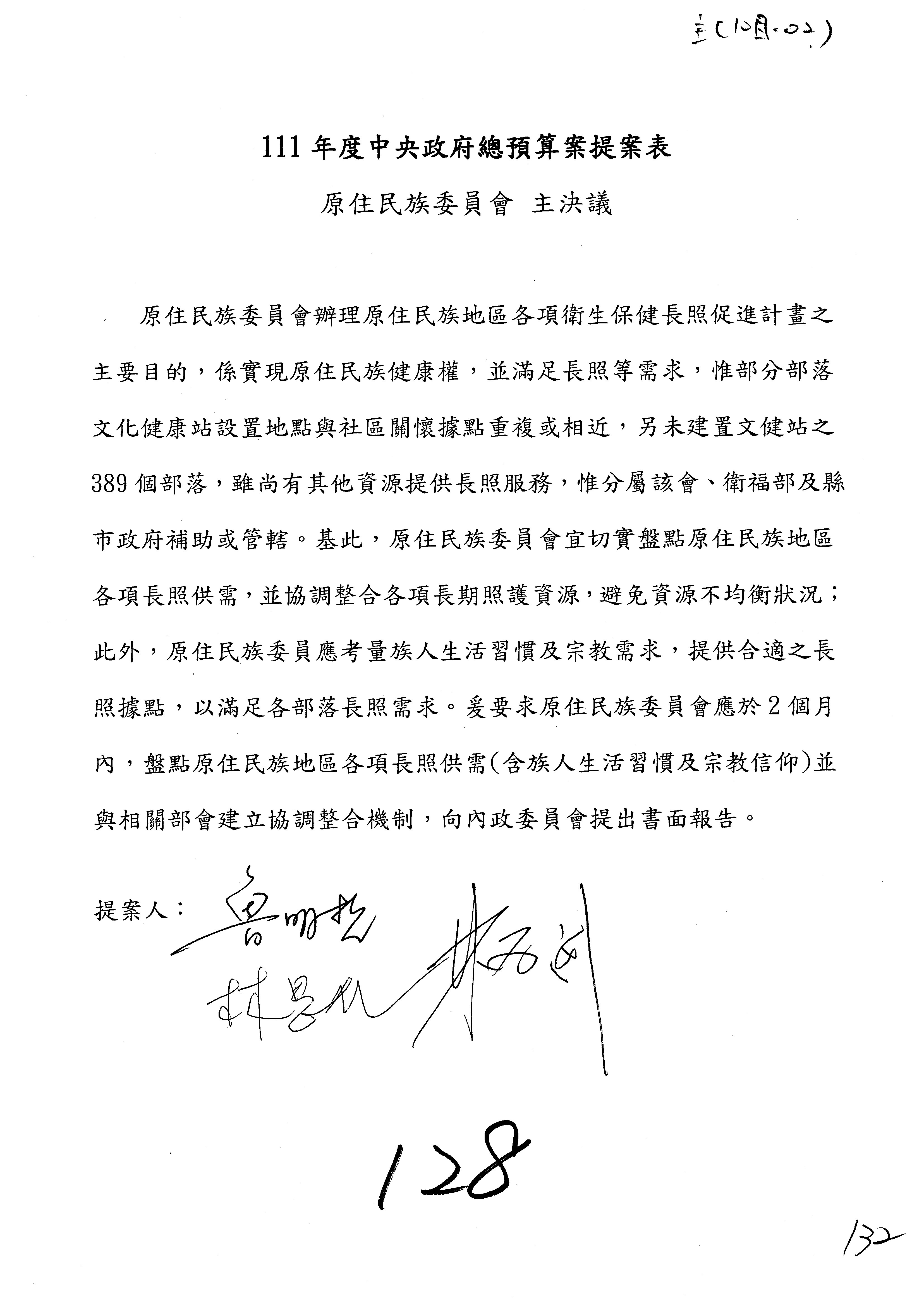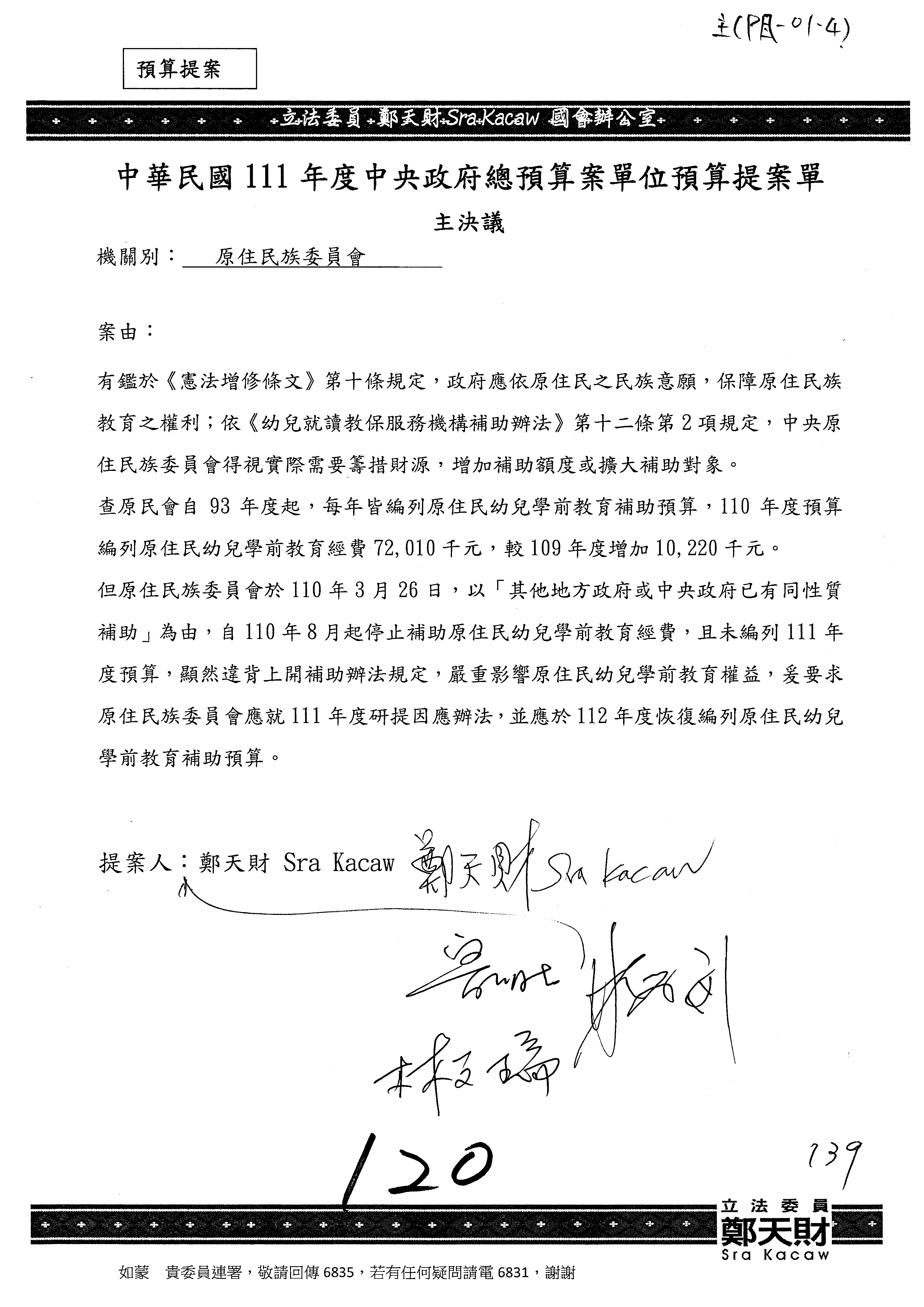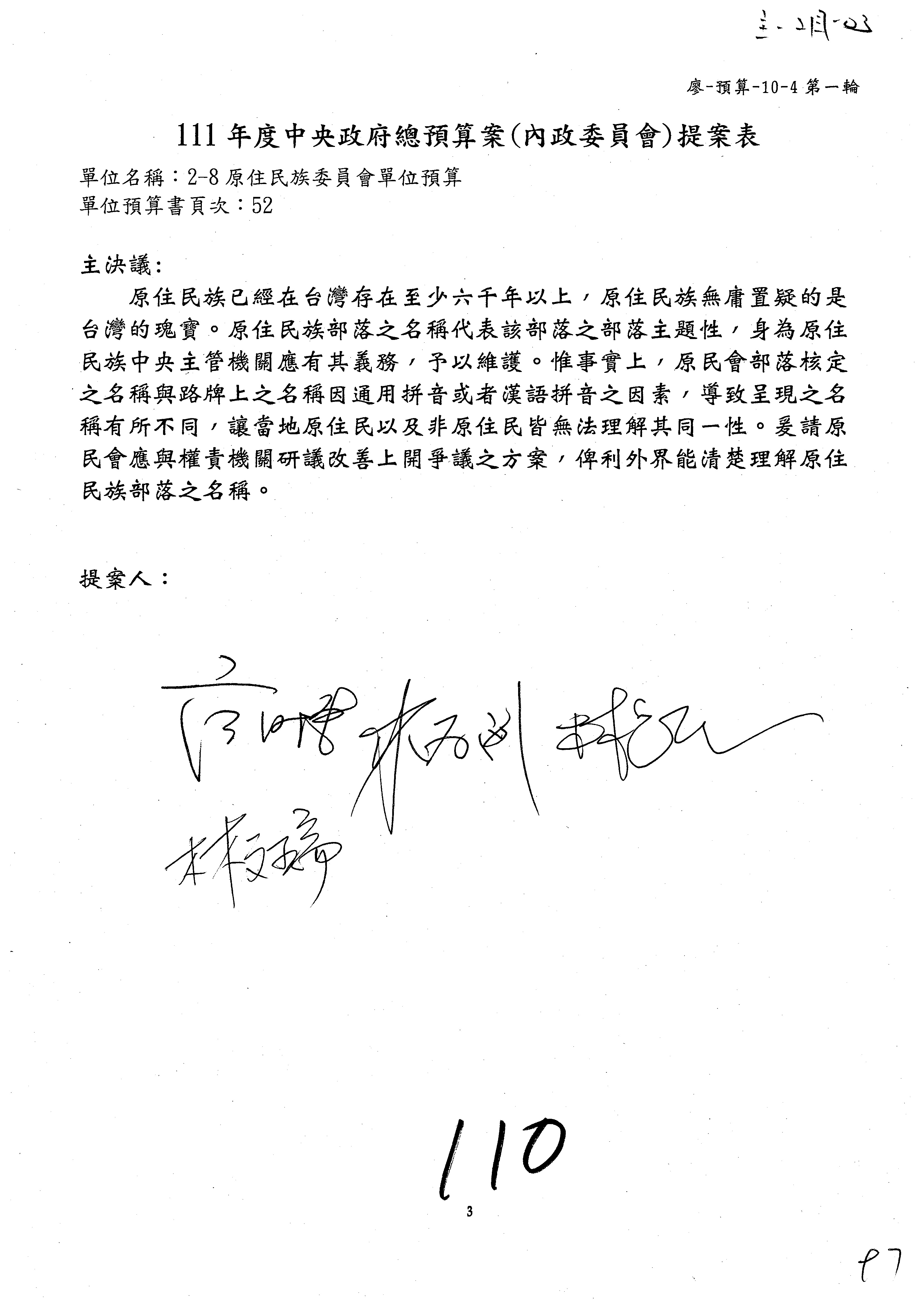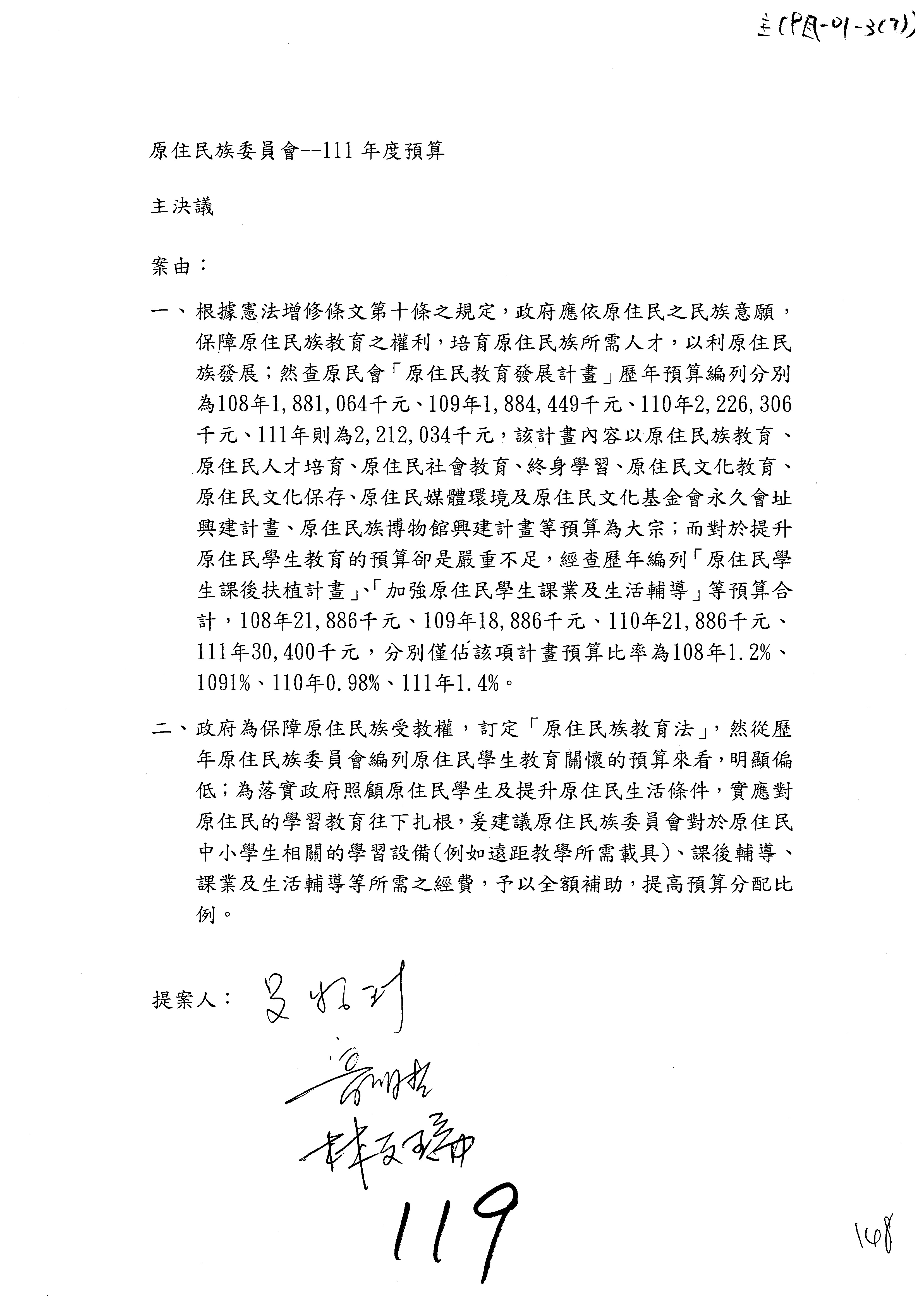 主席:好,跟大家先宣告一下,110年度中央政府總預算案關於原住民族委員會、原住民族文化發展中心預算,詢答的部分已經在110年12月1日完成,今天就直接進行預算之處理。