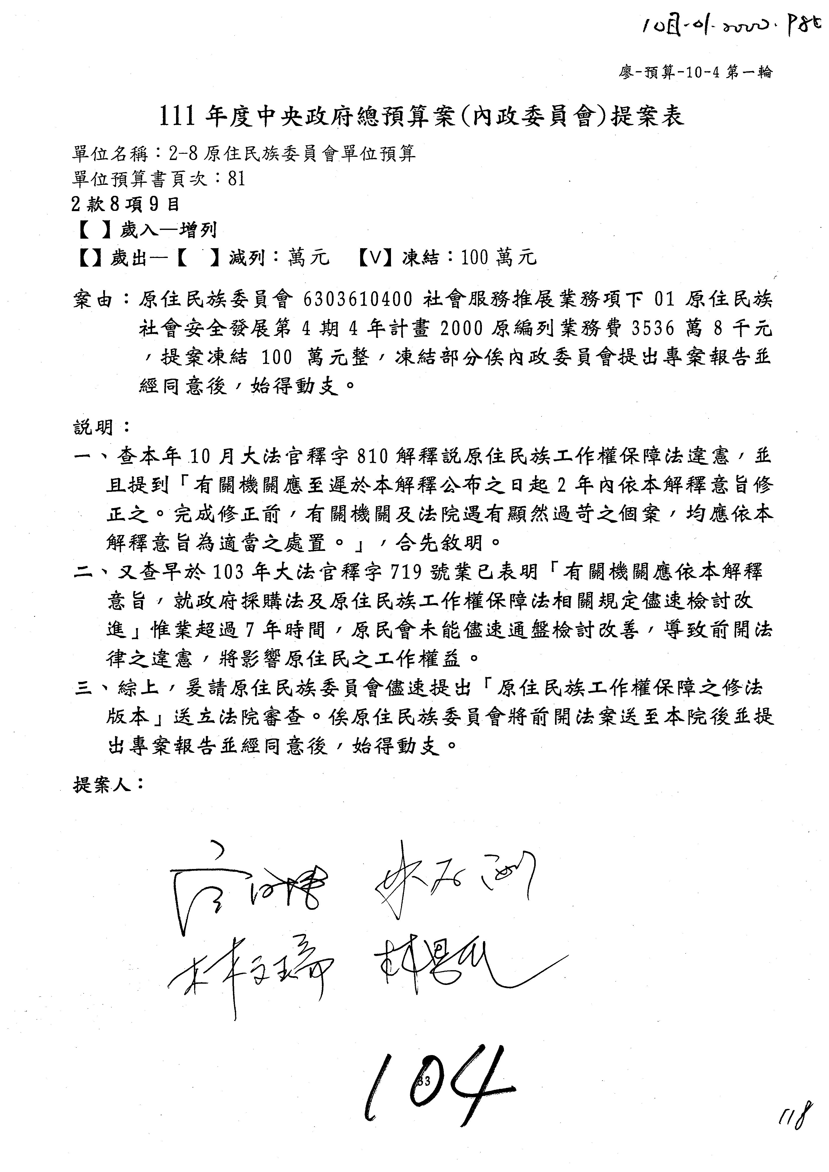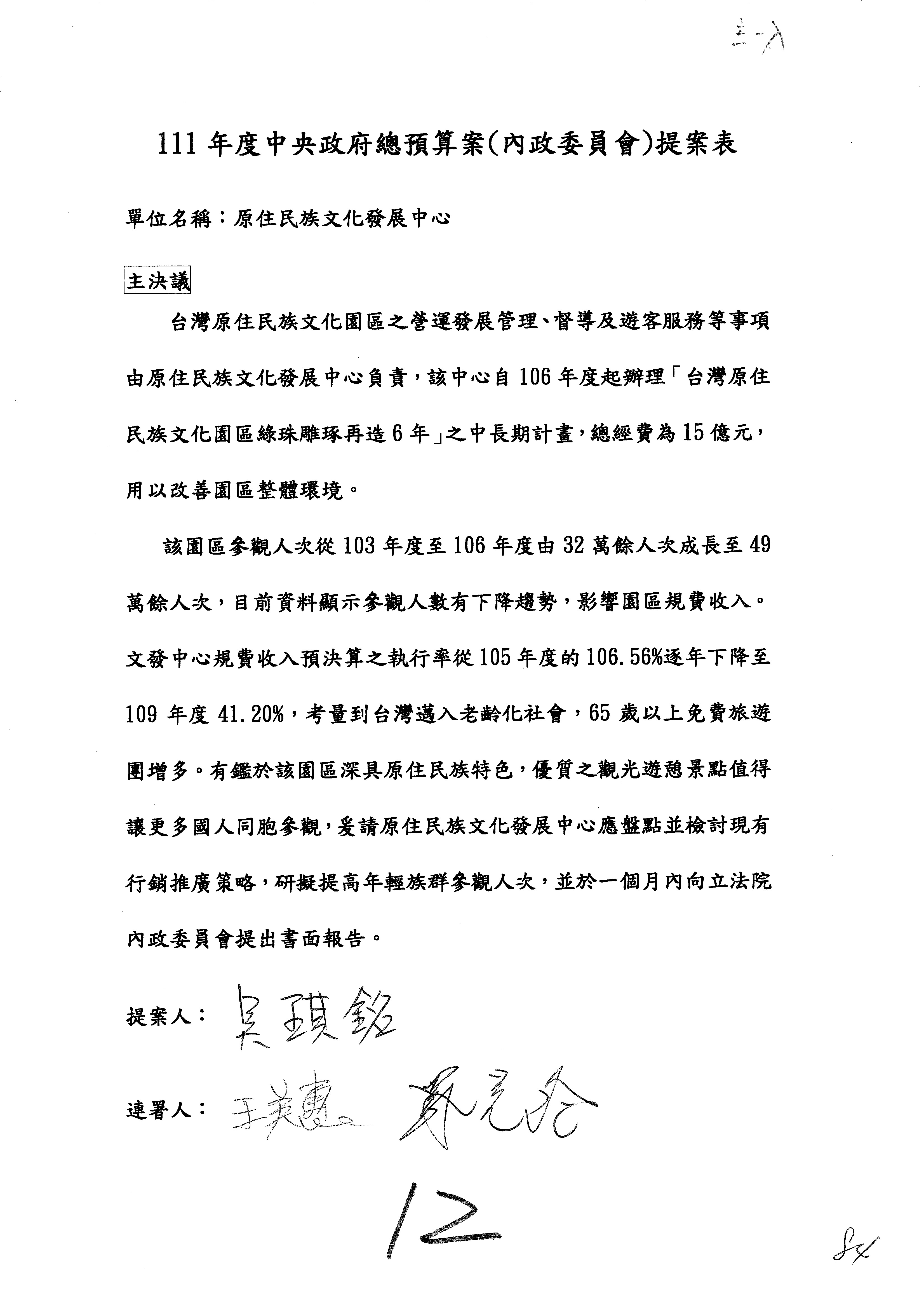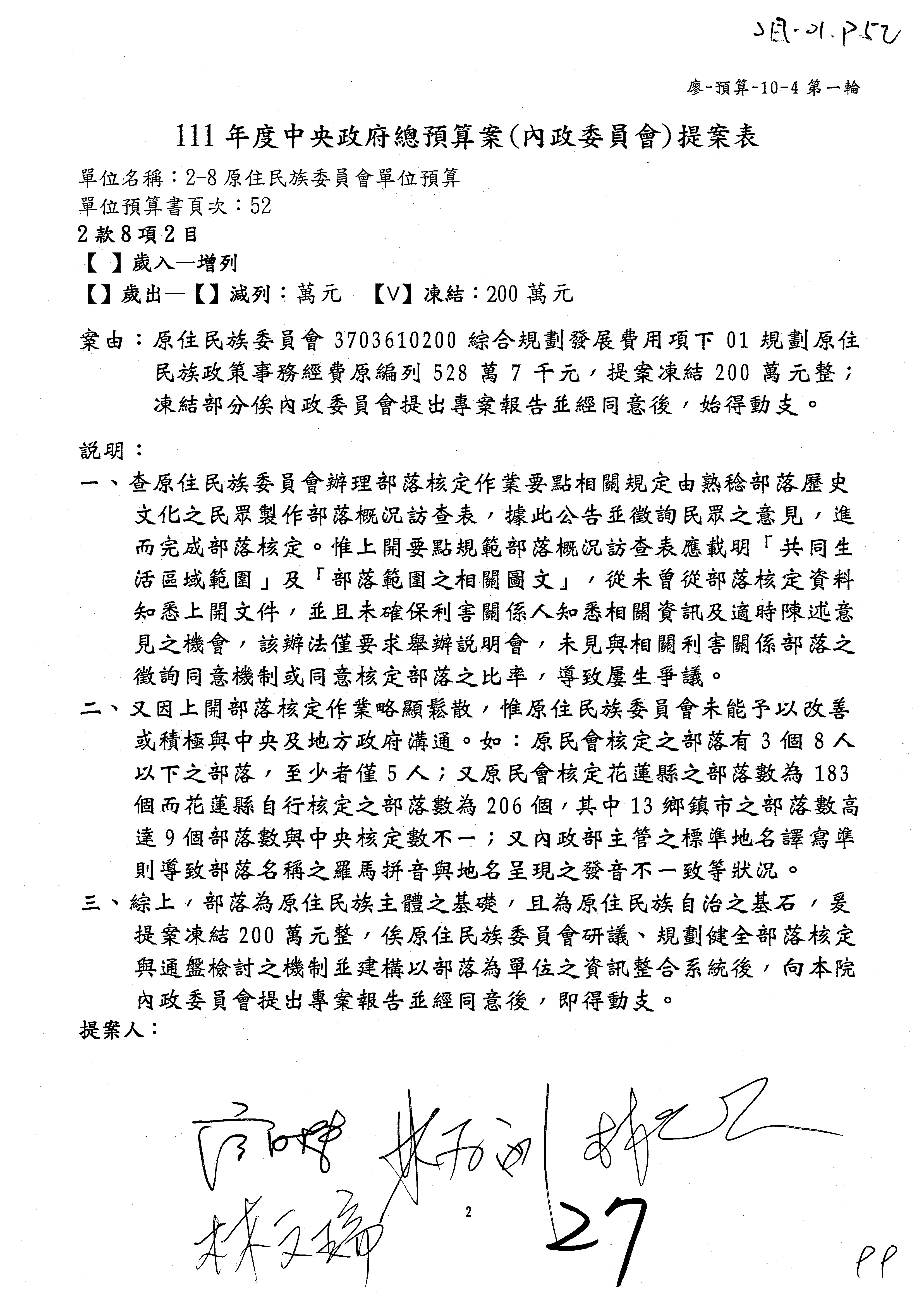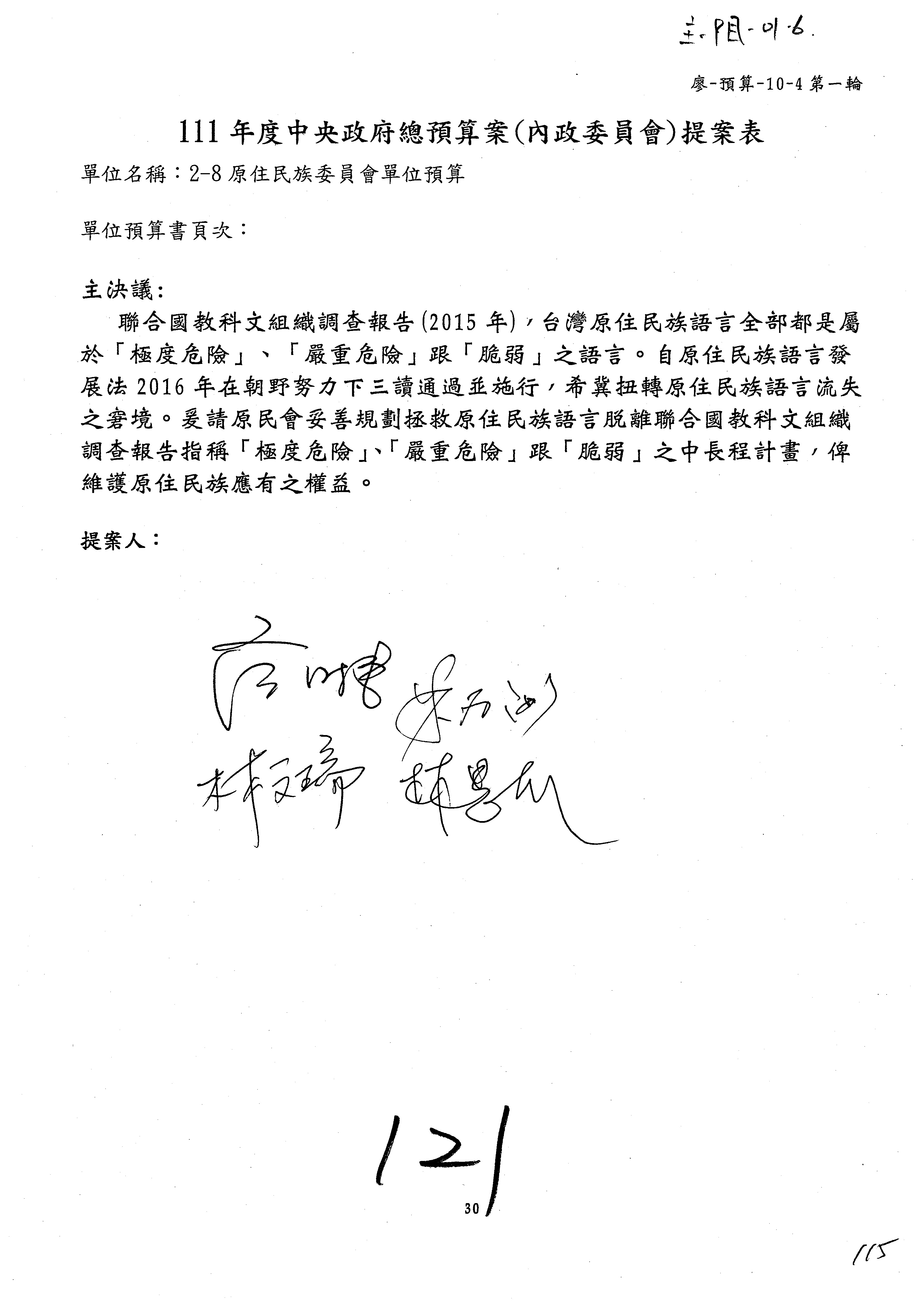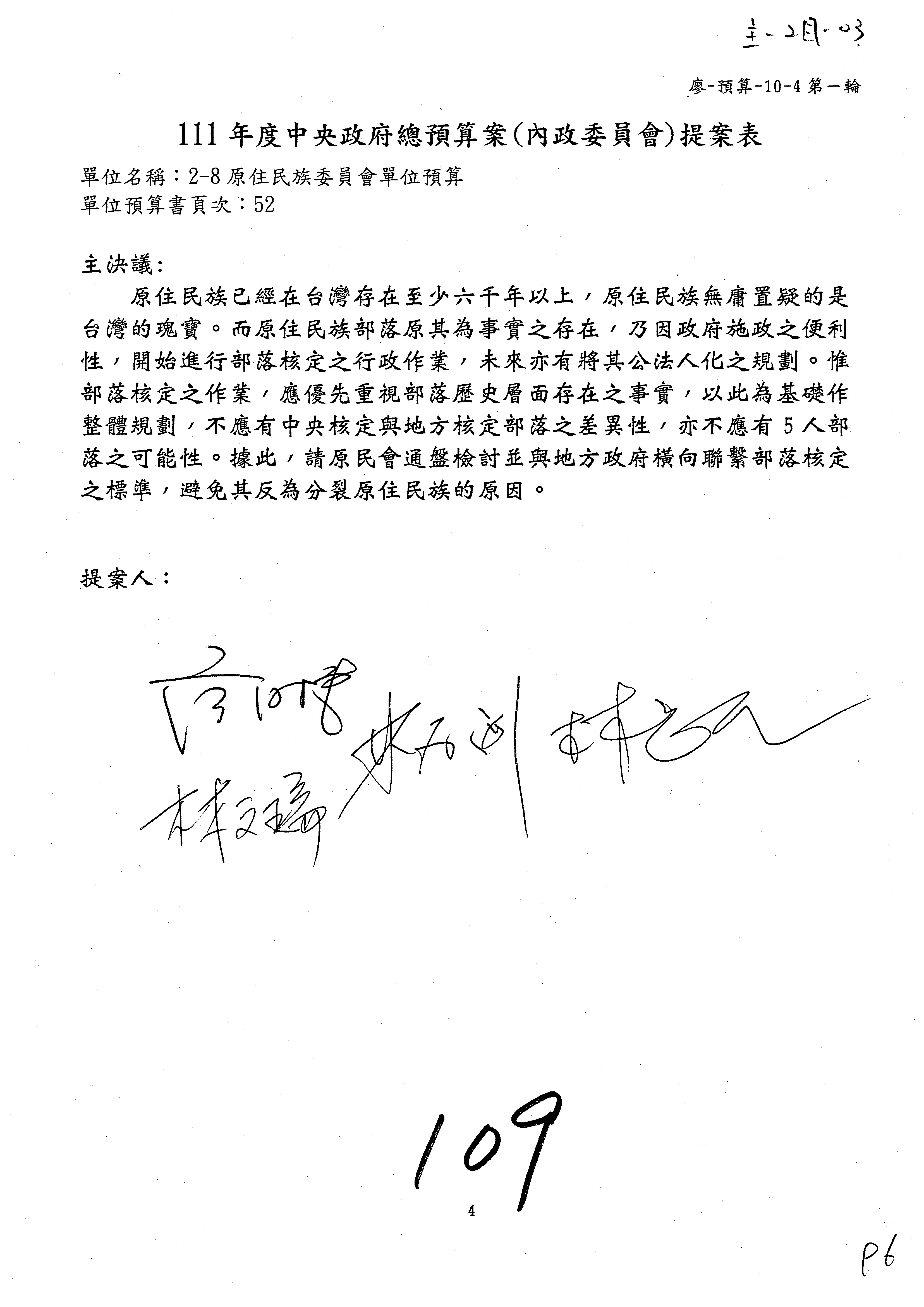 主席:好,跟大家先宣告一下,110年度中央政府總預算案關於原住民族委員會、原住民族文化發展中心預算,詢答的部分已經在110年12月1日完成,今天就直接進行預算之處理。