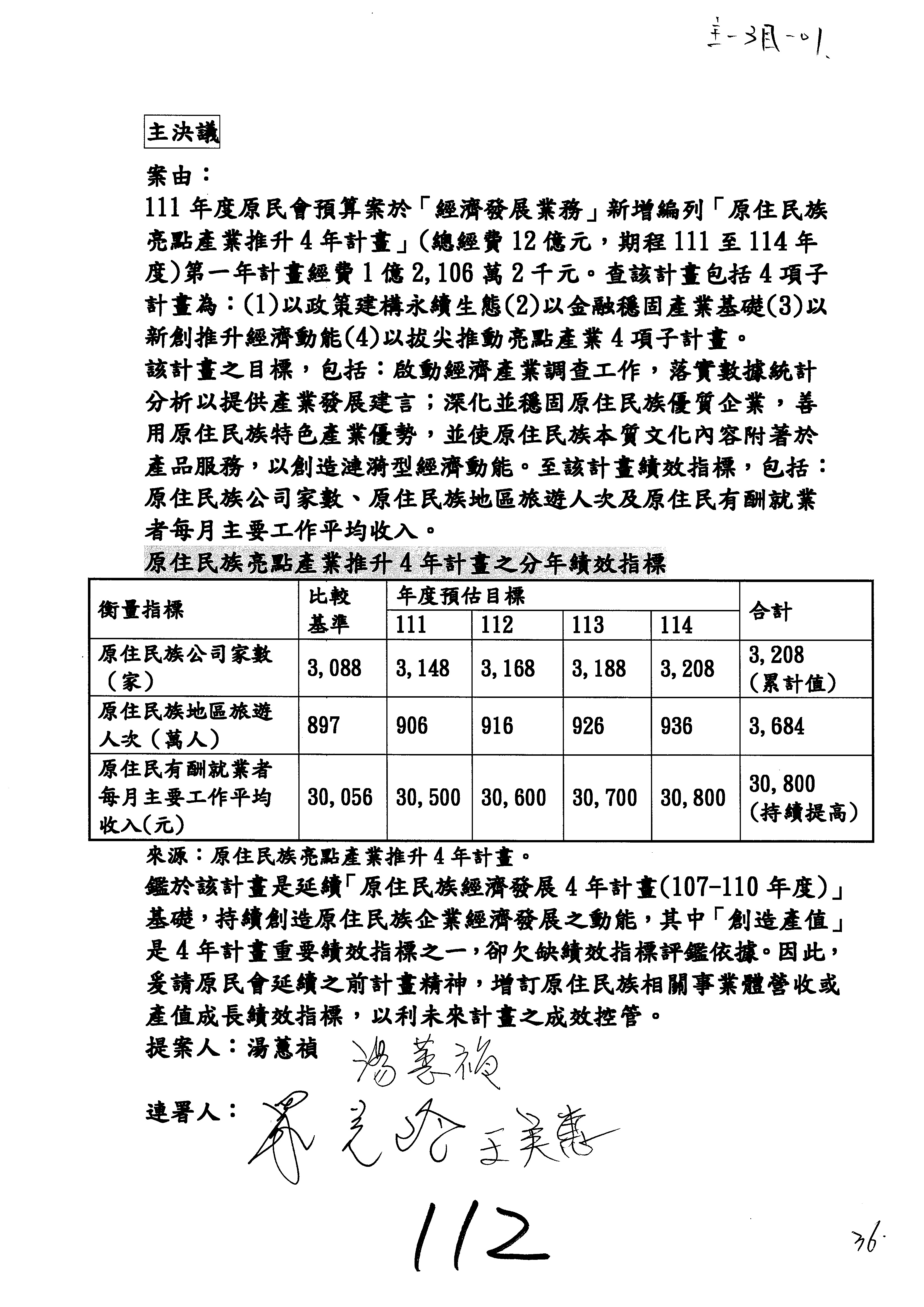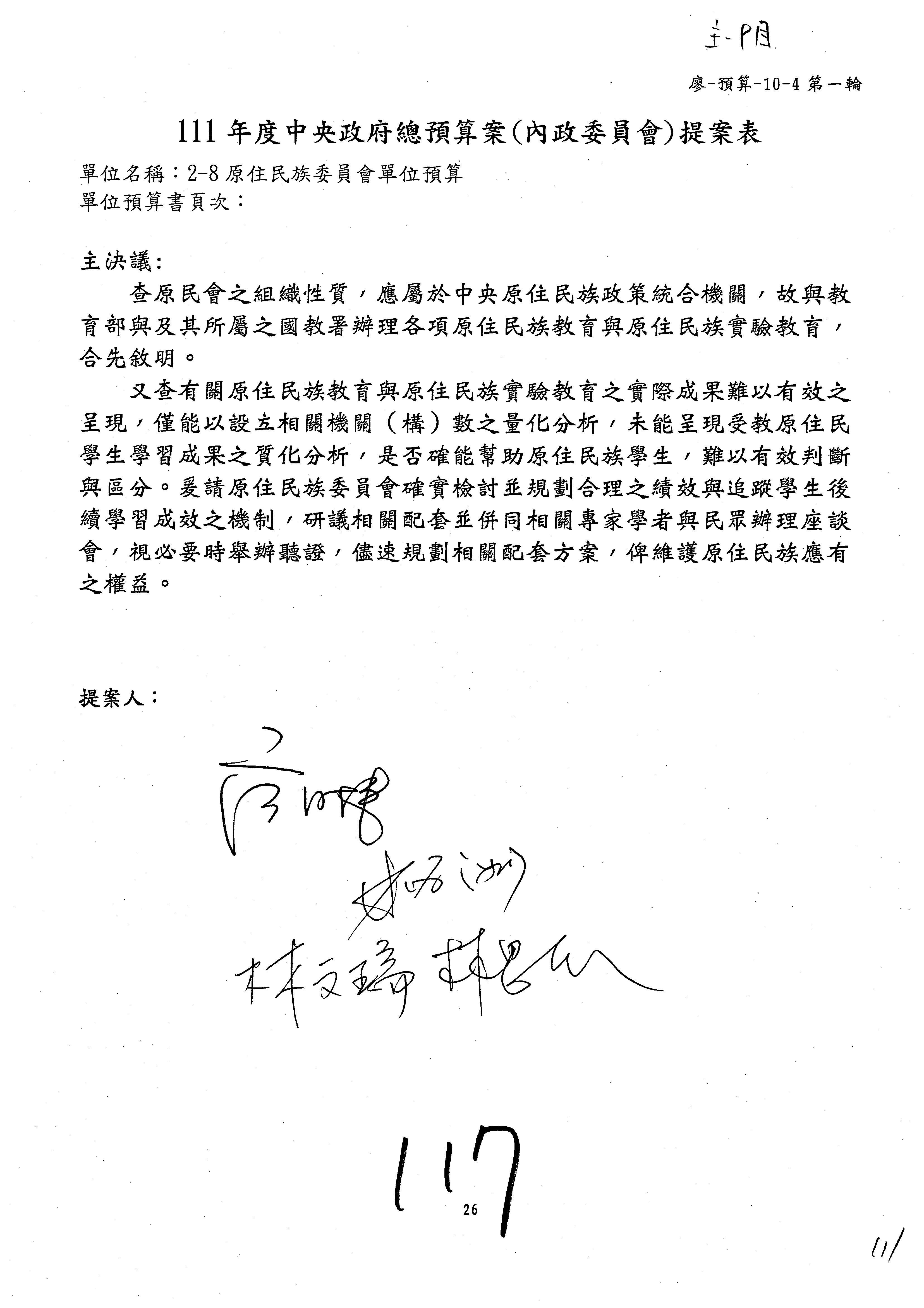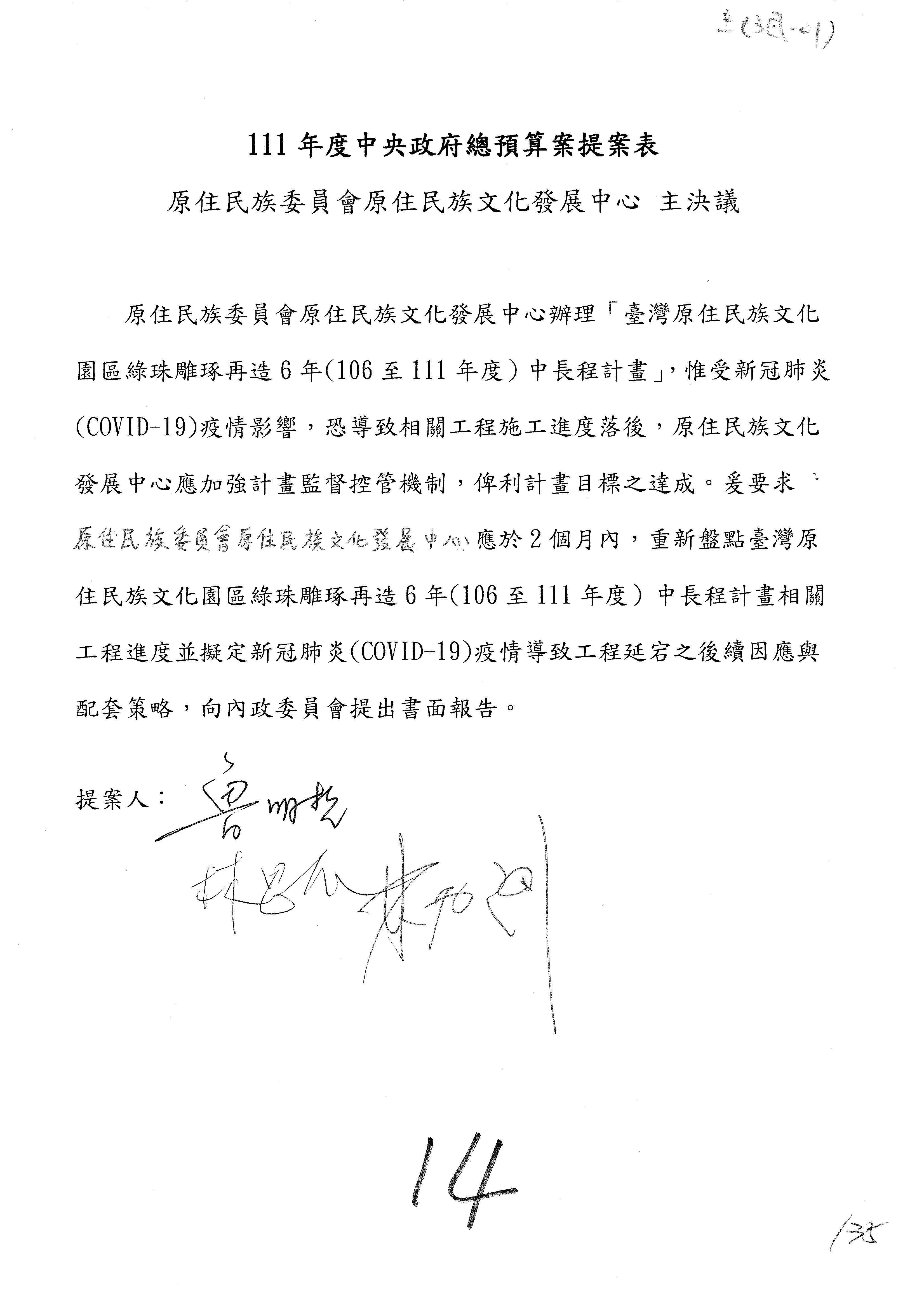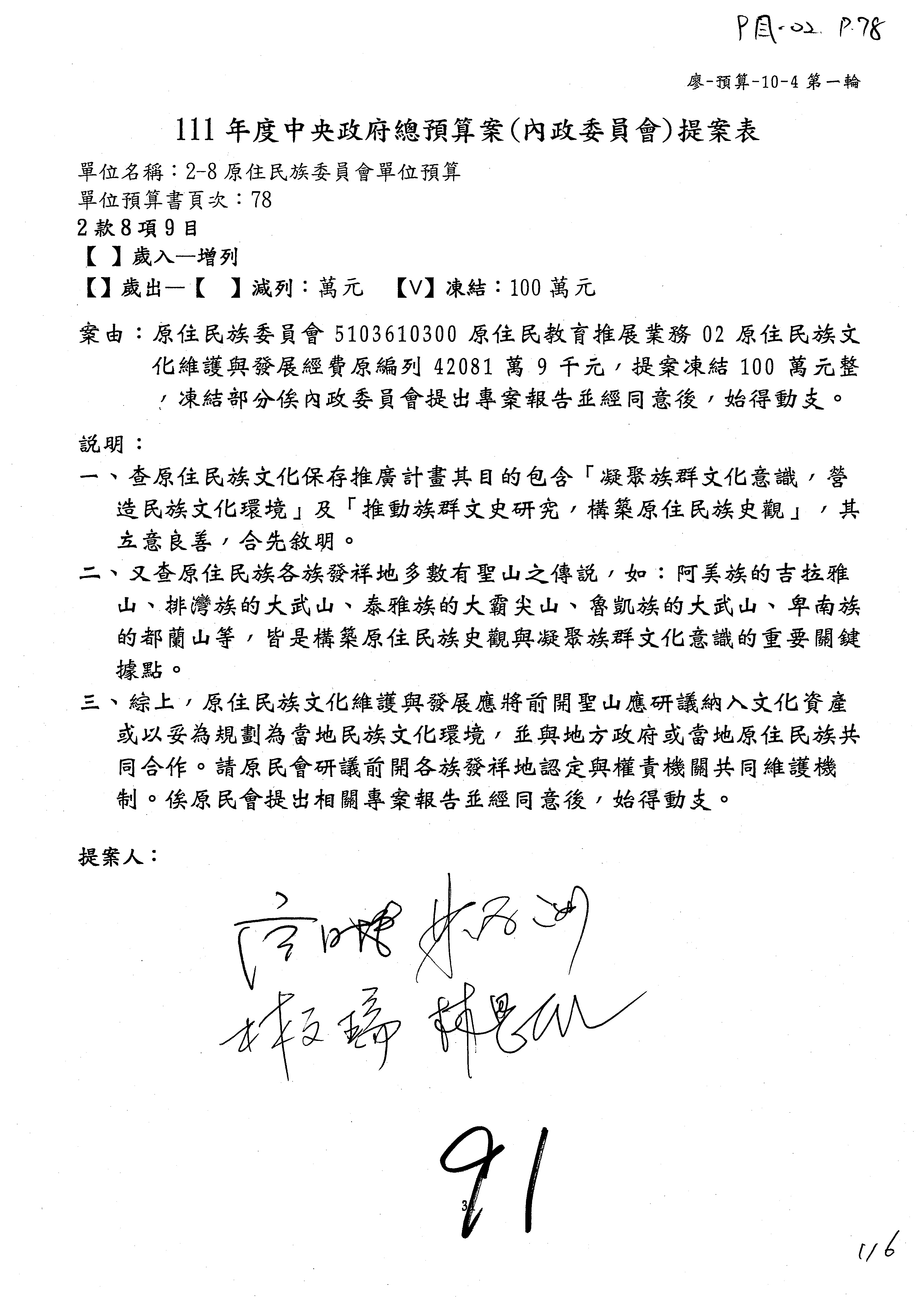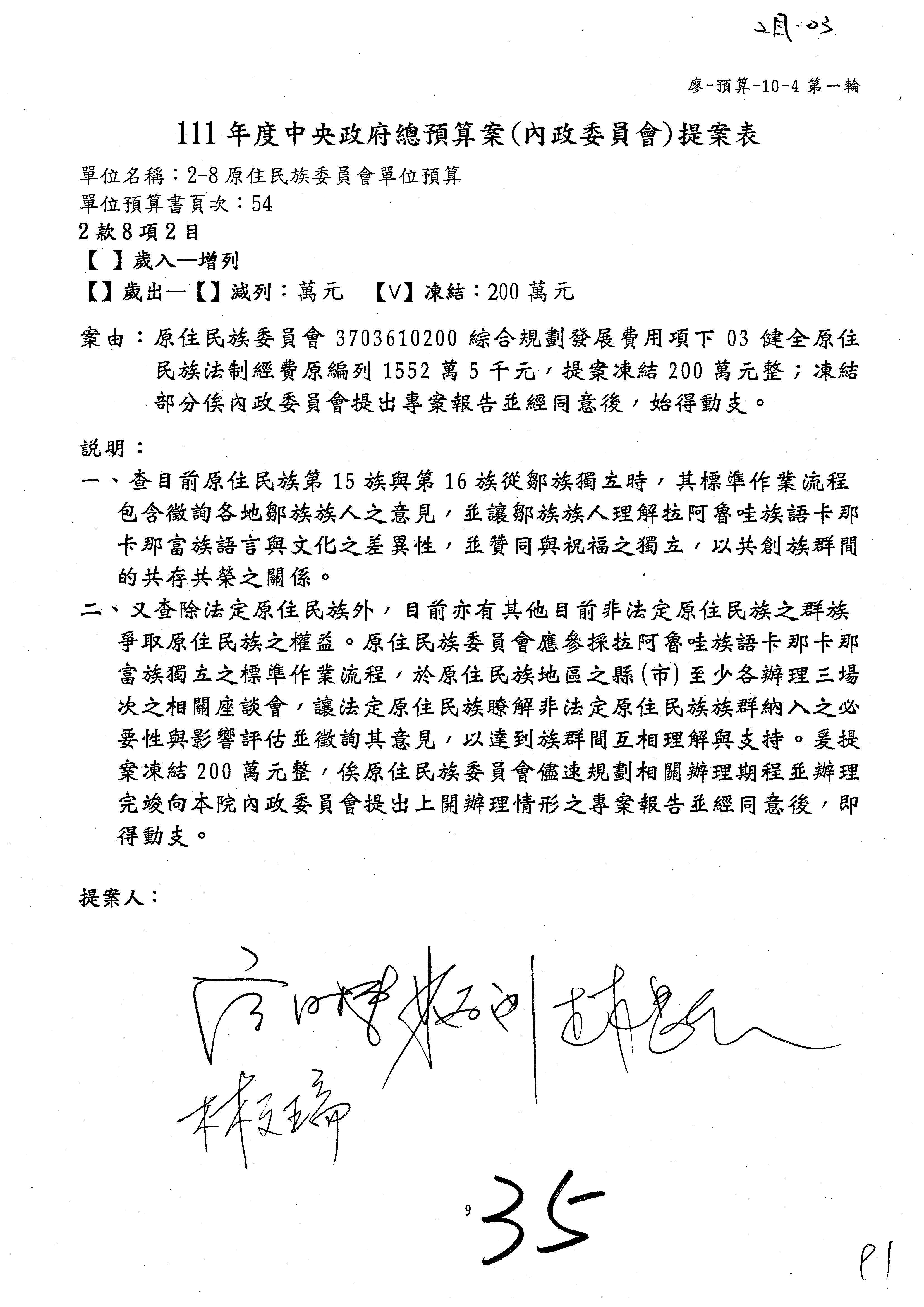 主席:好,跟大家先宣告一下,110年度中央政府總預算案關於原住民族委員會、原住民族文化發展中心預算,詢答的部分已經在110年12月1日完成,今天就直接進行預算之處理。