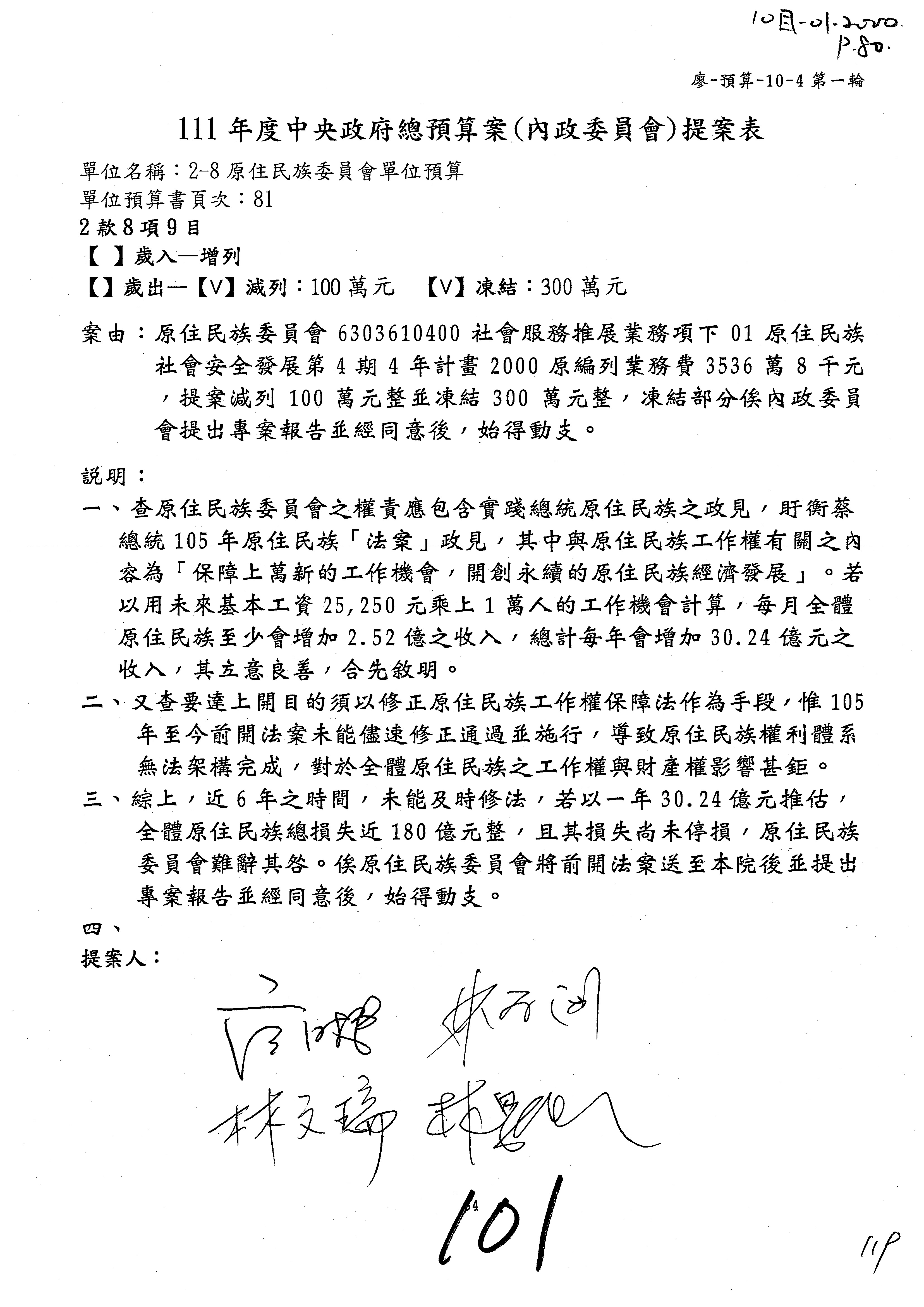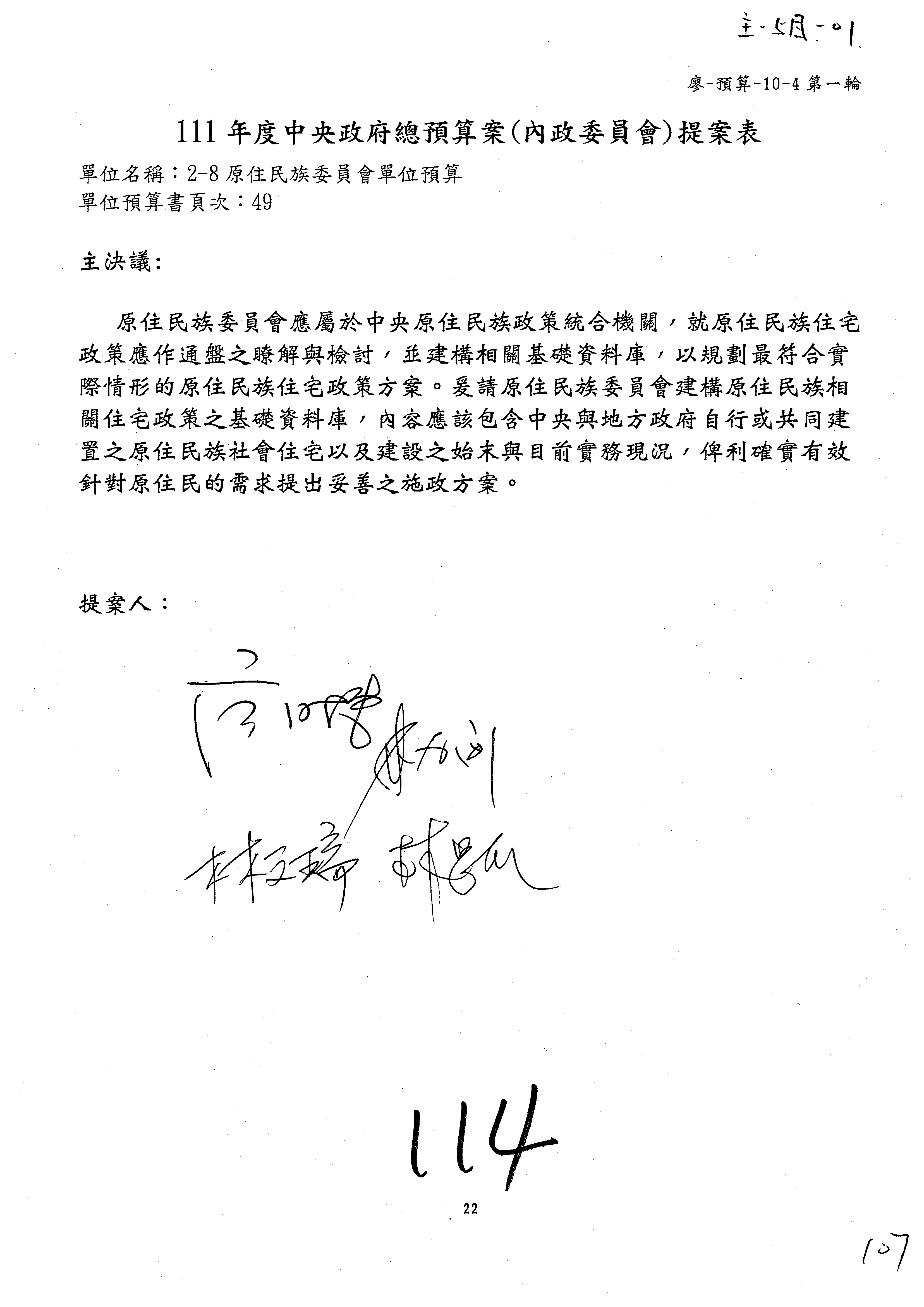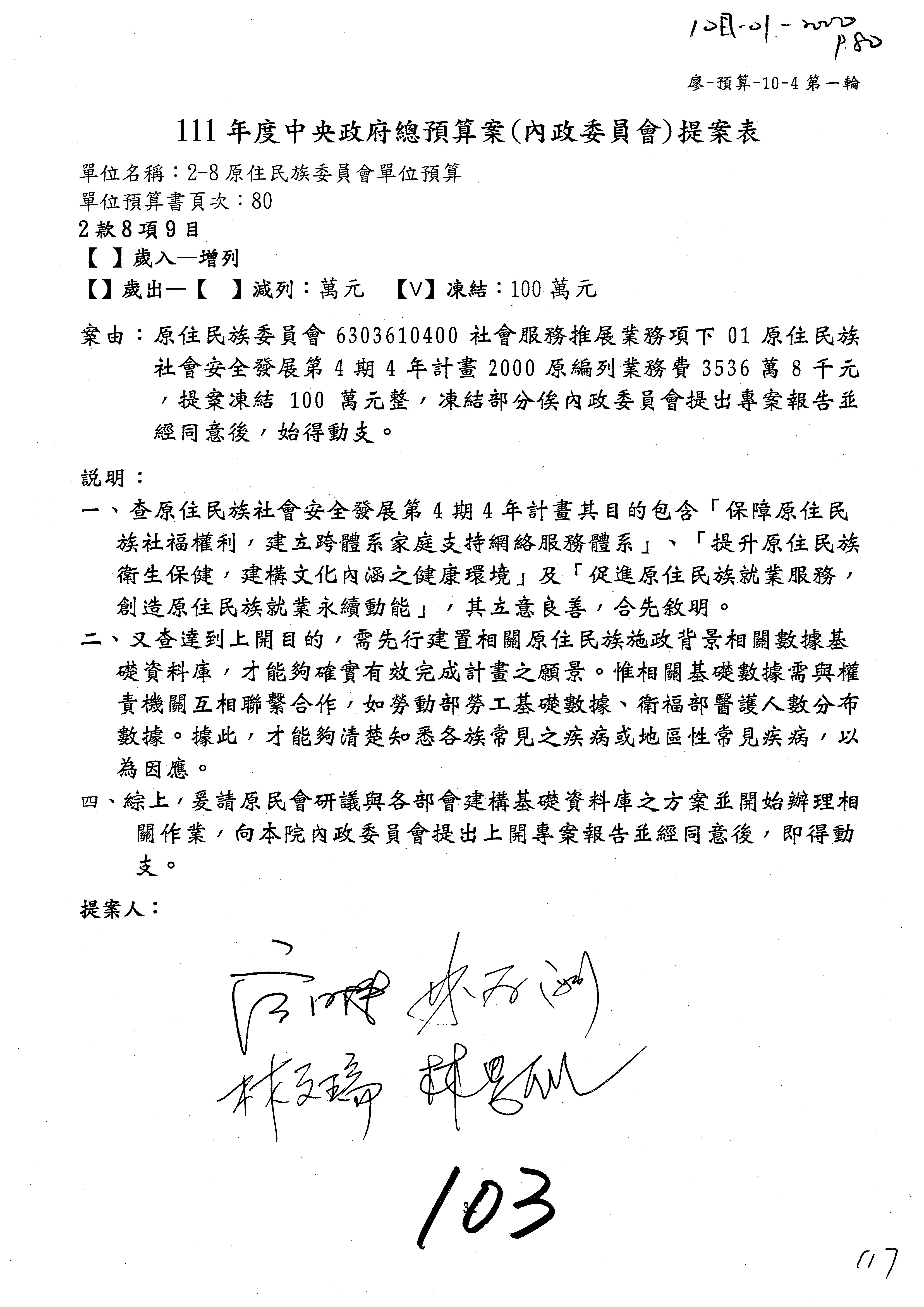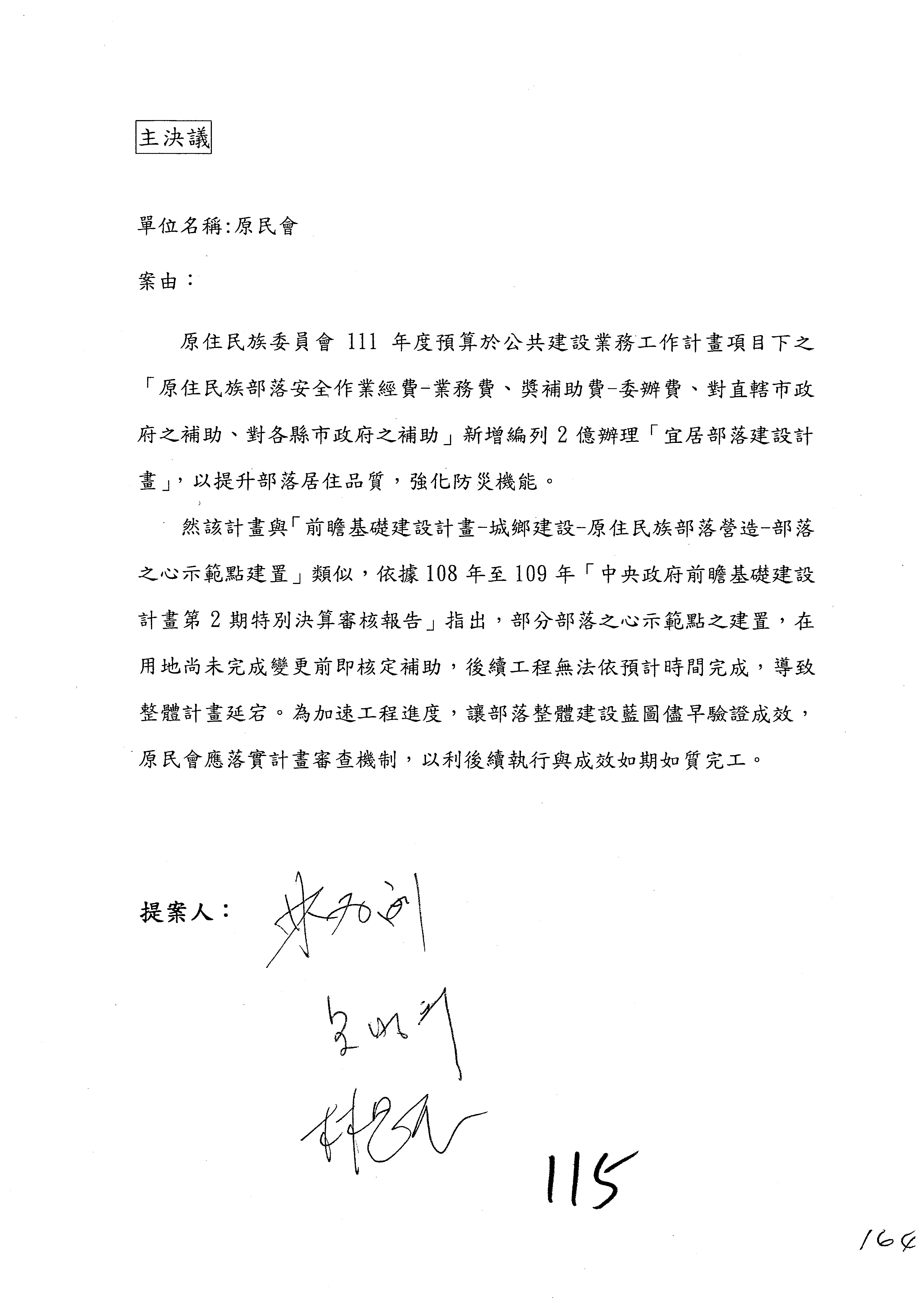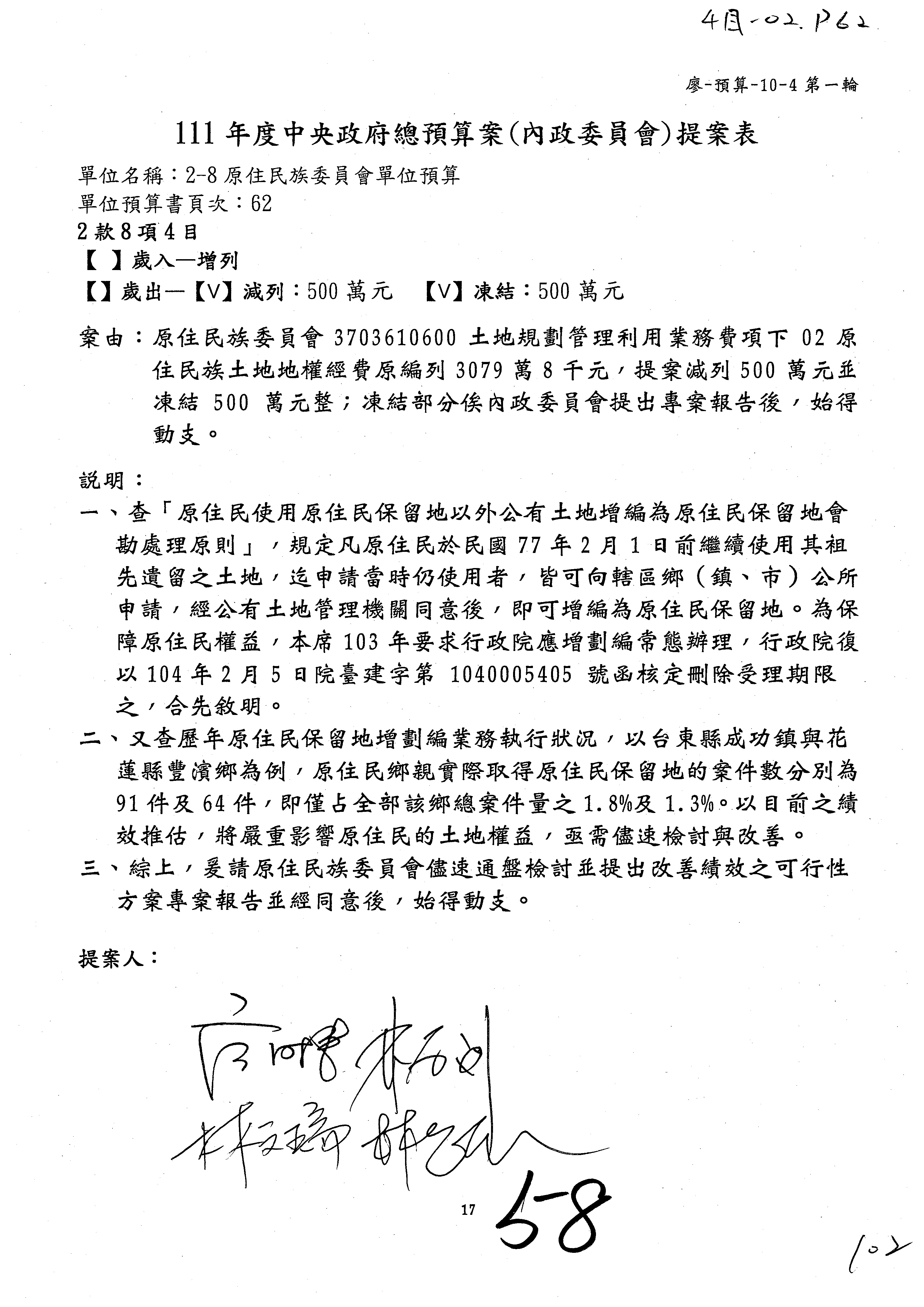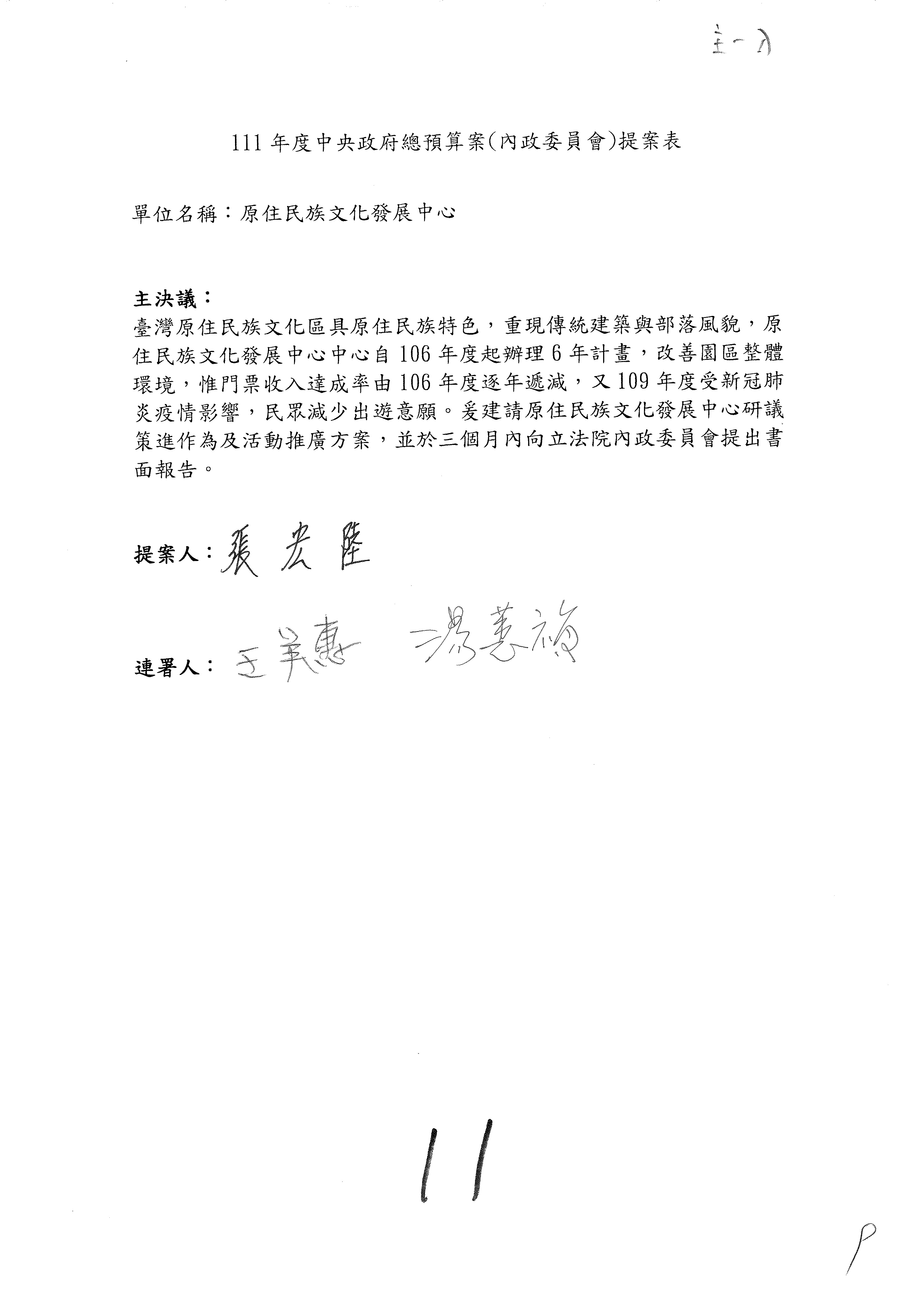 主席:好,跟大家先宣告一下,110年度中央政府總預算案關於原住民族委員會、原住民族文化發展中心預算,詢答的部分已經在110年12月1日完成,今天就直接進行預算之處理。