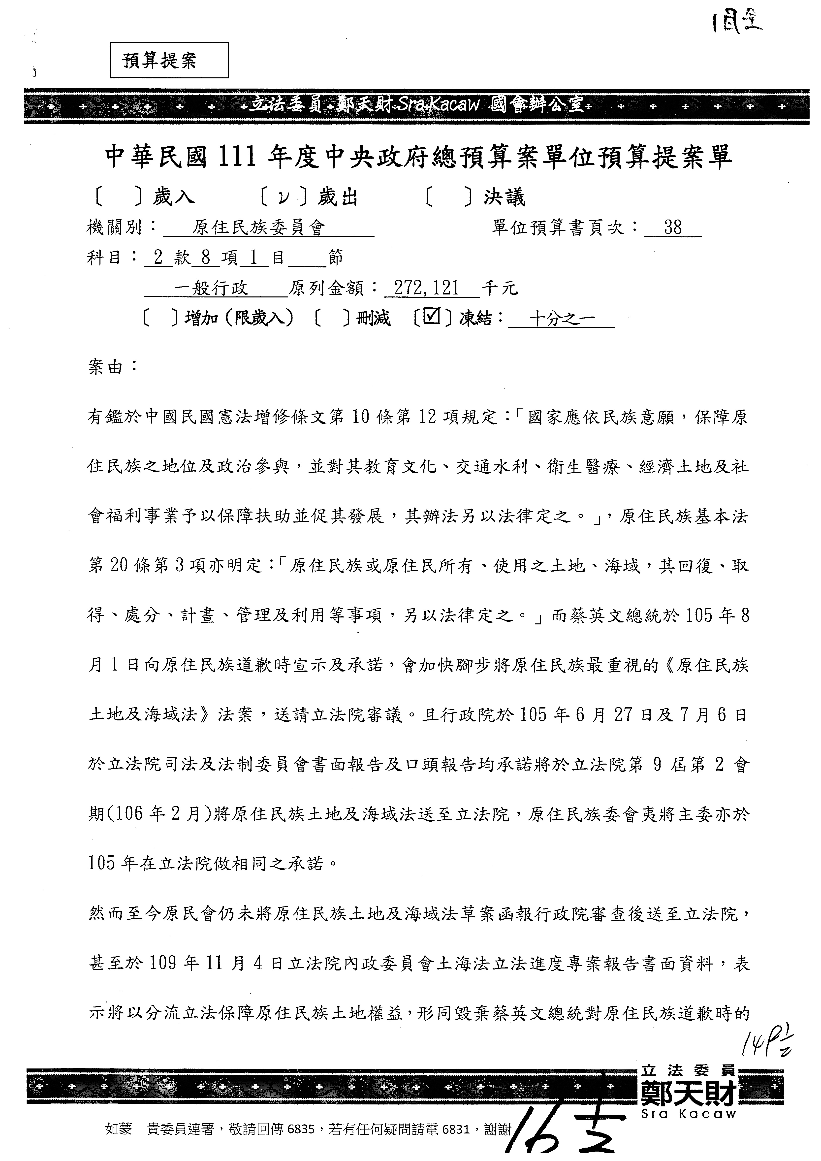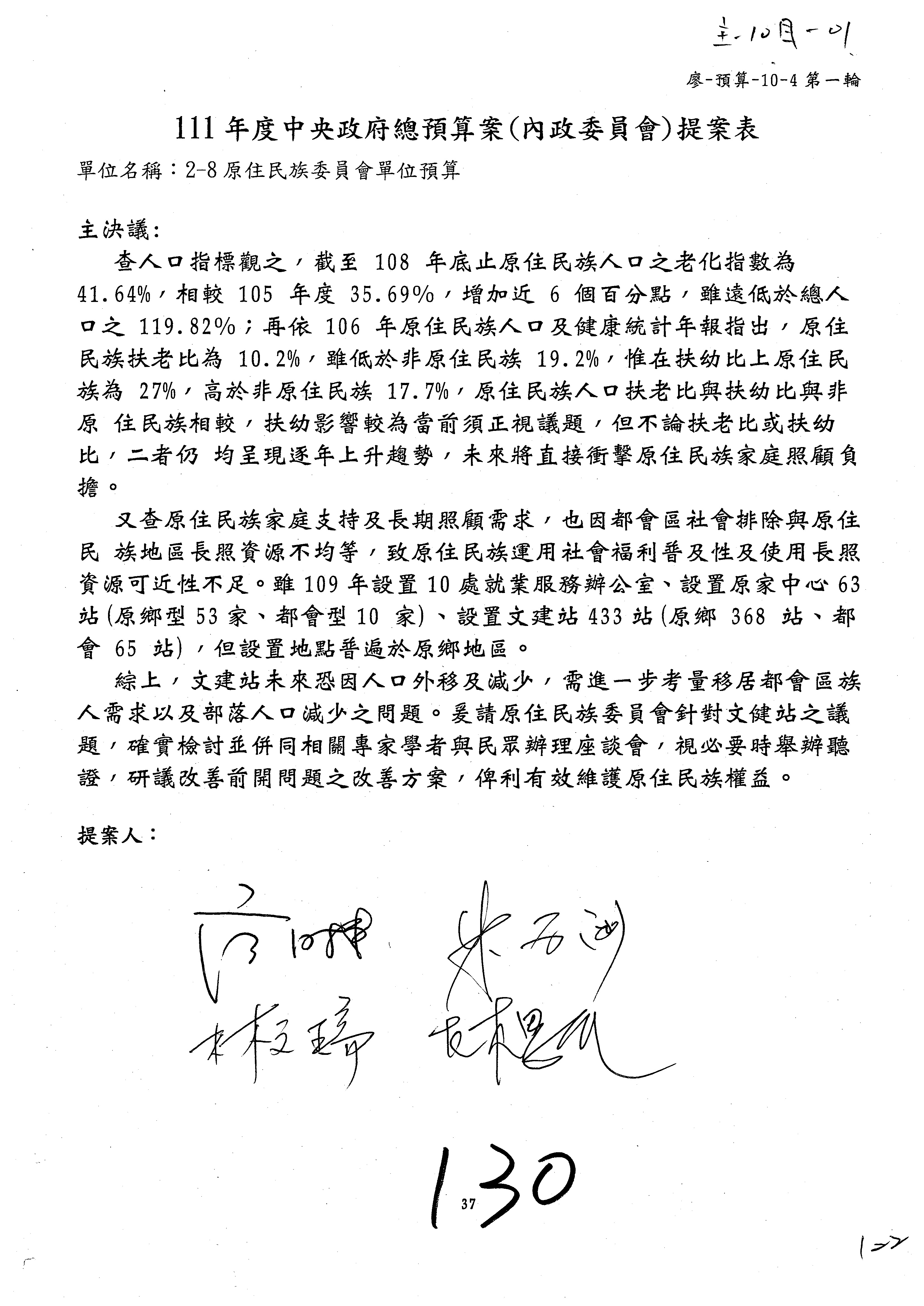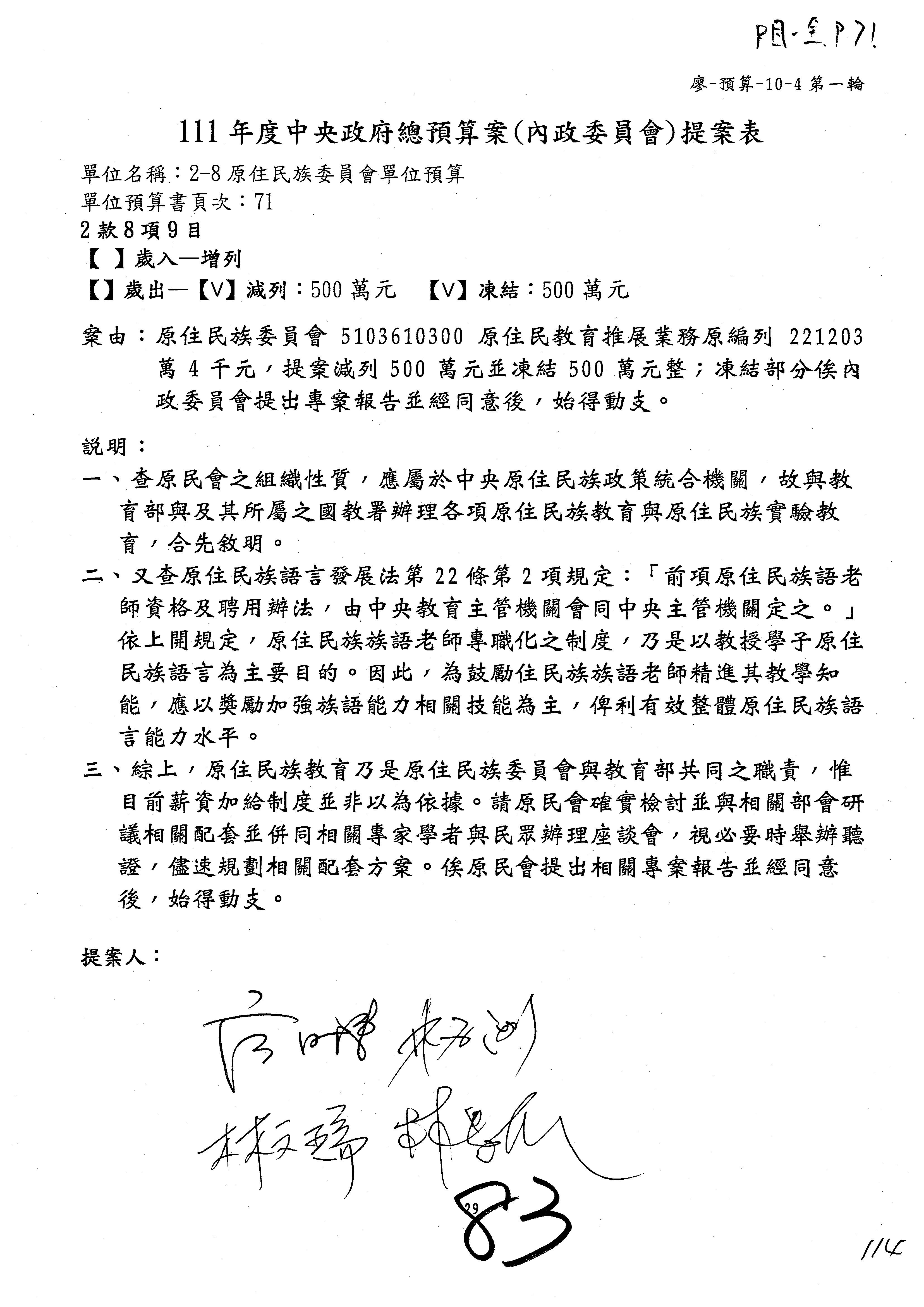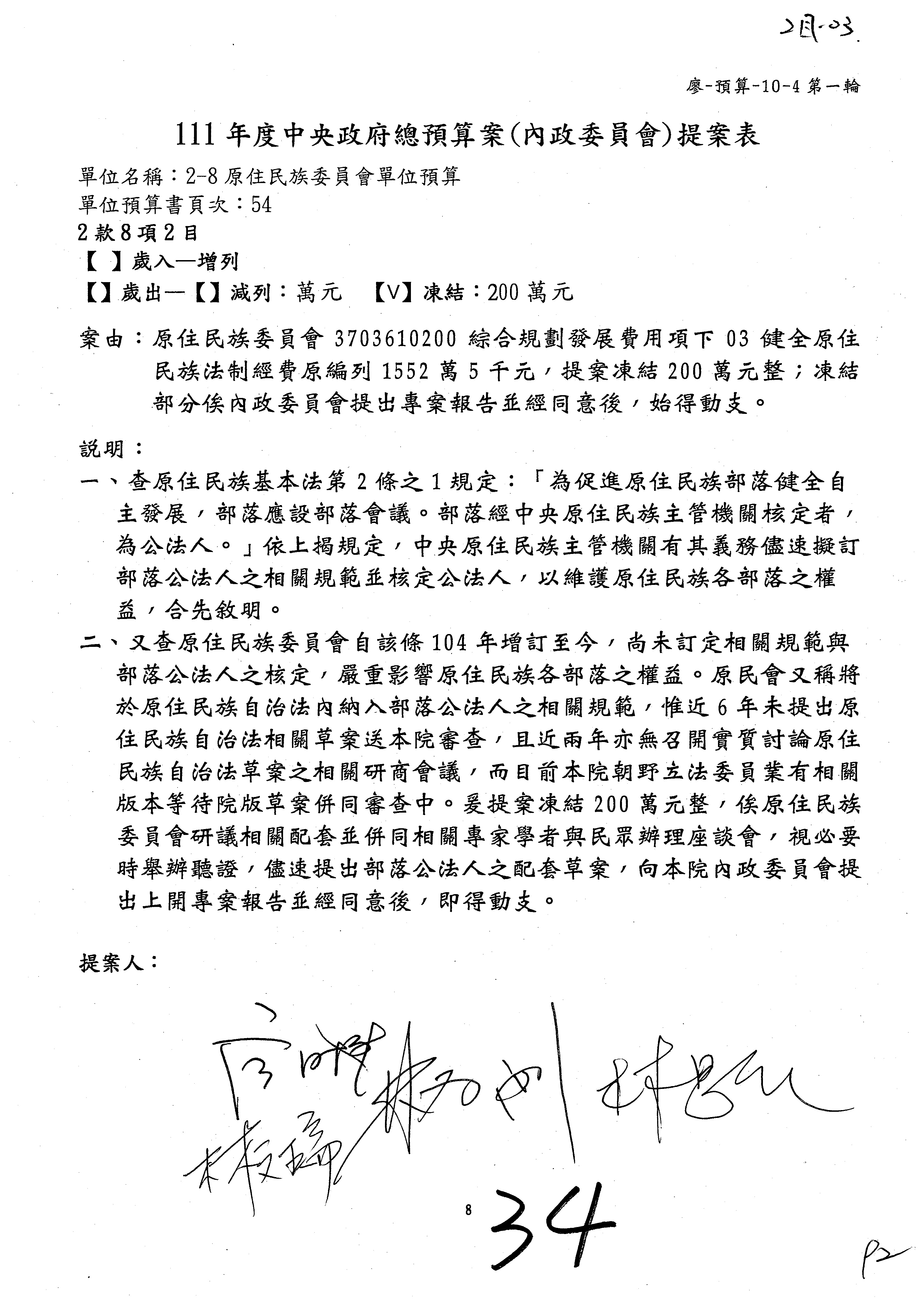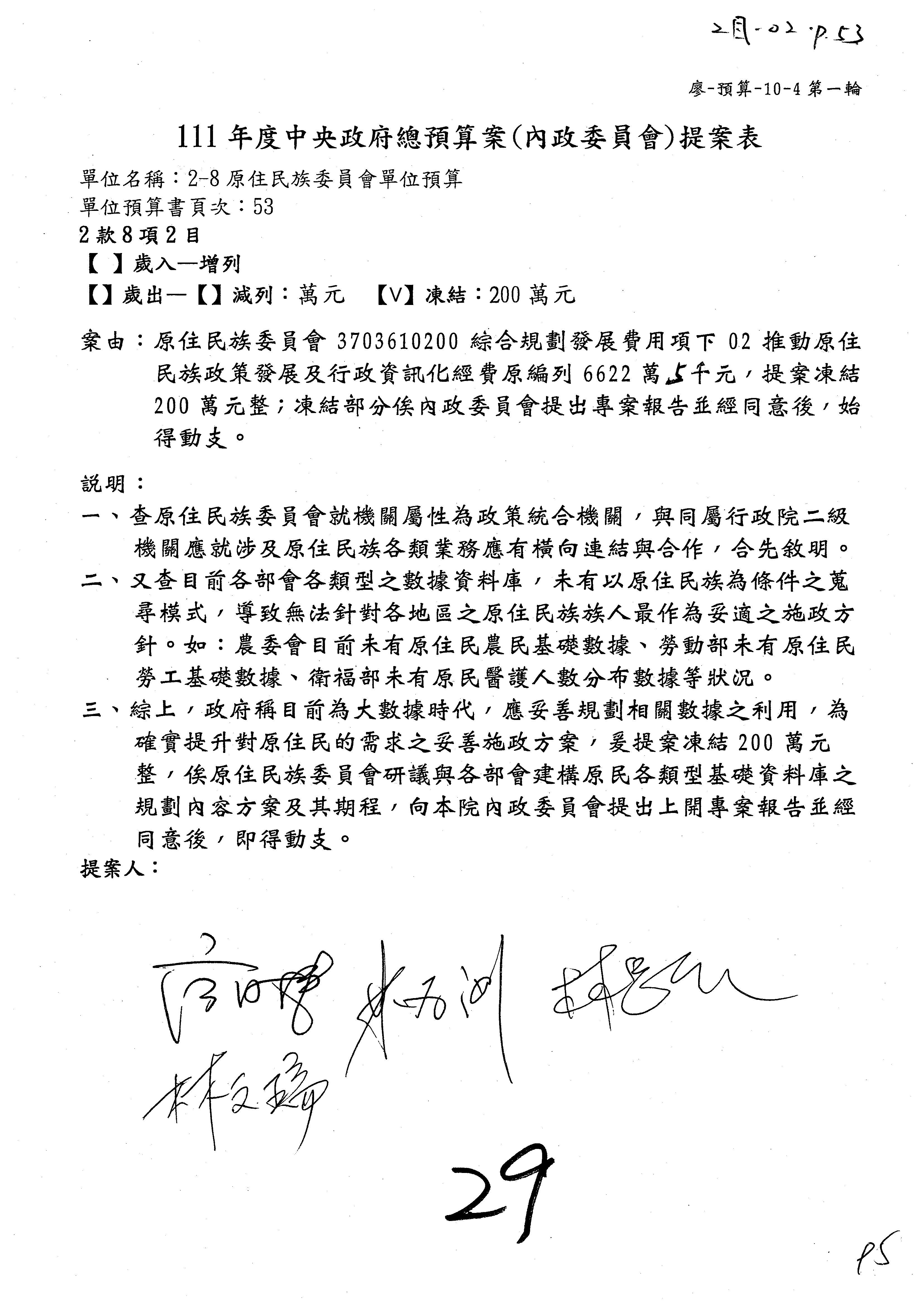 主席:好,跟大家先宣告一下,110年度中央政府總預算案關於原住民族委員會、原住民族文化發展中心預算,詢答的部分已經在110年12月1日完成,今天就直接進行預算之處理。