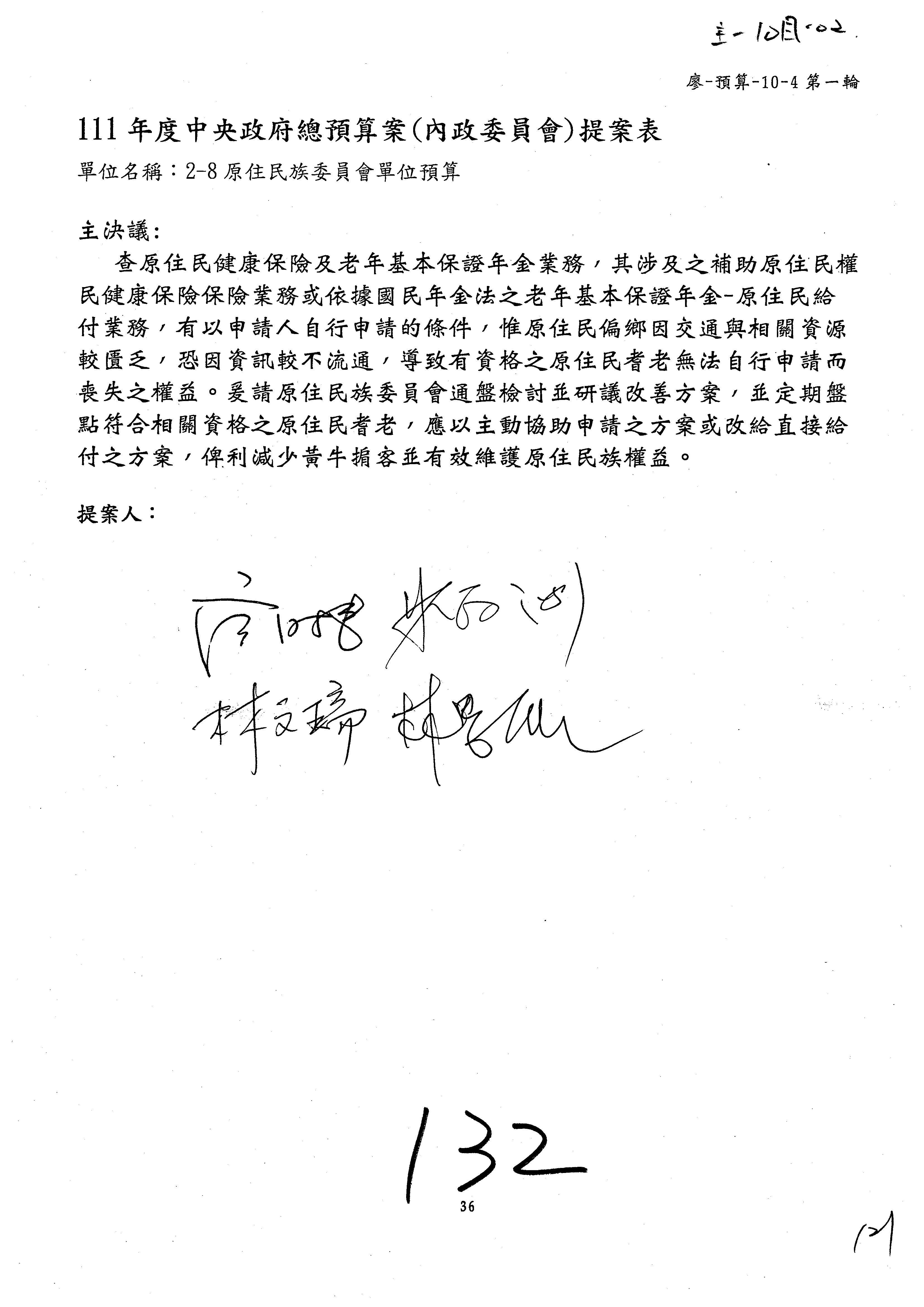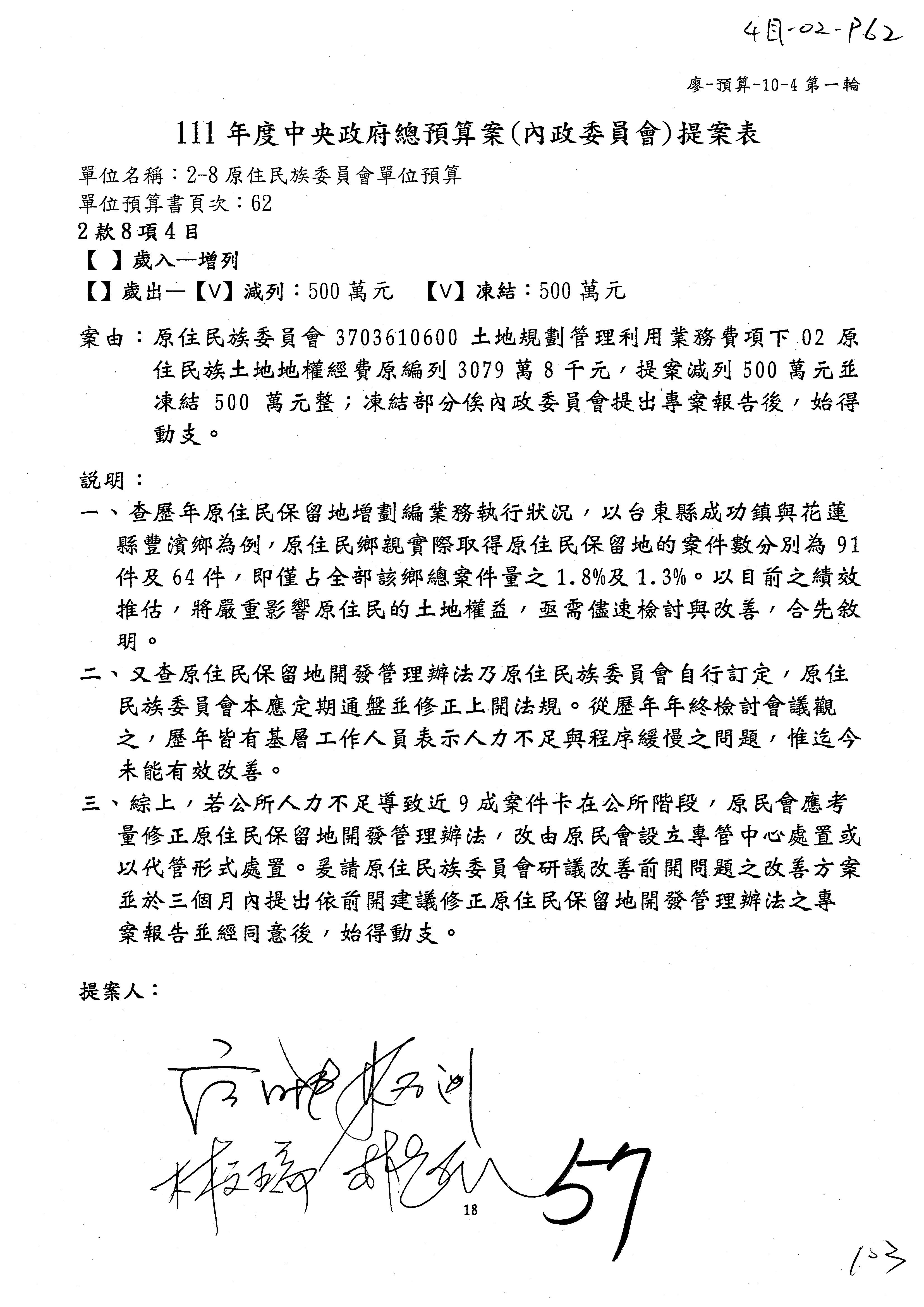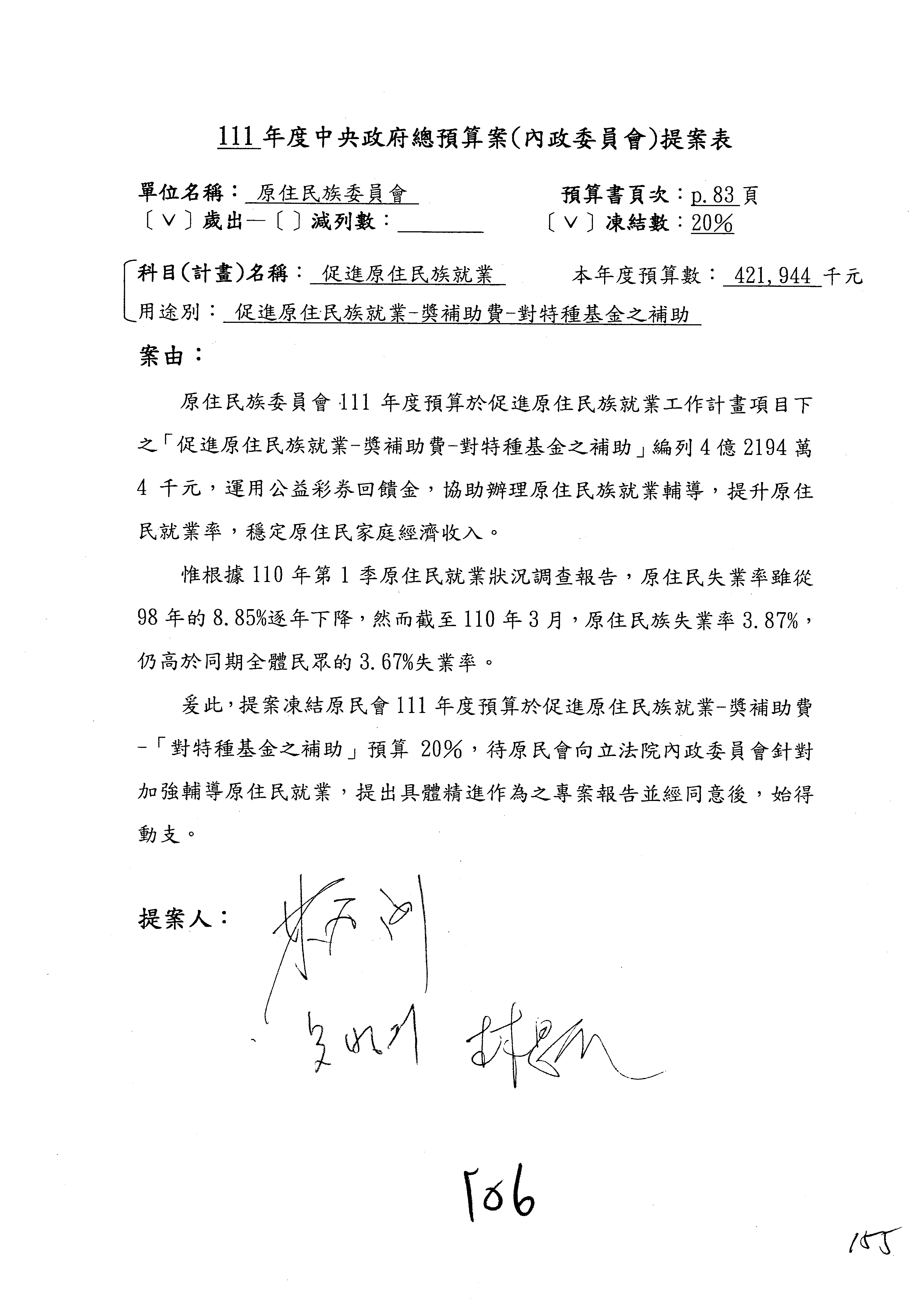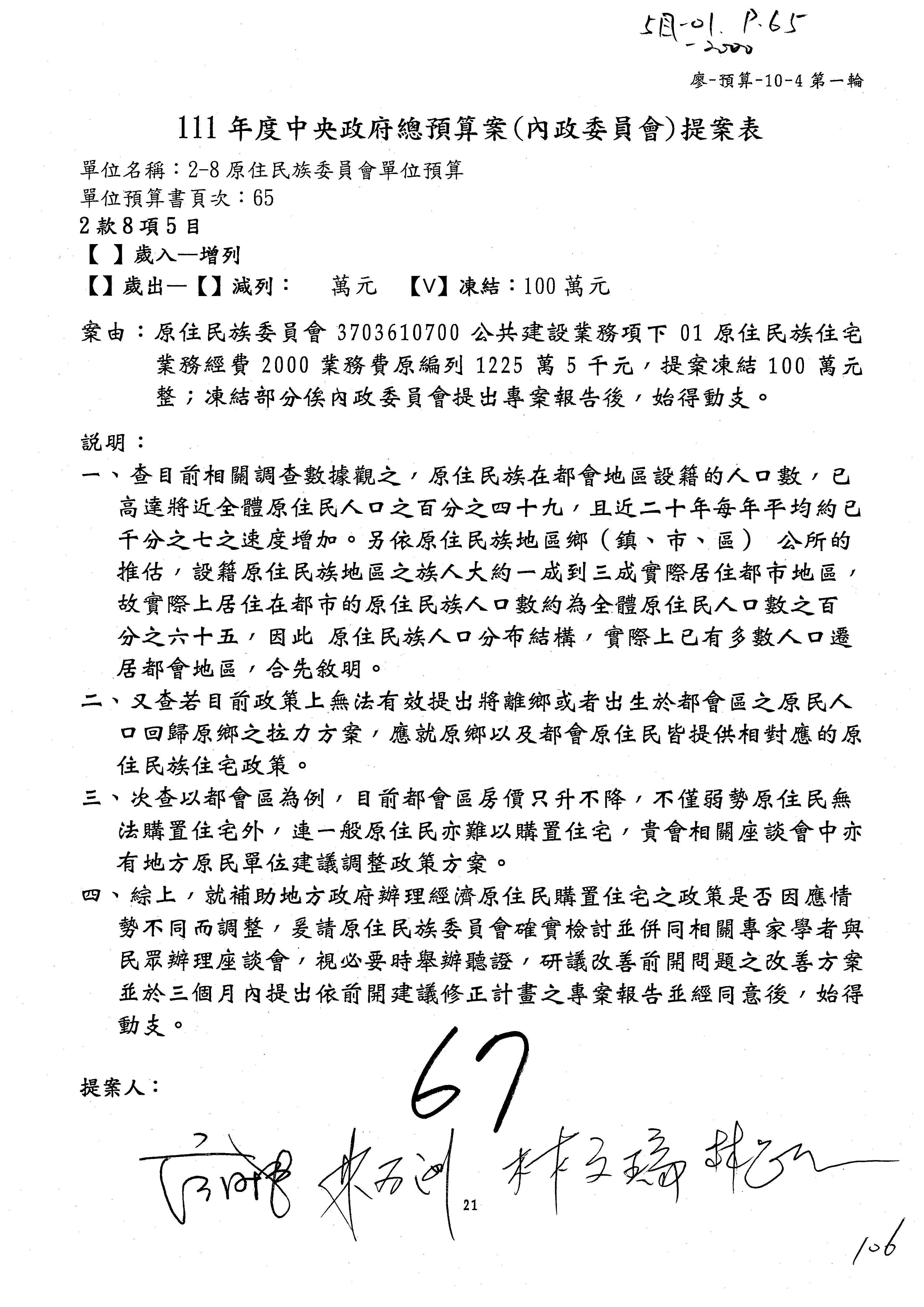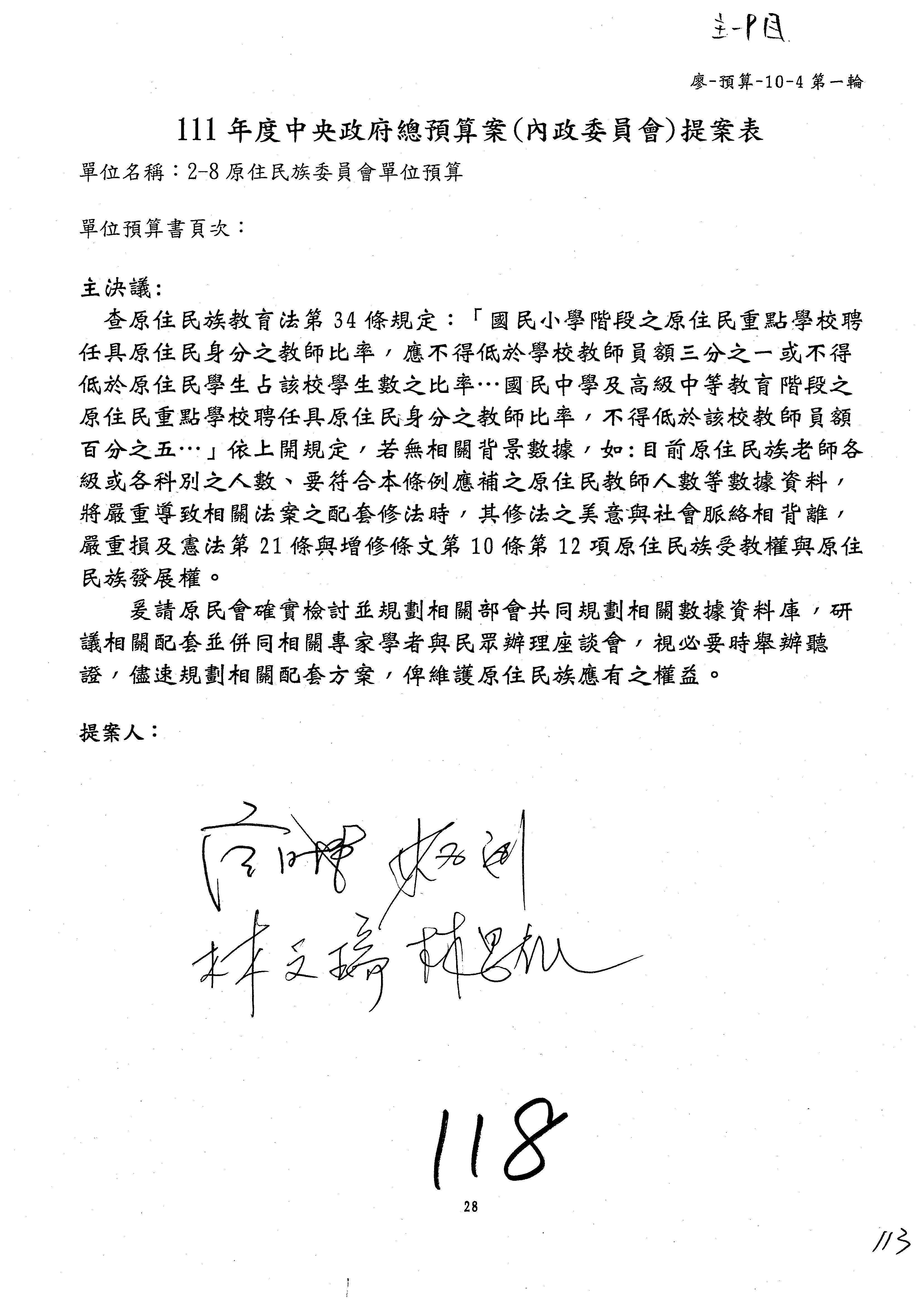 主席:好,跟大家先宣告一下,110年度中央政府總預算案關於原住民族委員會、原住民族文化發展中心預算,詢答的部分已經在110年12月1日完成,今天就直接進行預算之處理。