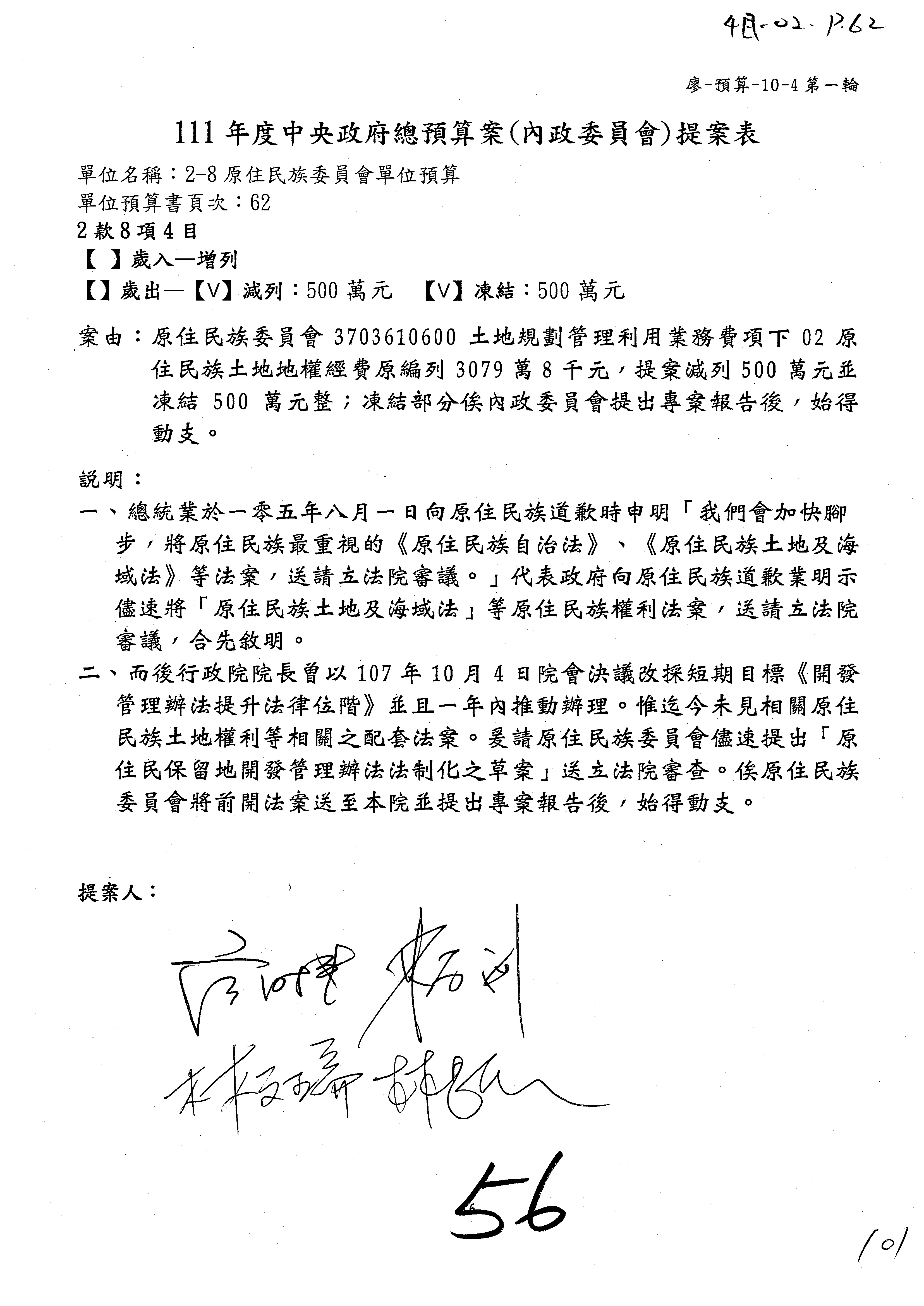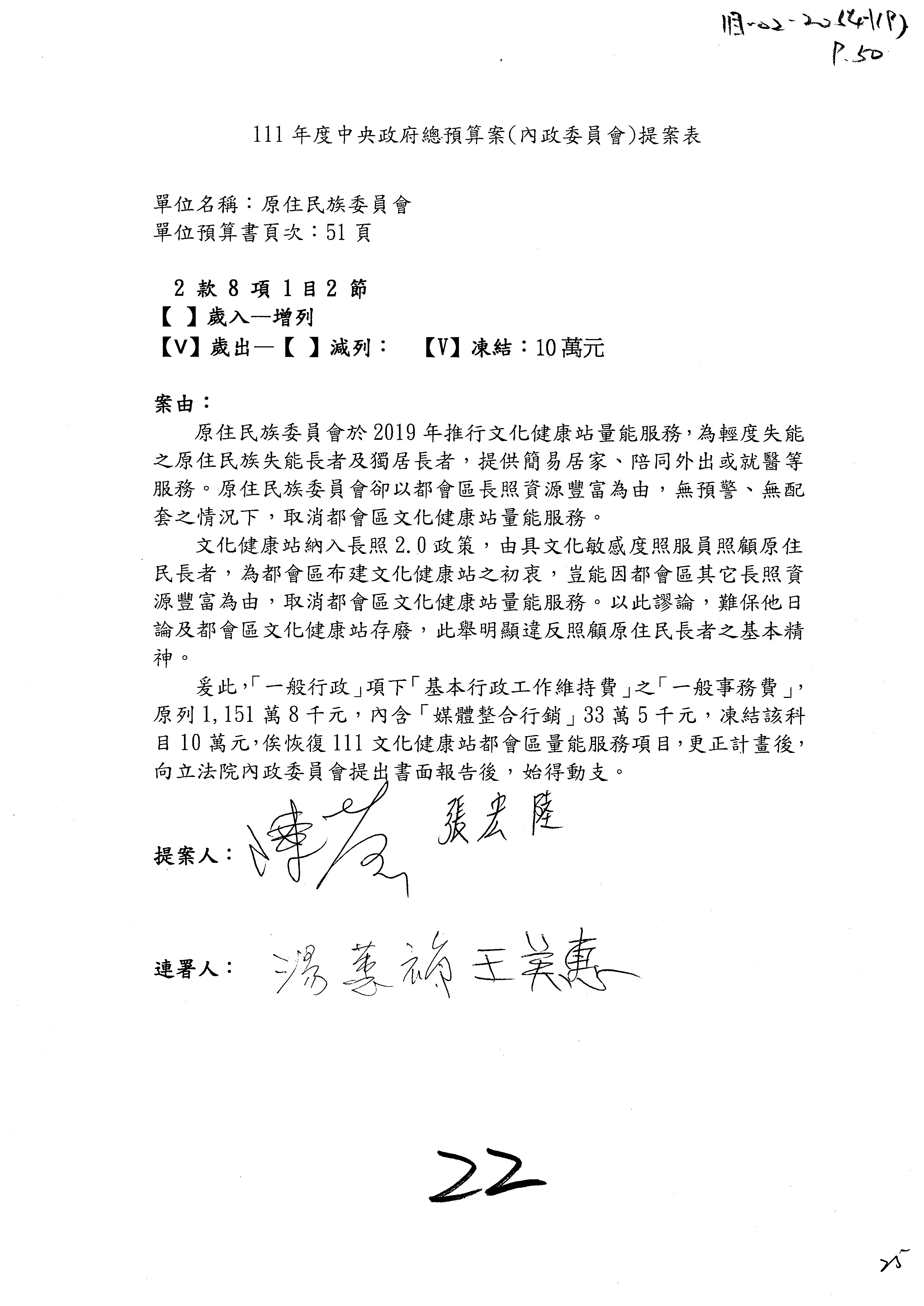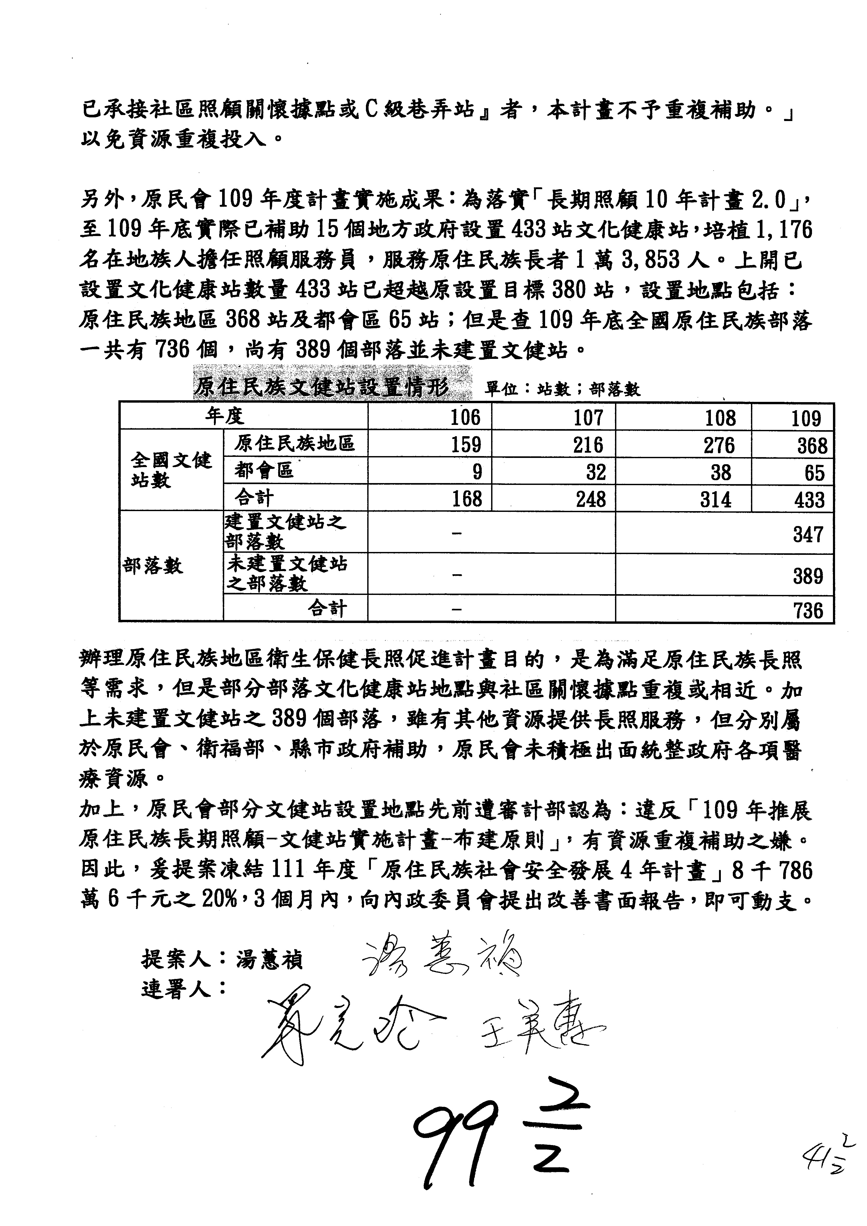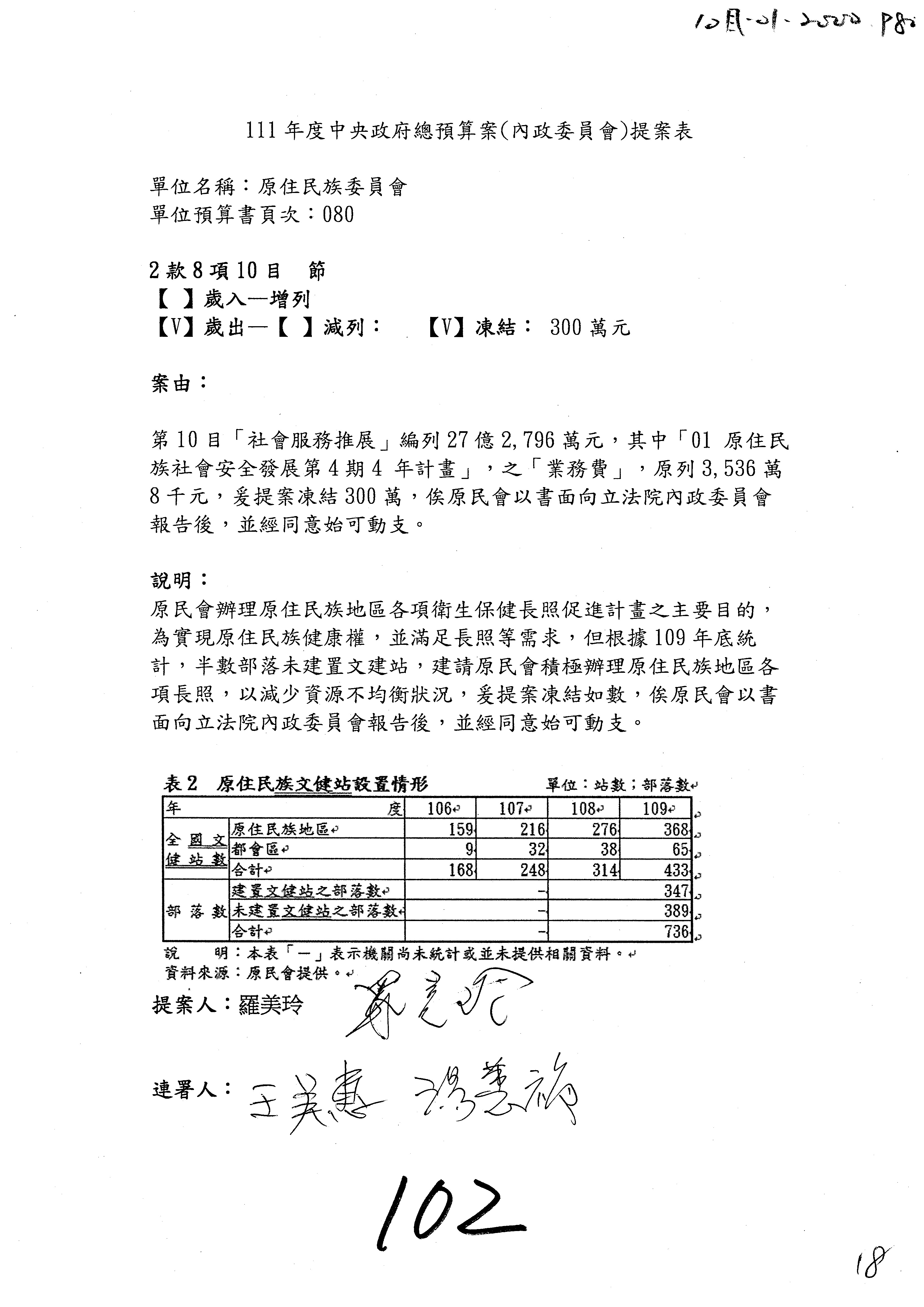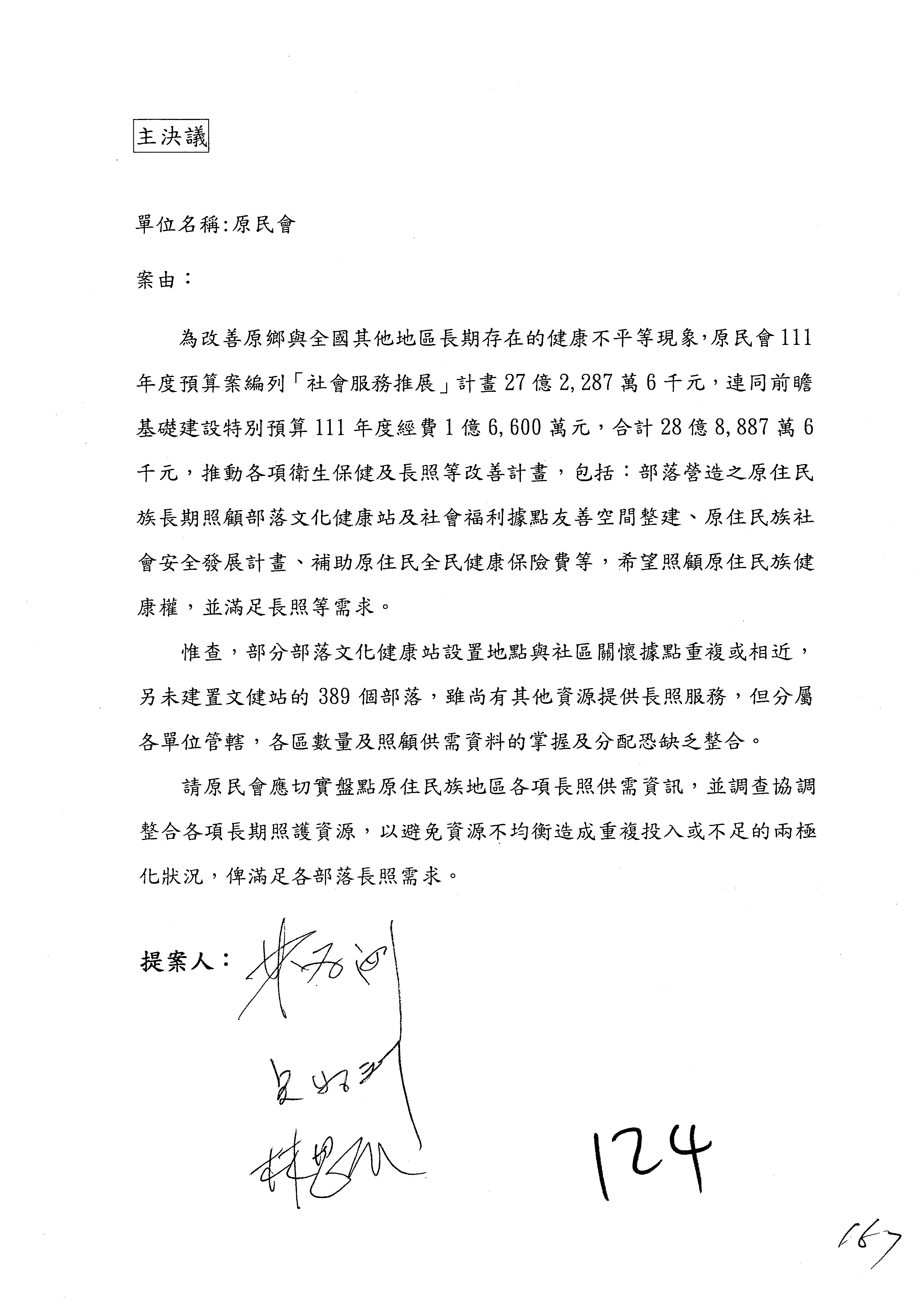 主席:好,跟大家先宣告一下,110年度中央政府總預算案關於原住民族委員會、原住民族文化發展中心預算,詢答的部分已經在110年12月1日完成,今天就直接進行預算之處理。